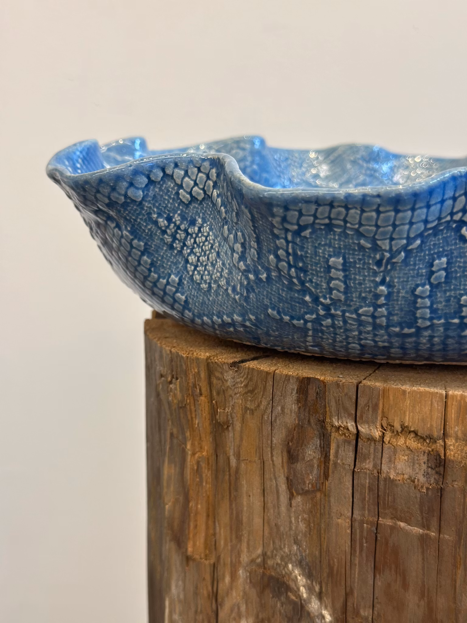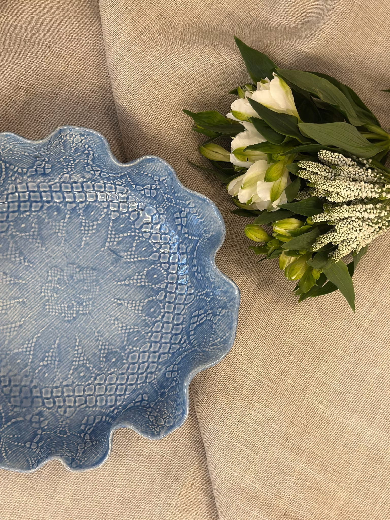 Medium fat med avtrykk fra en duk med en sentrert blomsterfarm inni! Utenpå er det mønster fra en gammel duk.