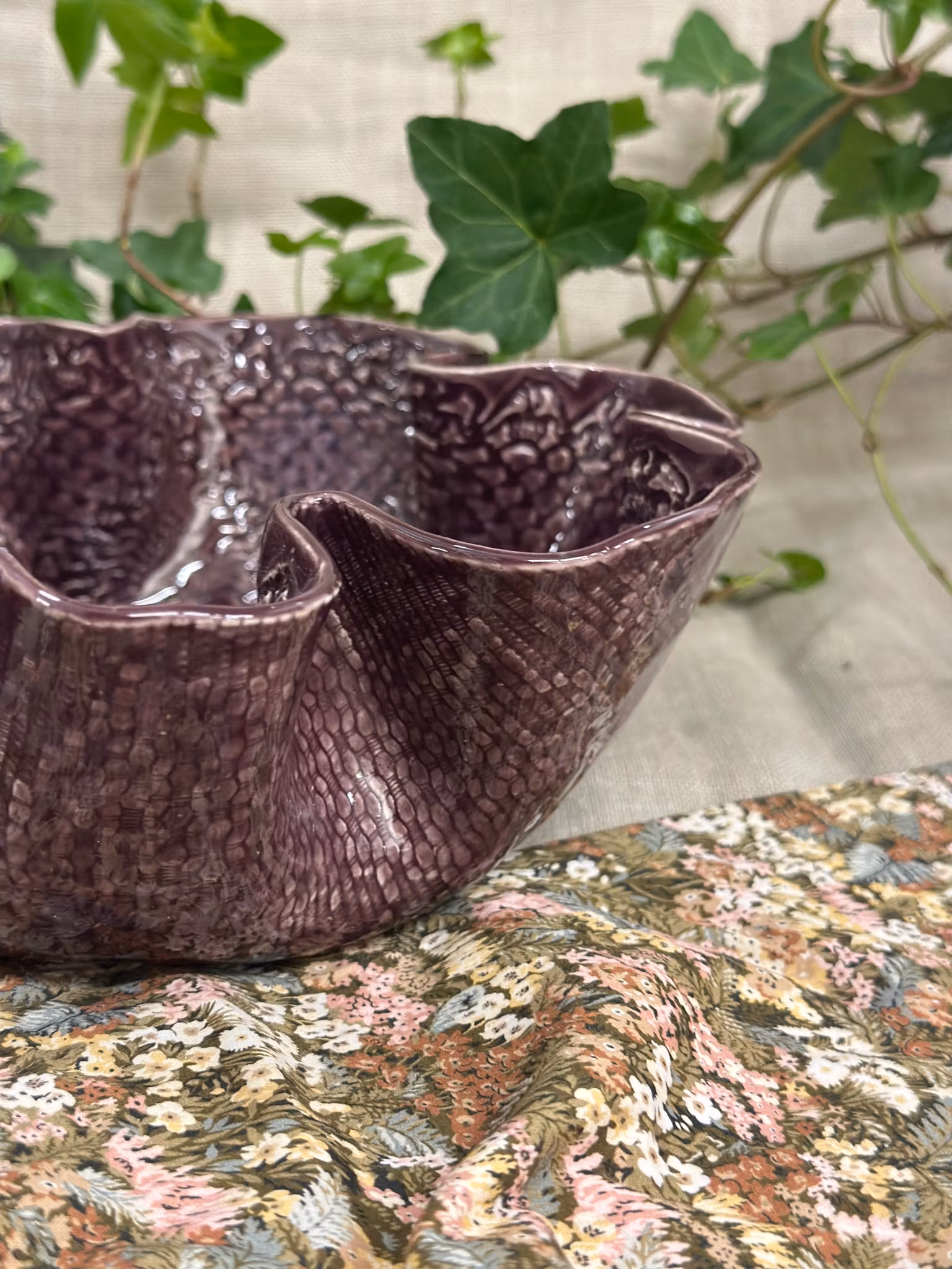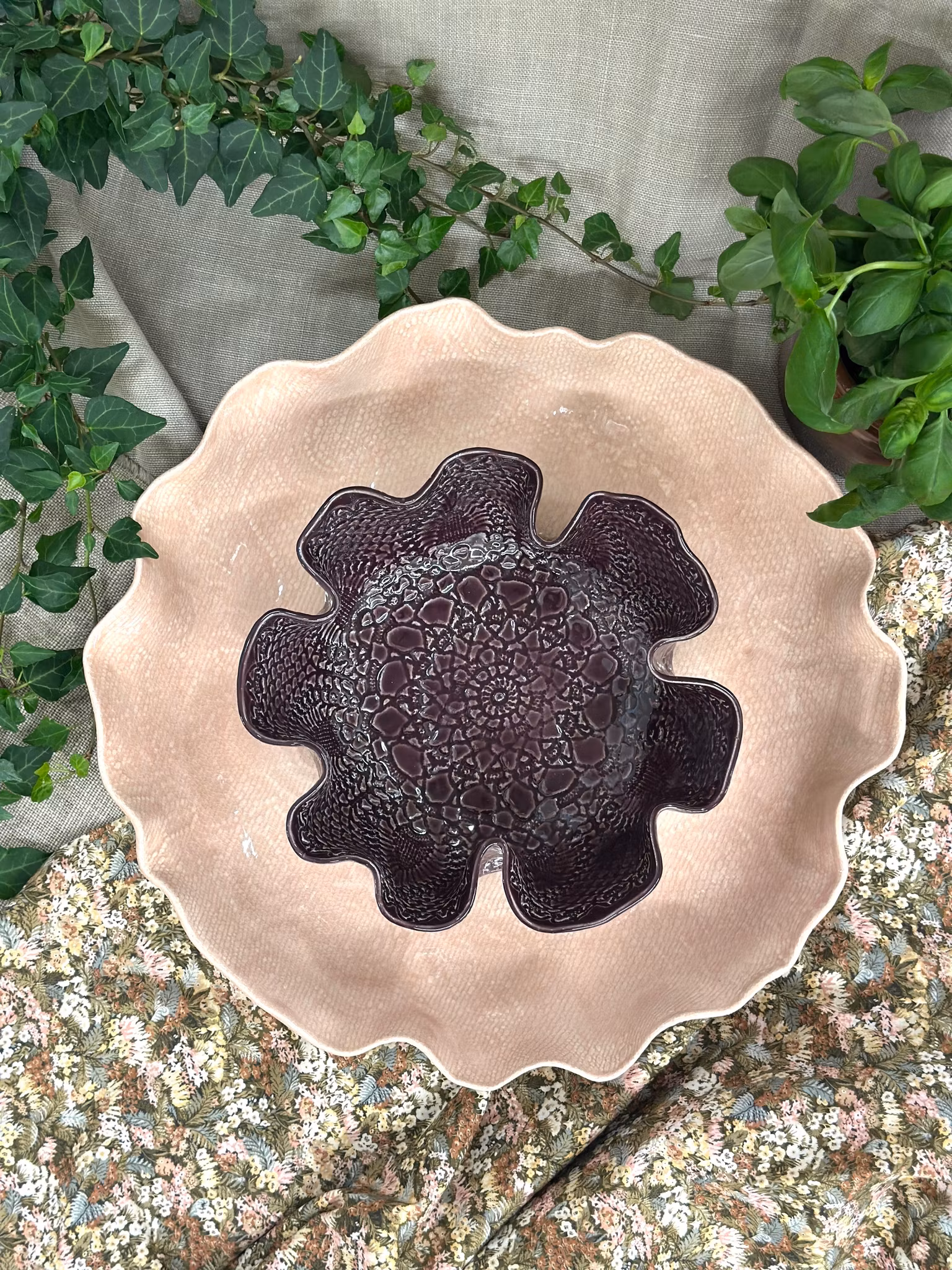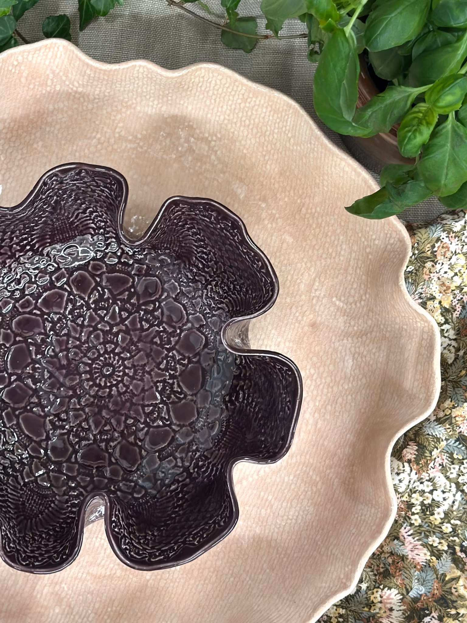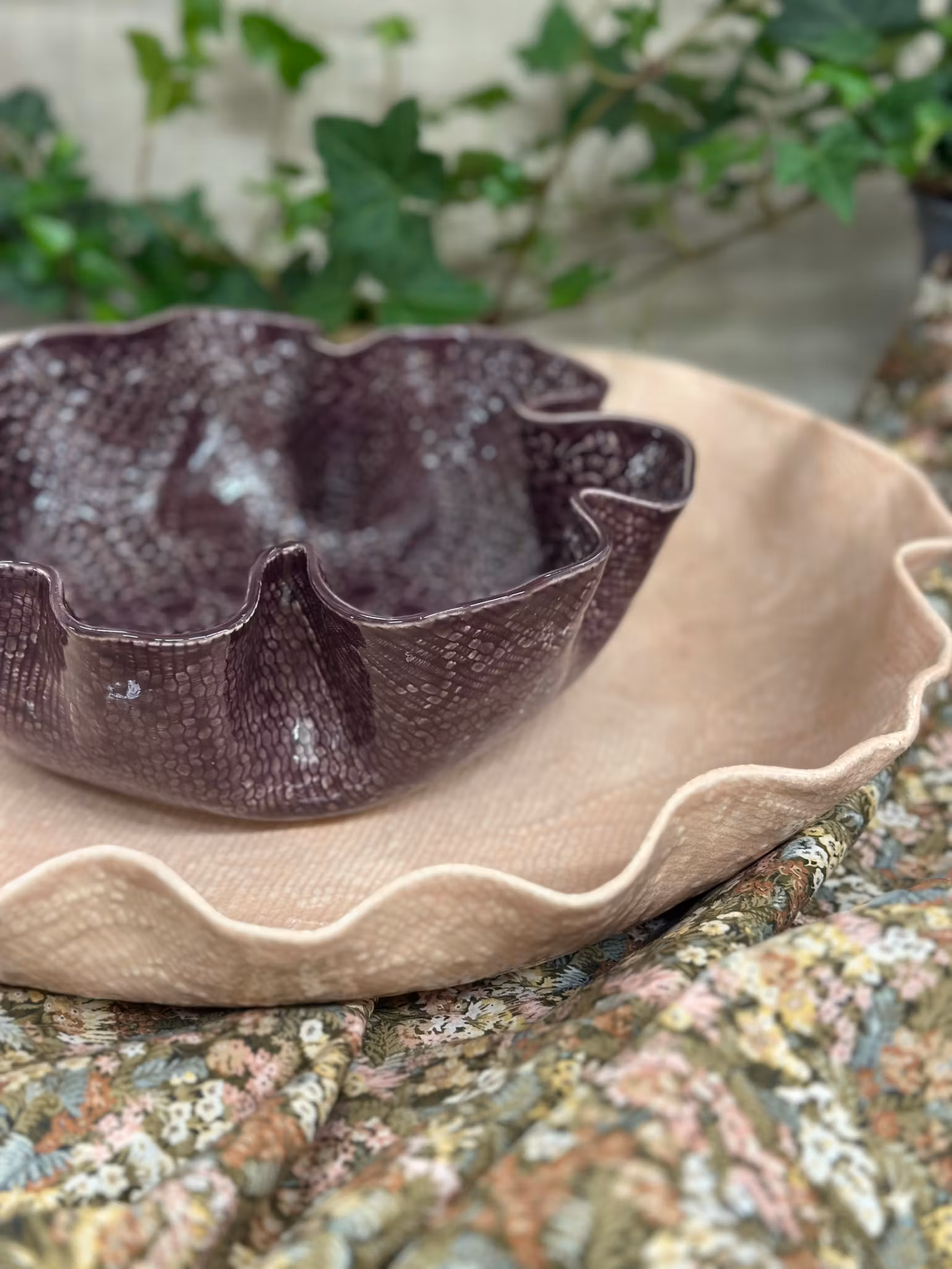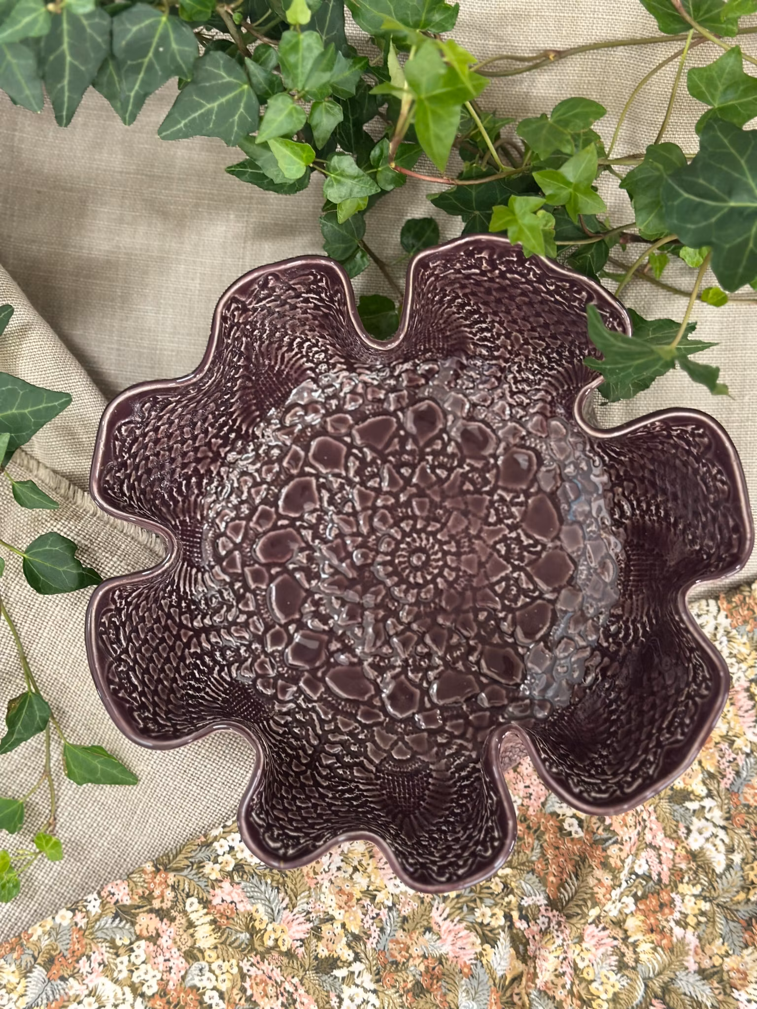 En litt mindre skål eller bolle med avtrykk av en heklet duk sentrert inni. Utenpå er det avtrykk av en gammel gardin.
