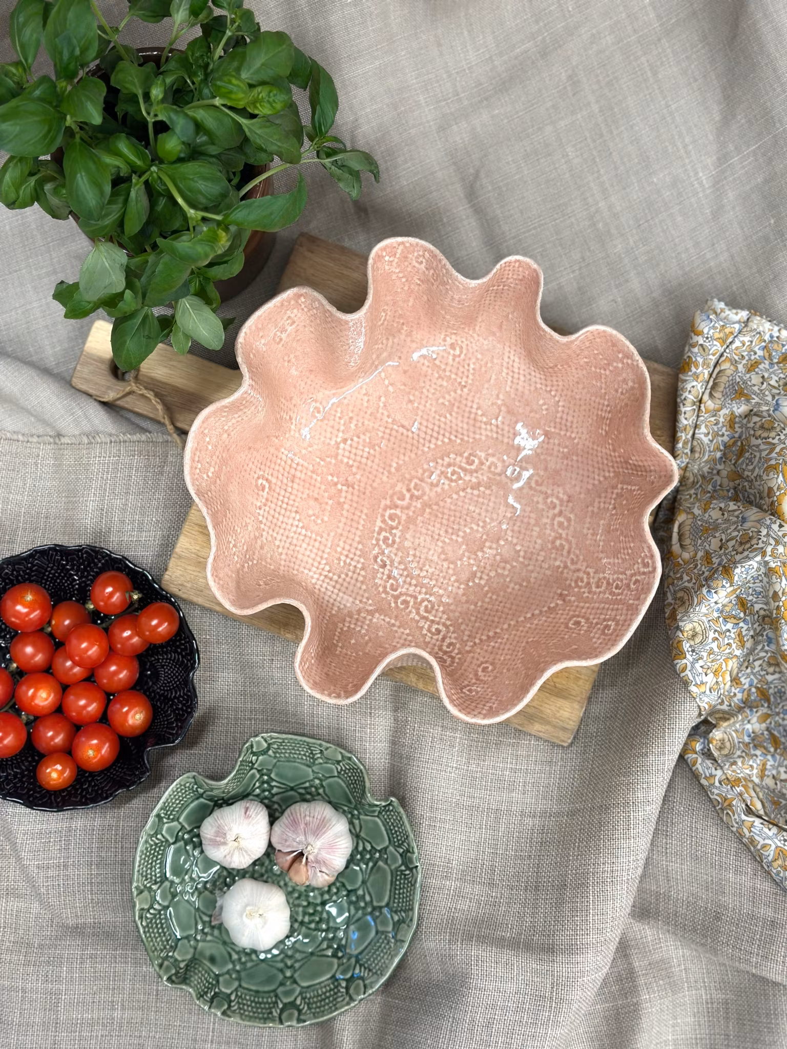 Medium skål eller bolle med avtrykk av en heklet duk avtrykket blir litt mer abstrakt, men veldig fint mønster samme avtrykk utenpå.