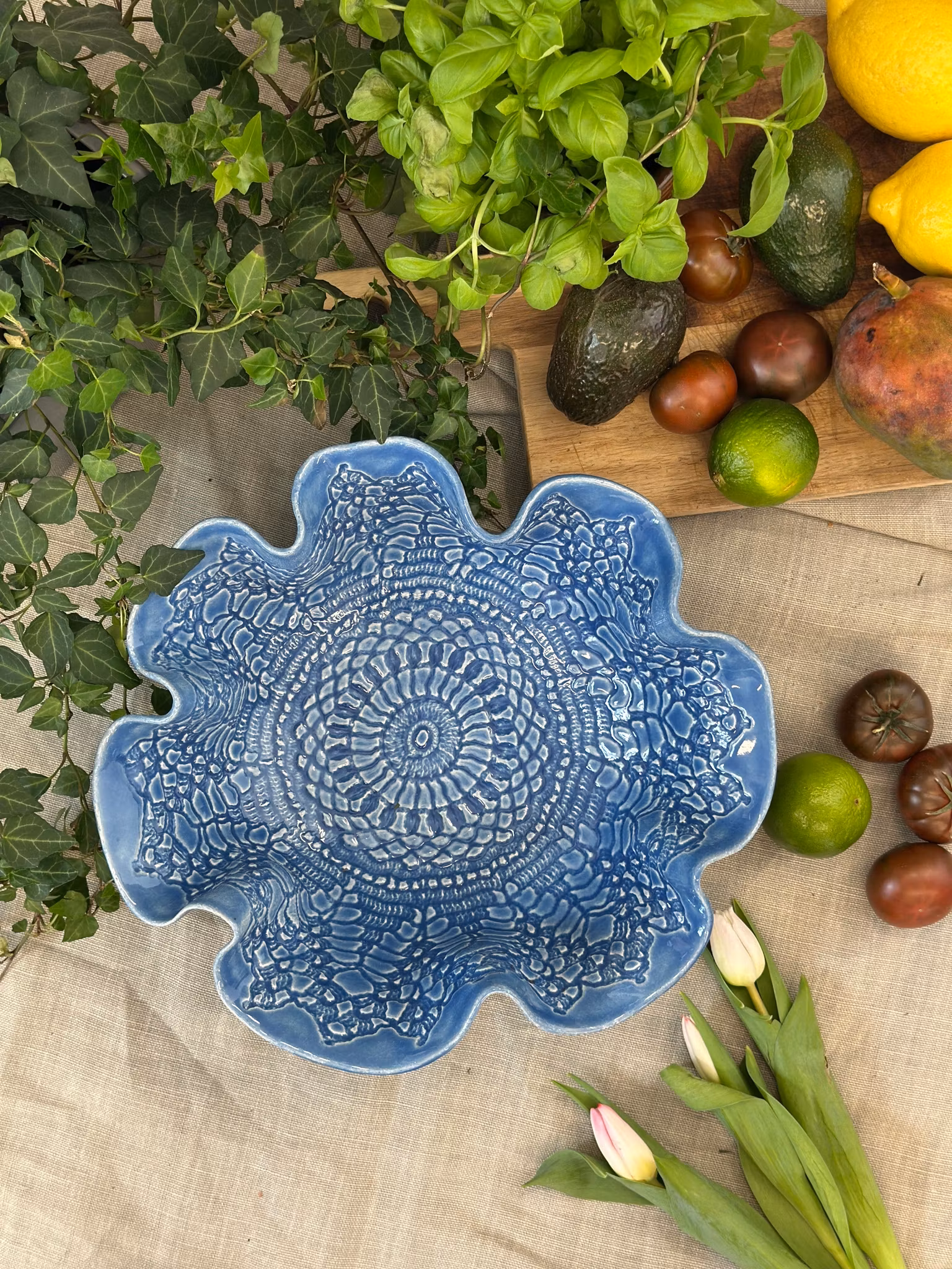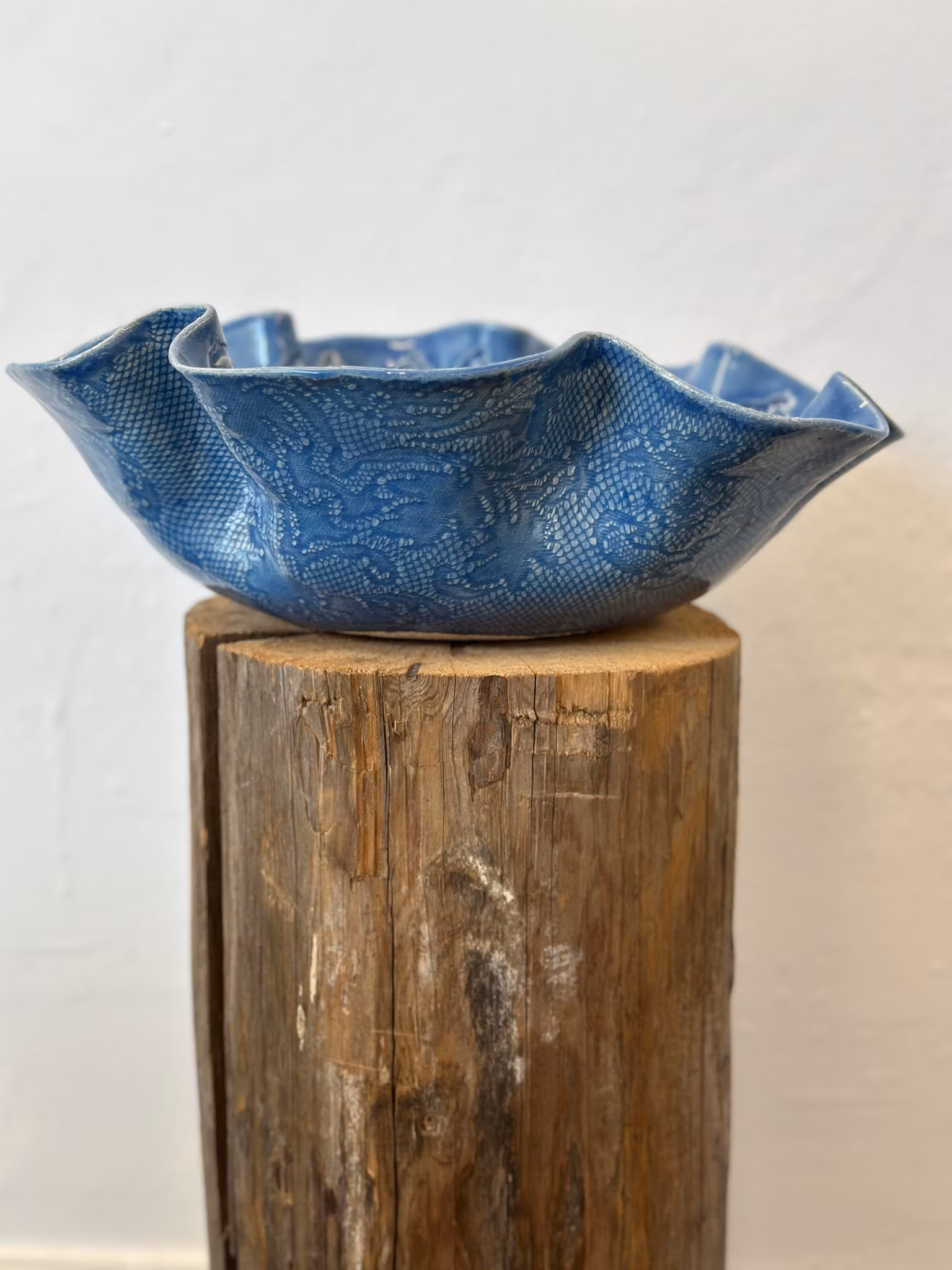 Vakker blåfarge i en bolle med høy kant. Avtrykk fra hekleduk og du ser hele duken og en bitteliten råkant øverst. Utenpå er det avtrykk av en gammel gardin.