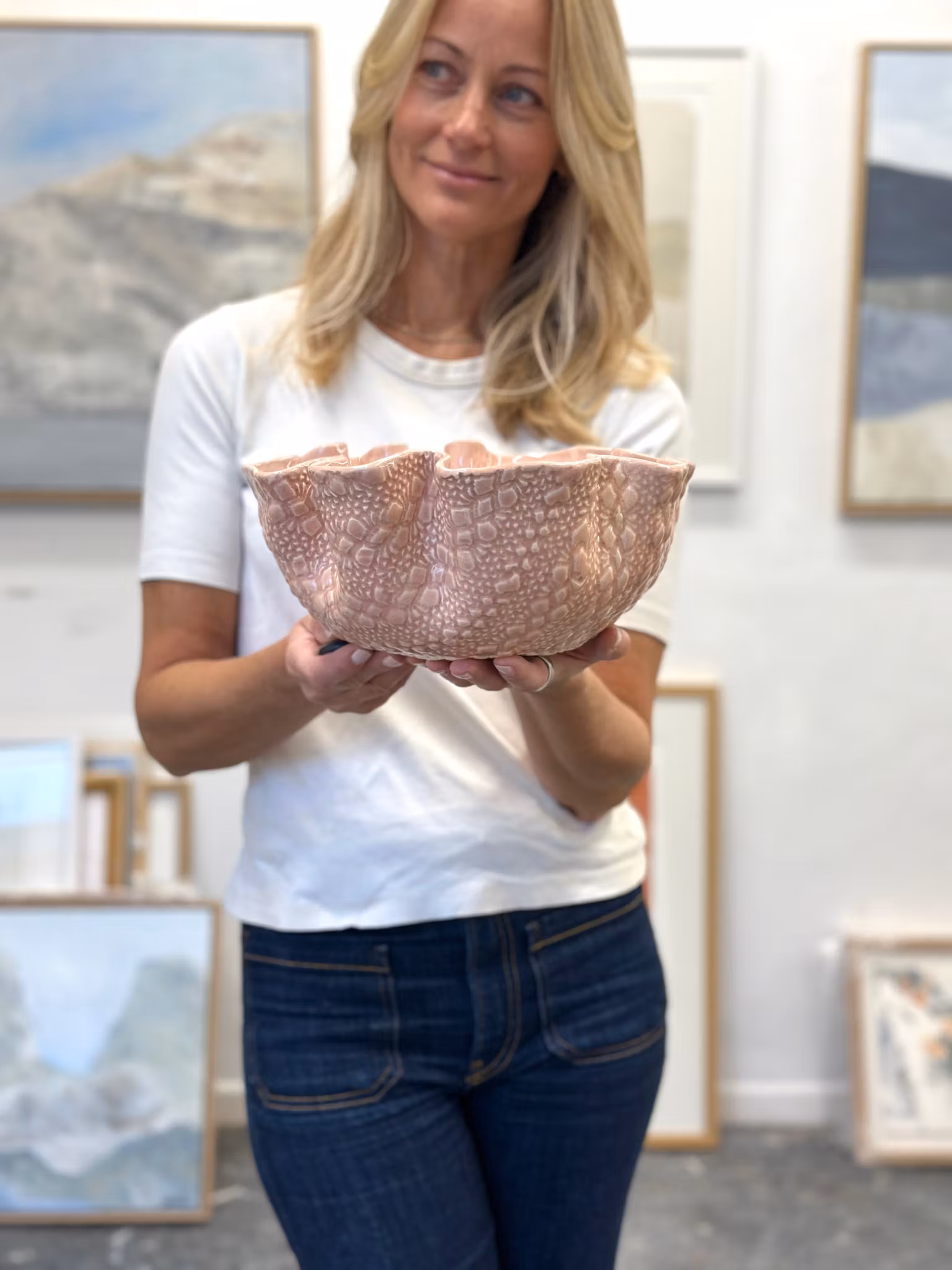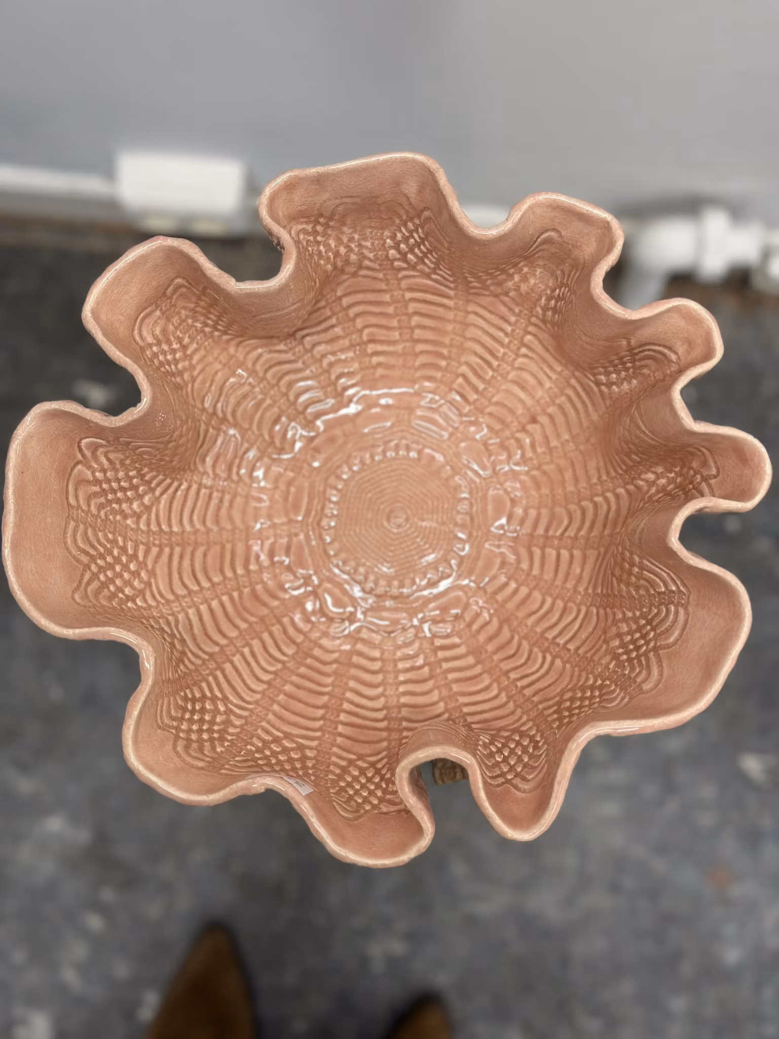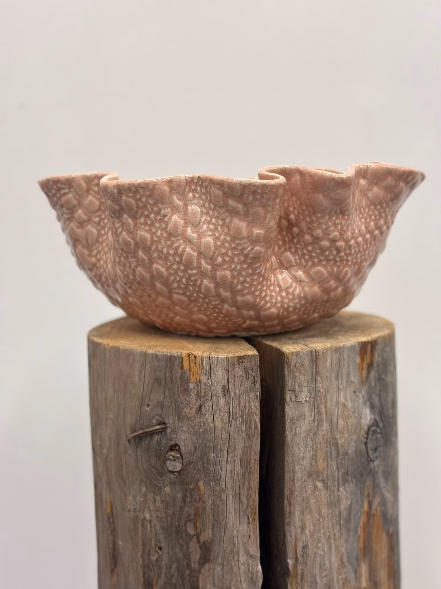 Medium størrelse bolle/skål med høy kant og ganske rette kanter. Mønsteret inni er et flott kontrast med de rette linjene mot de organiske formene i selve formen. Utenpå er det avtrykk av et sengeteppe.