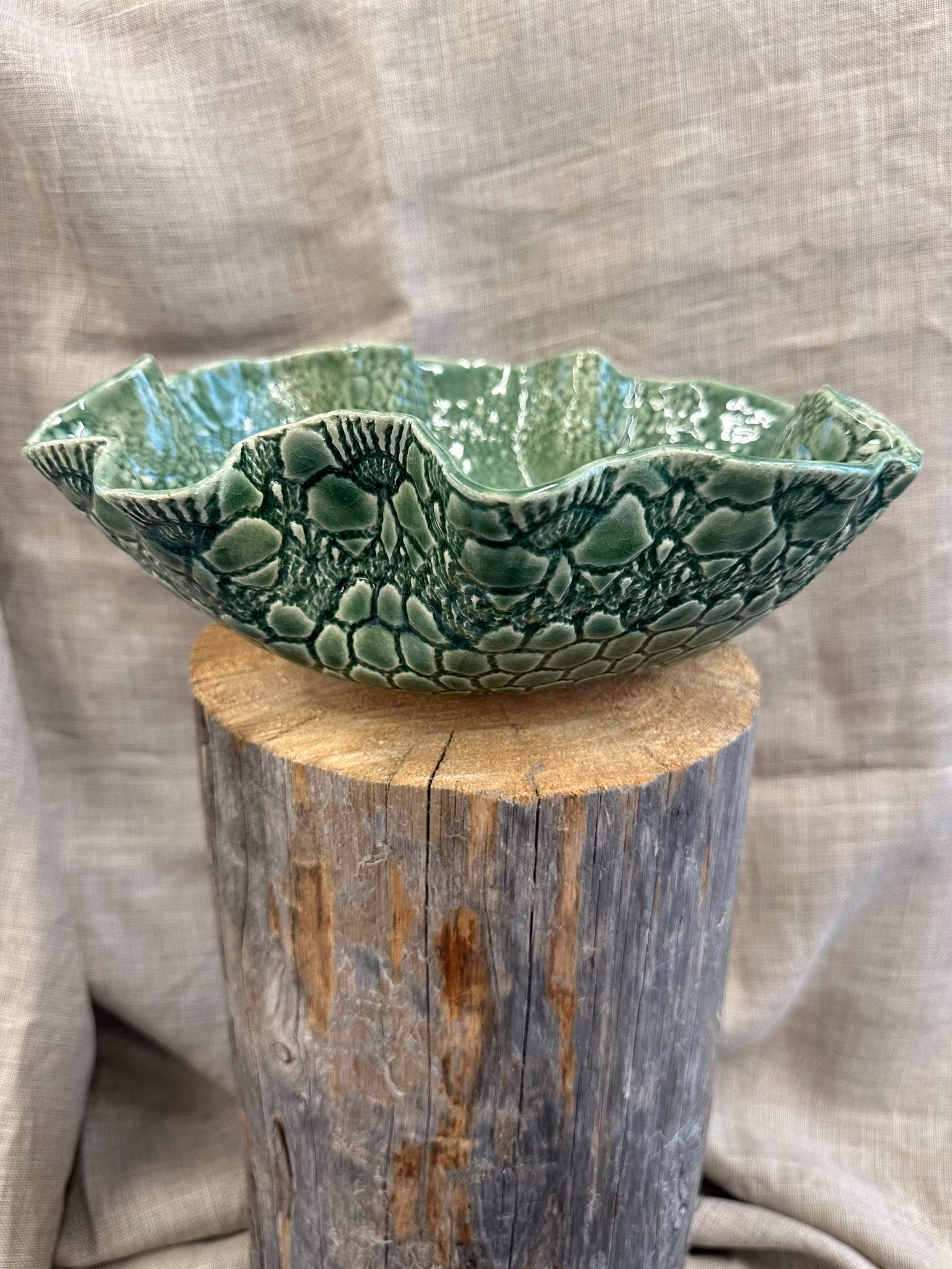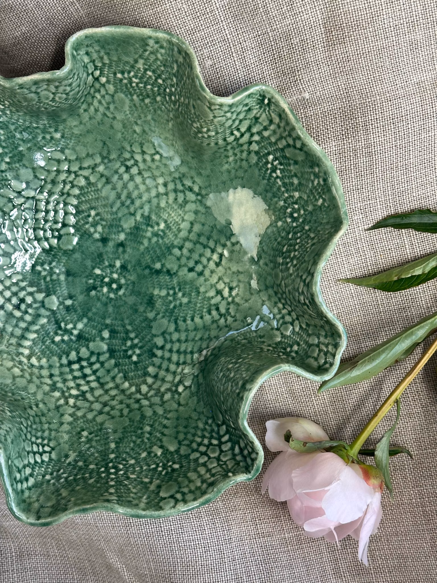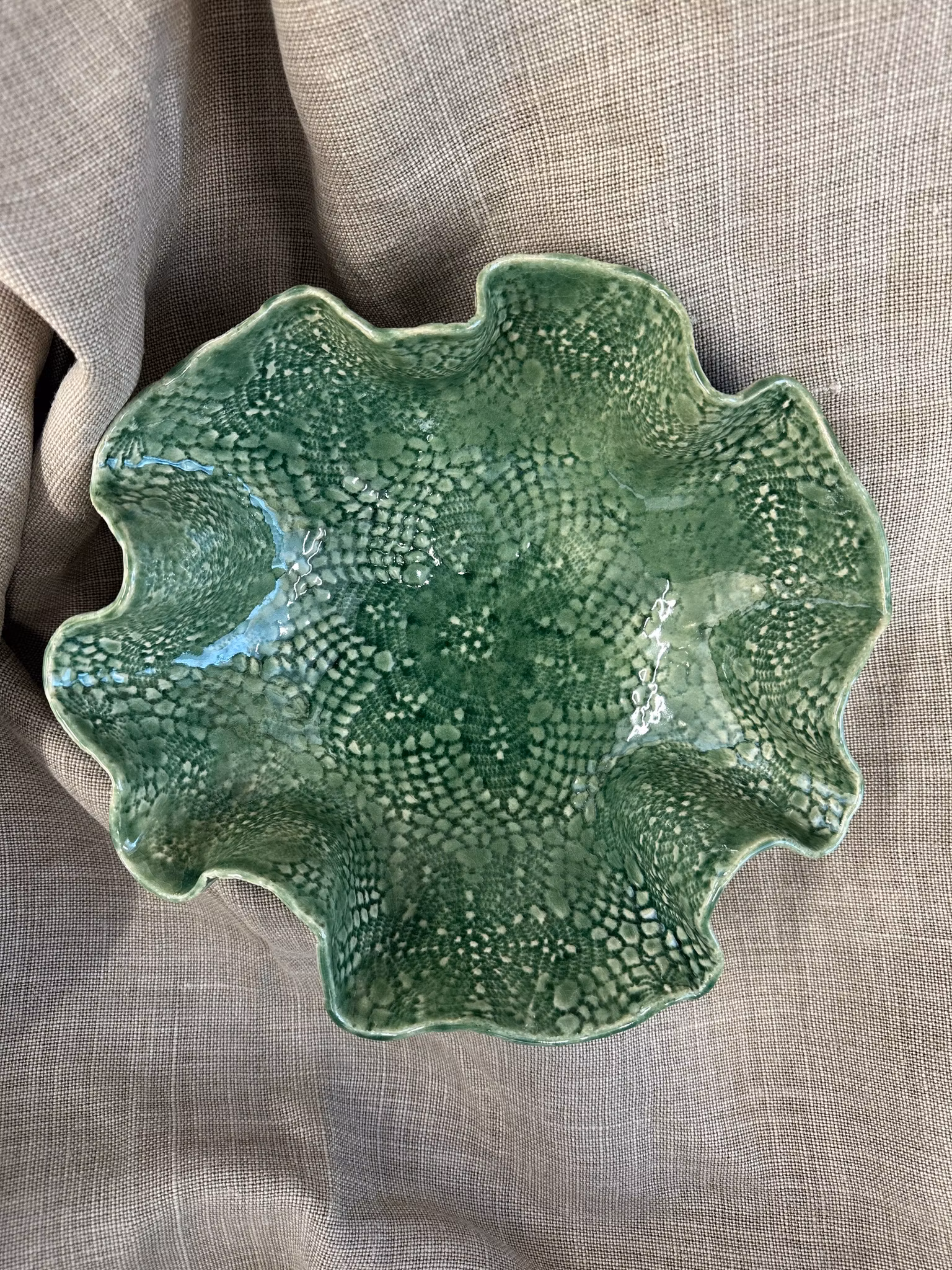 Vakker høy skål i jade-grønn med sentrert avtrykk av hekleduk inni og en annen duk utenpå. Veldig fin når du ser den også utenfra stående.