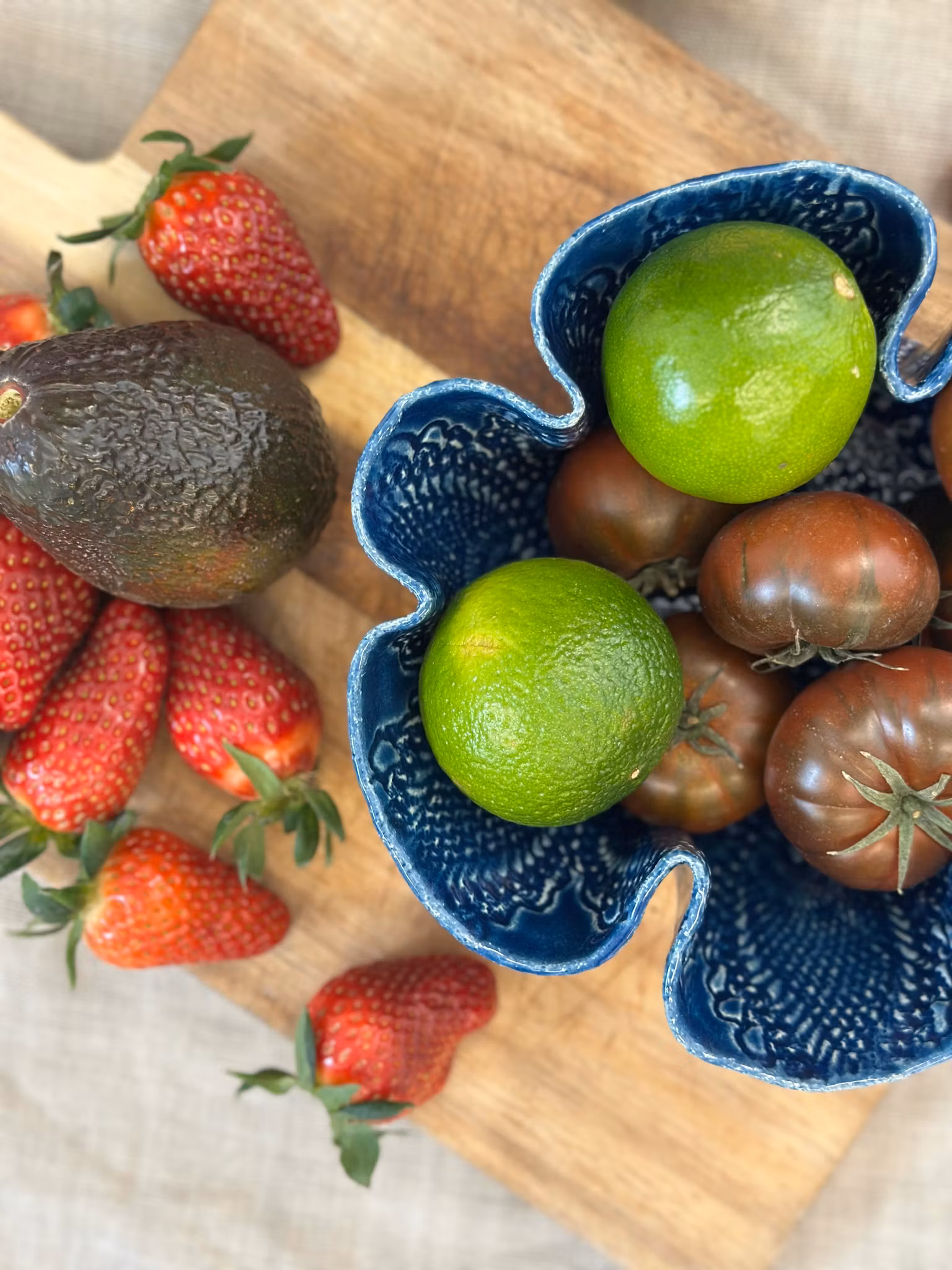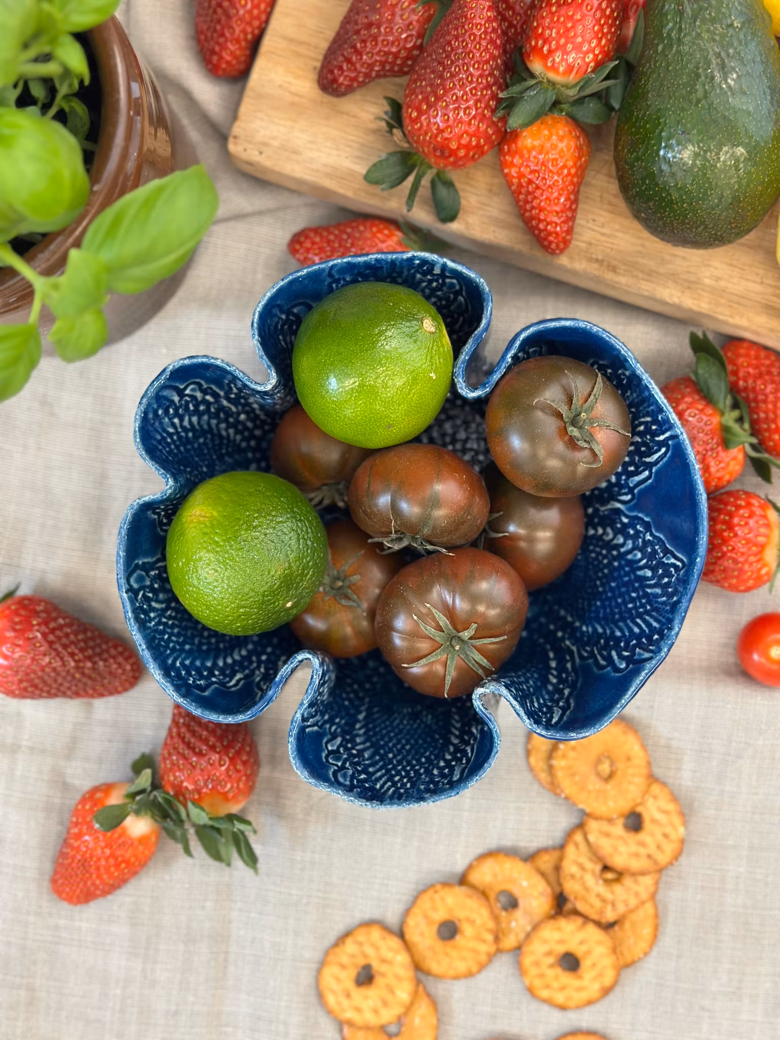 Mindre skål med høy kant. Avtrykk fra en hekleduk inni som er sentrert. Utenpå er det avtrykk av en større duk.