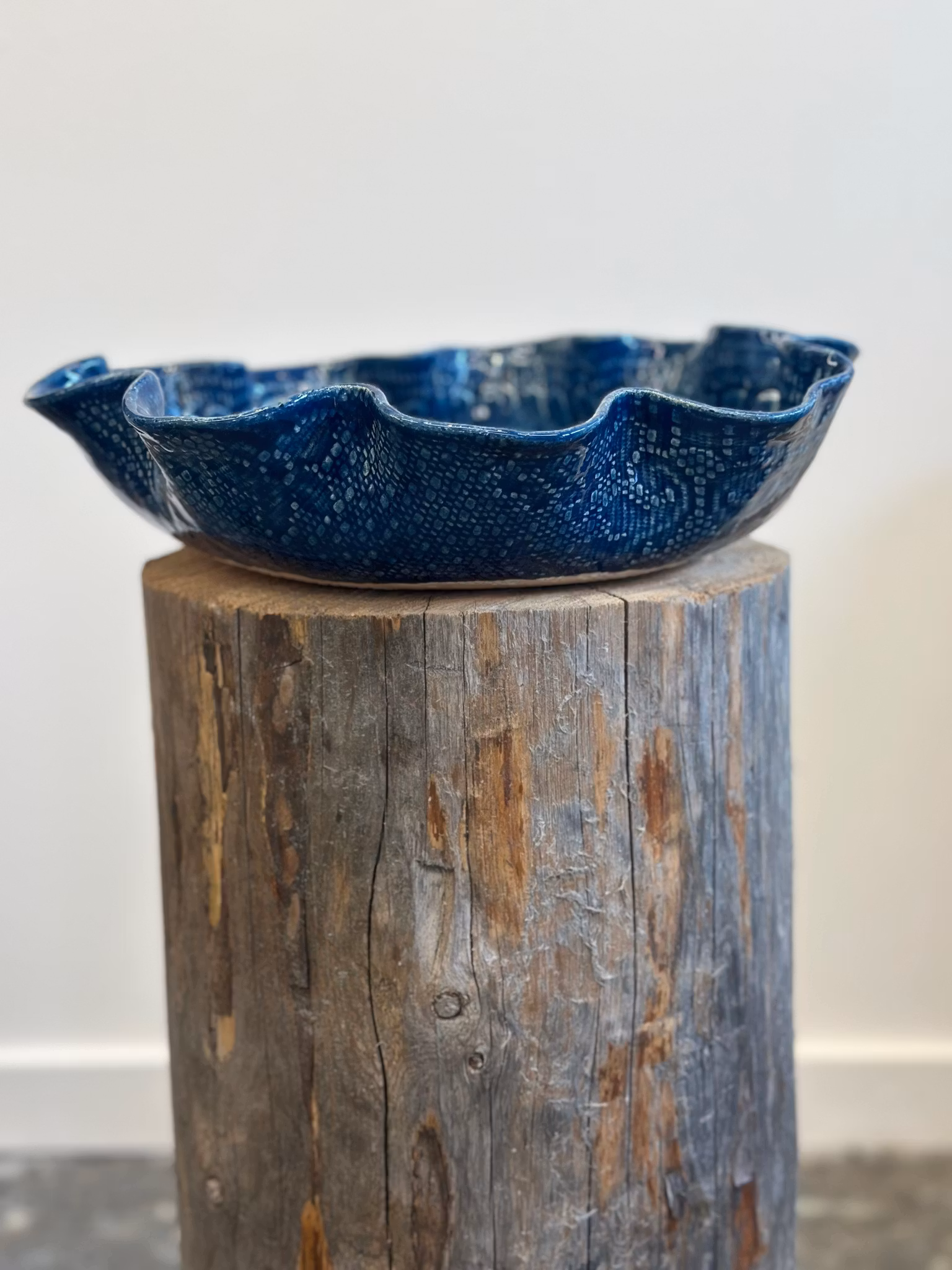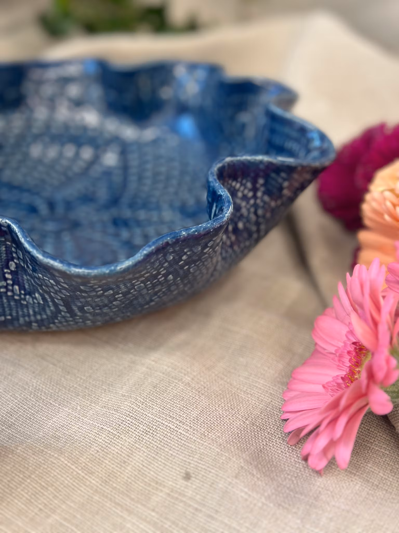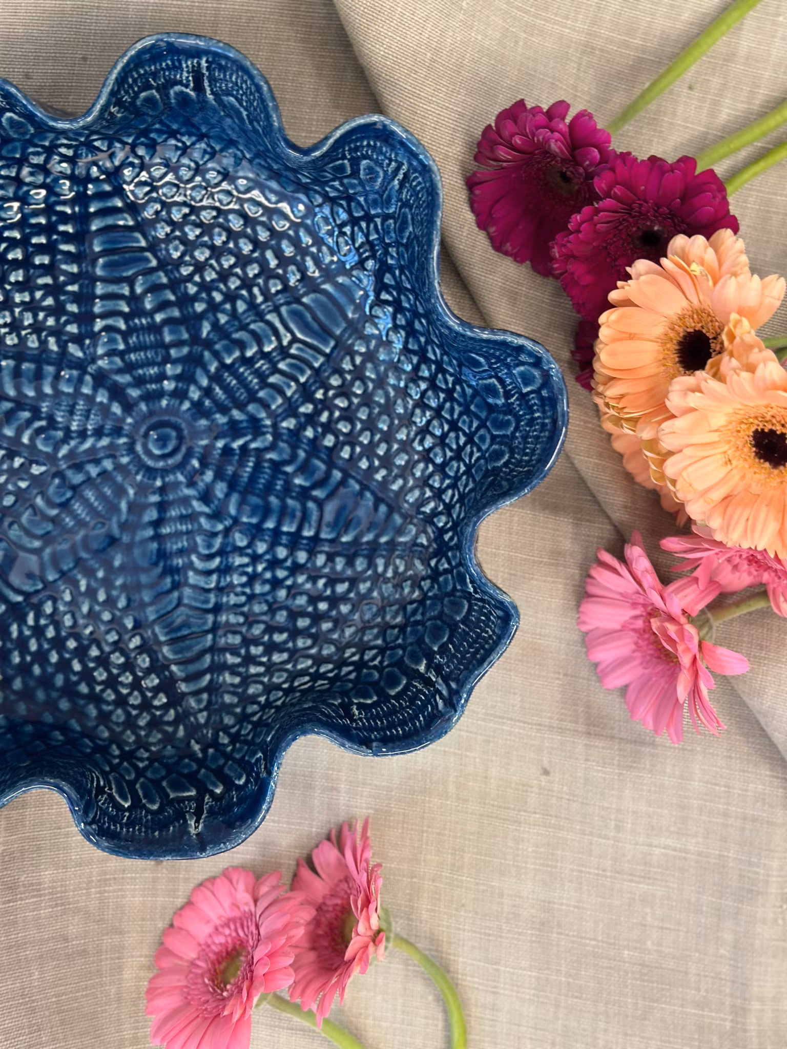 Et medium størrelse fat med høy kant med en ny duk med en flott stjerne sentrert. Utenpå er avtrykket fra en gammel gardin.