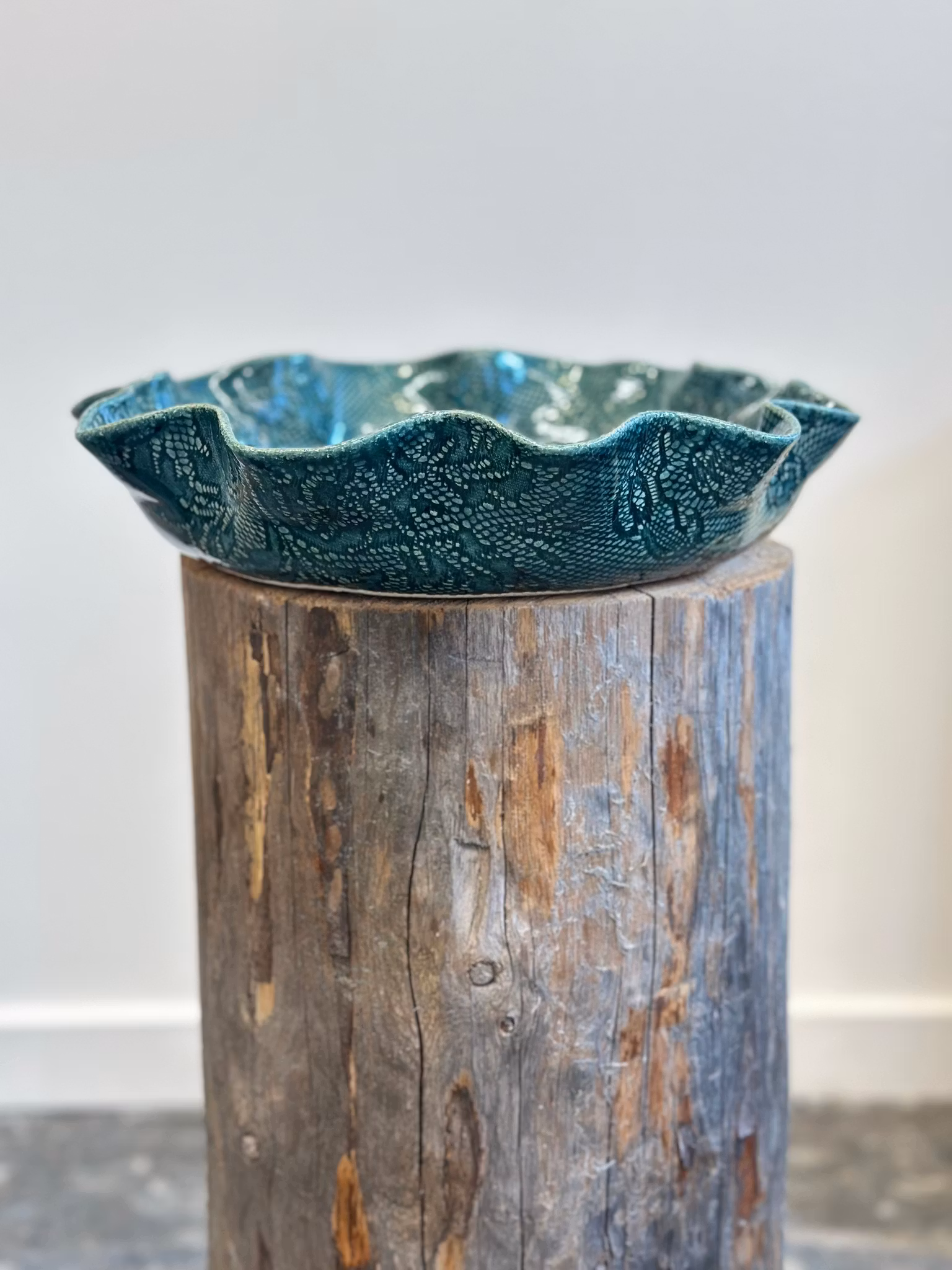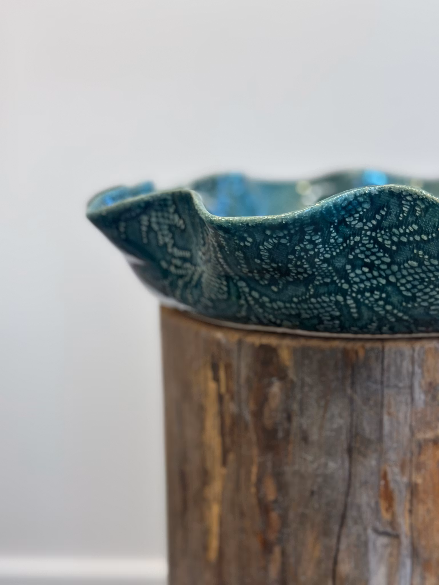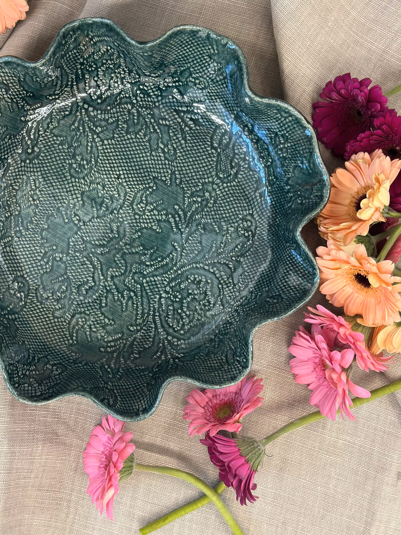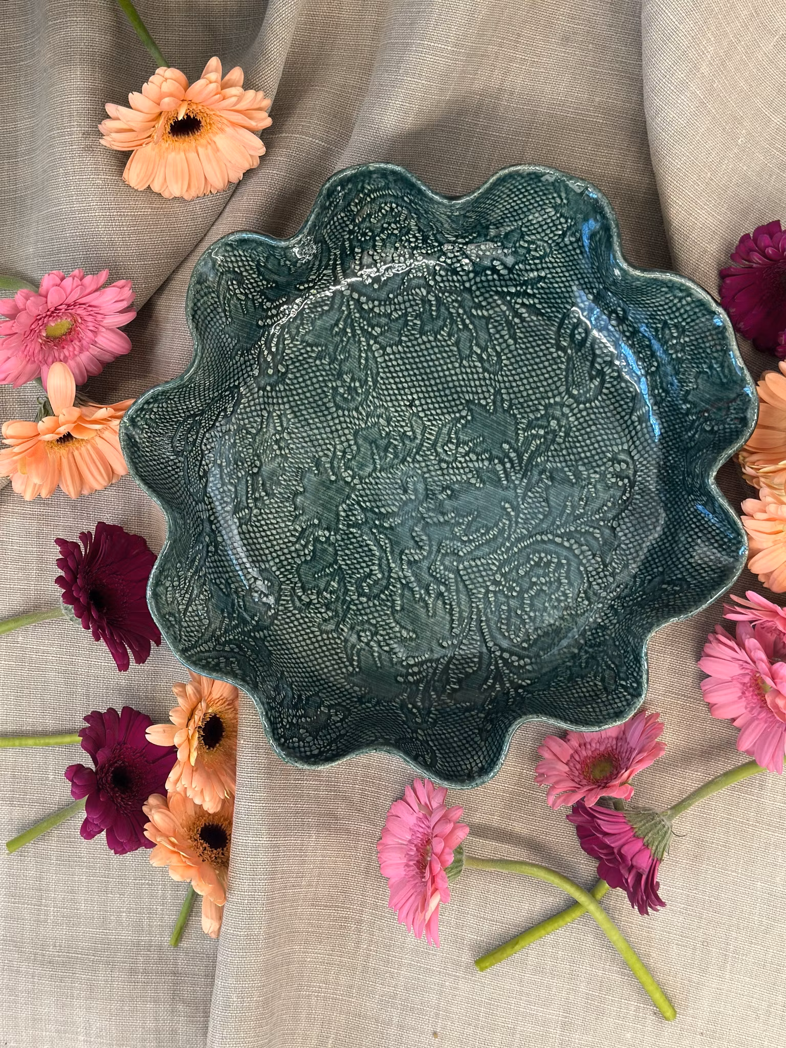 Et medium størrelse fat i dyp grønn med et sart nydelig mønster fra en gammel gardin. Det er samme avtrykk på utsiden.