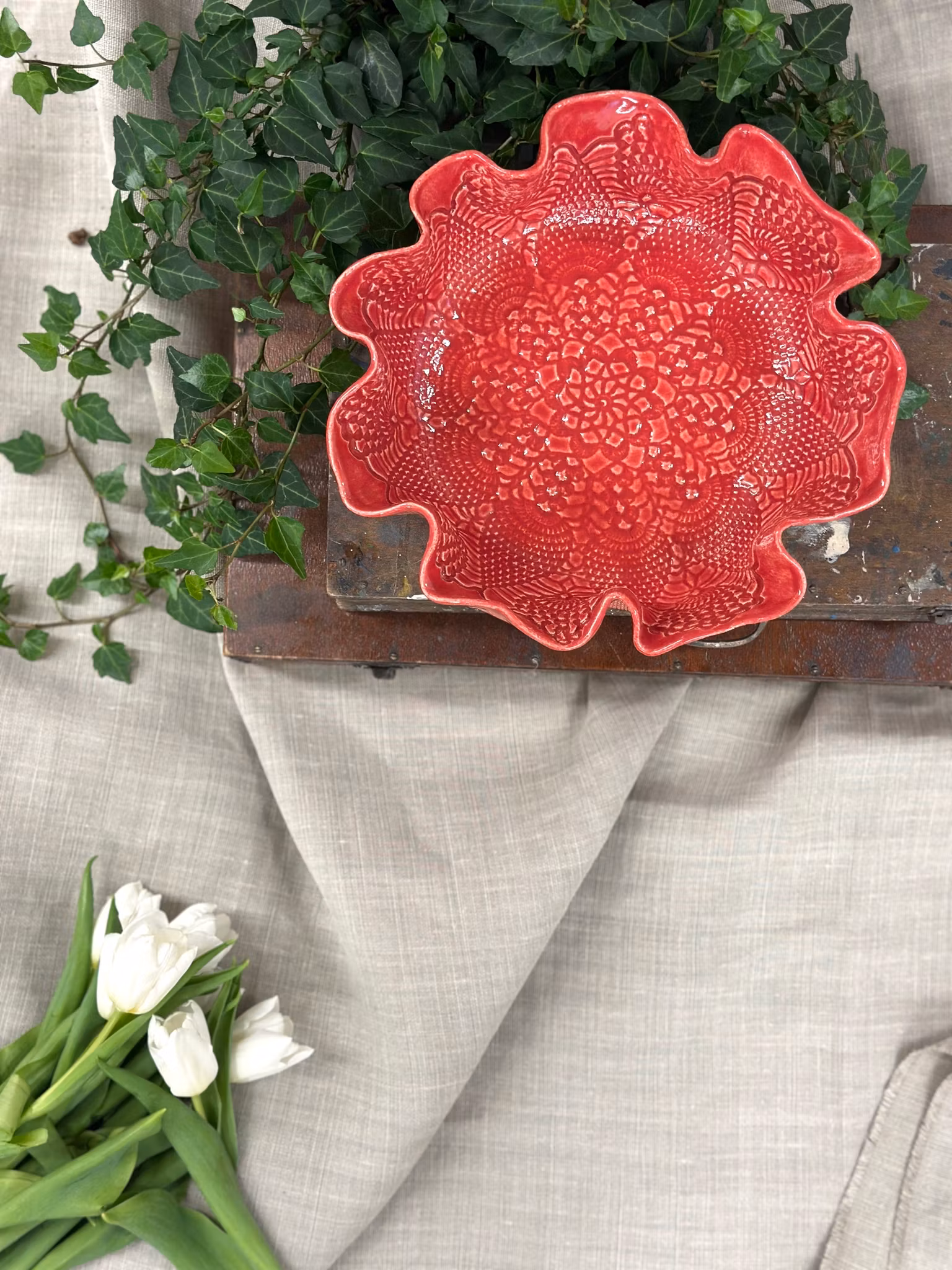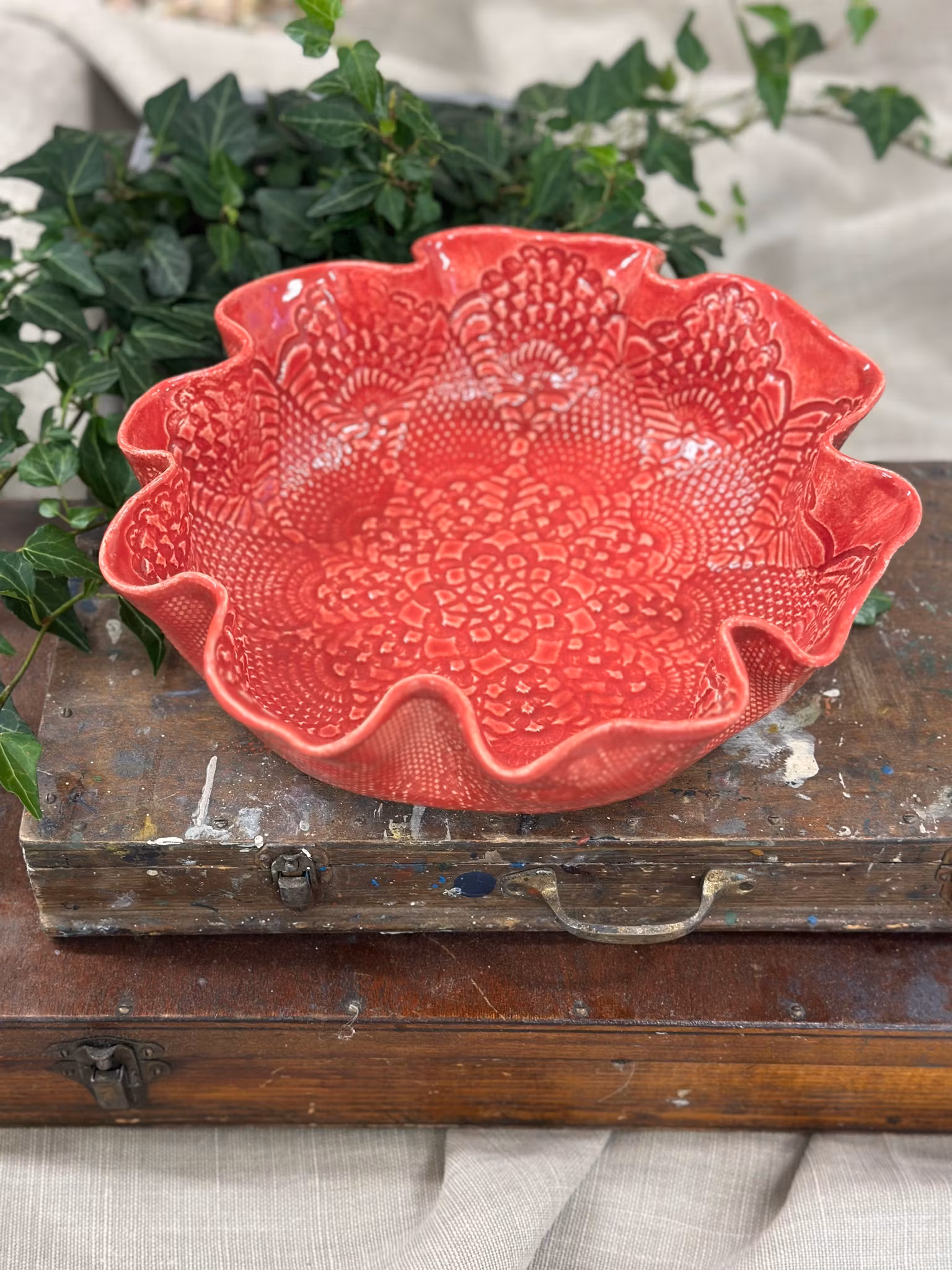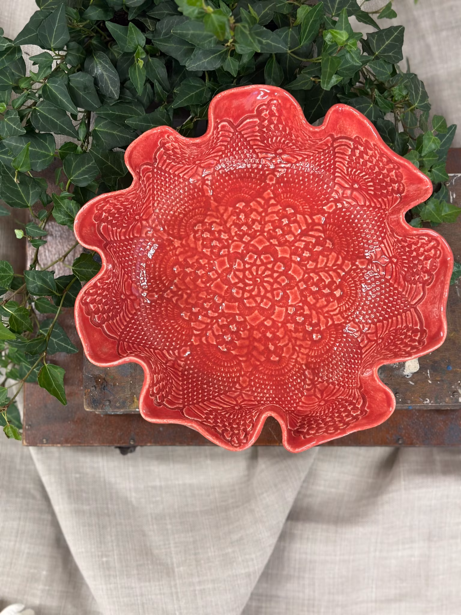 En medium størrelser skål med et vakkert mønster fra en liten hekleduk. Avtrykk av hele duken så du kan se leire kanten øverst. Utenpå er det et litt smartere avtrykk.