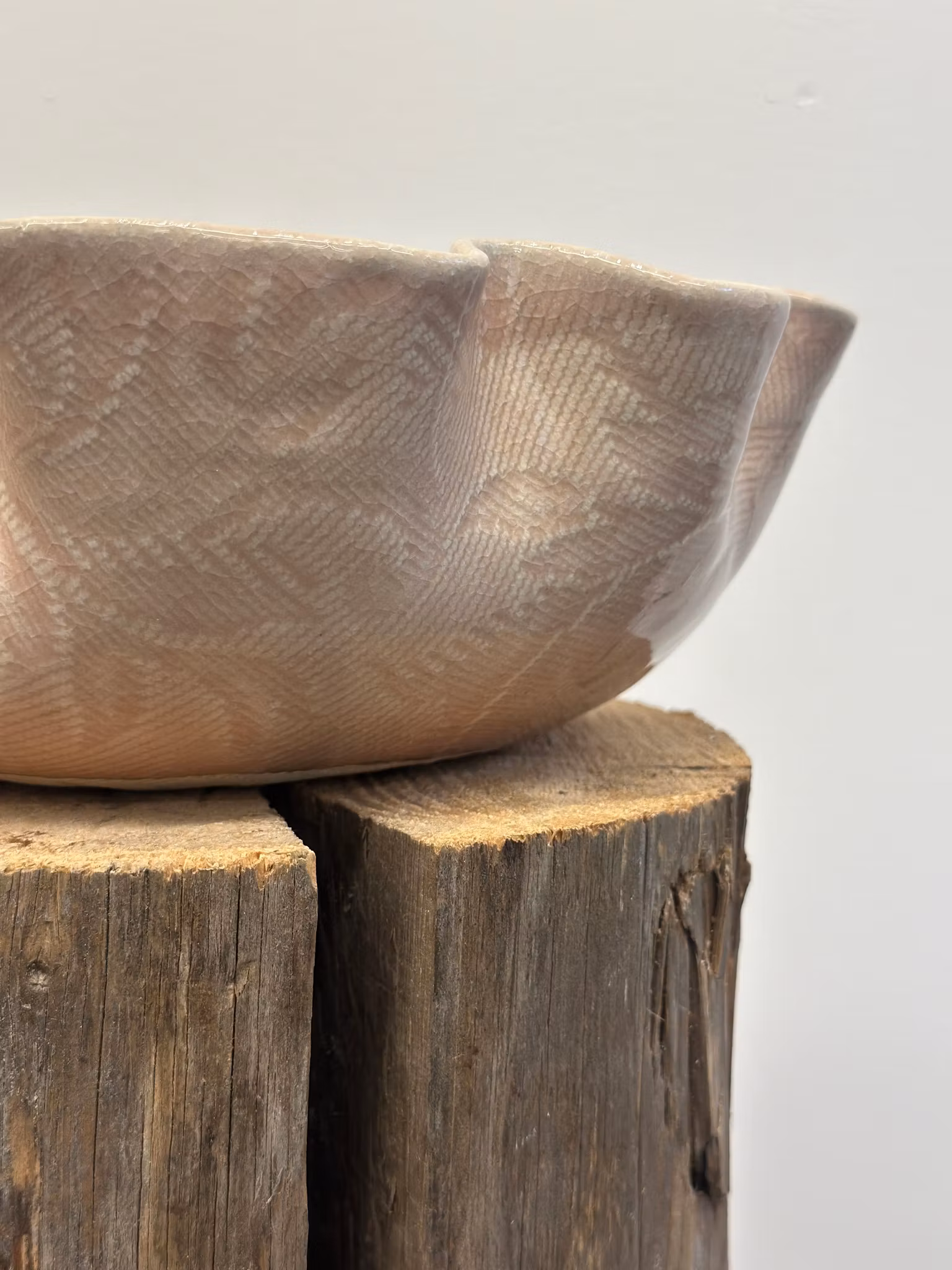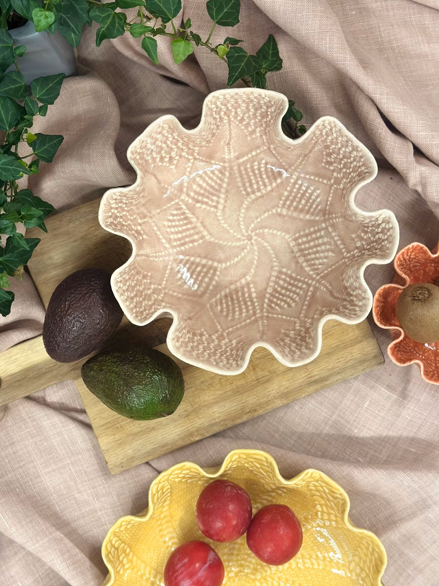 En nydelig sommerlig bolle med avtrykk av en hekleduk inni med den kjente stjernen i vifte som man finner i mange heklede mønster. Utenpå er det avtrykk fra en gammel gardin.