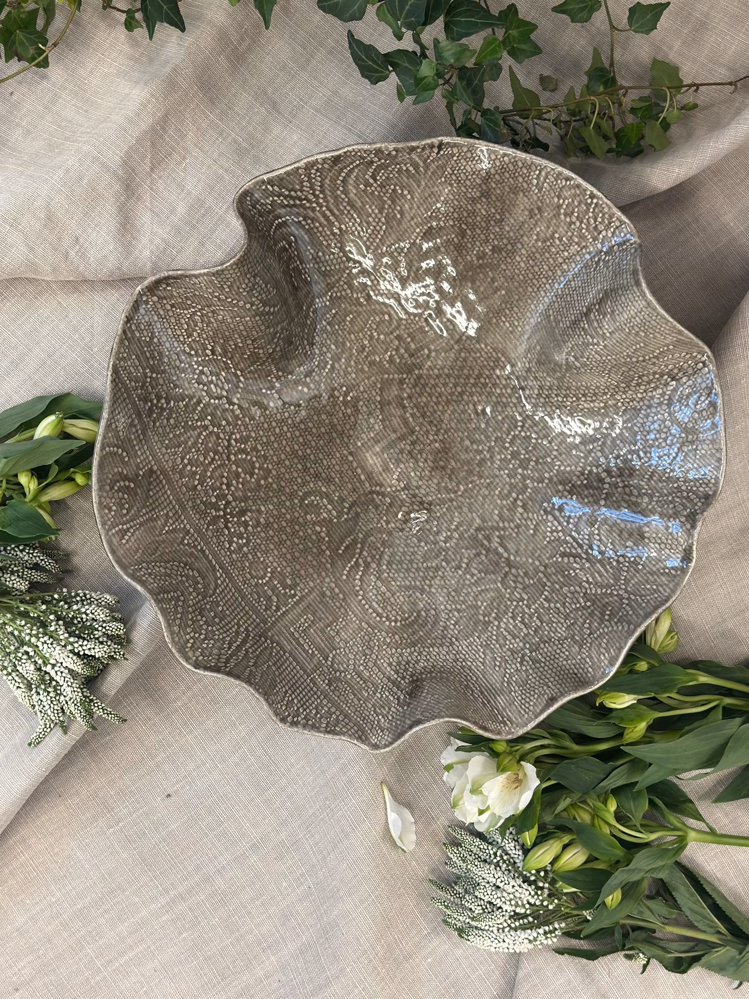 En nydelig bolle/fat - se form på bildene sart fint avtrykk på begge sider fra en gammel gardin.
