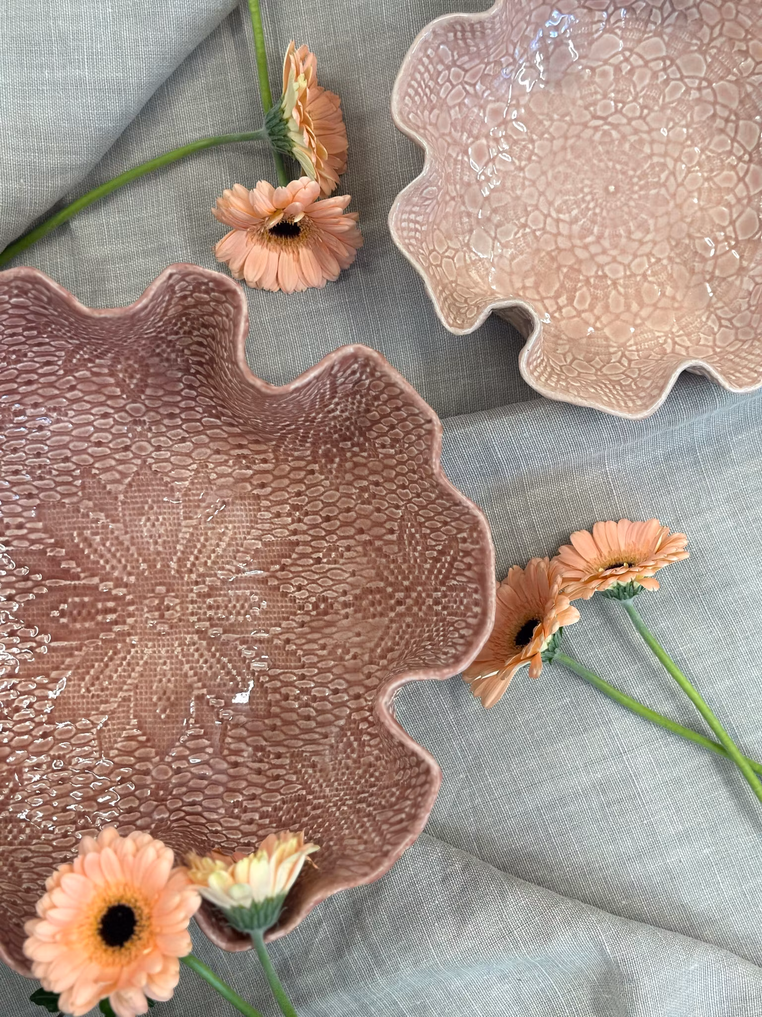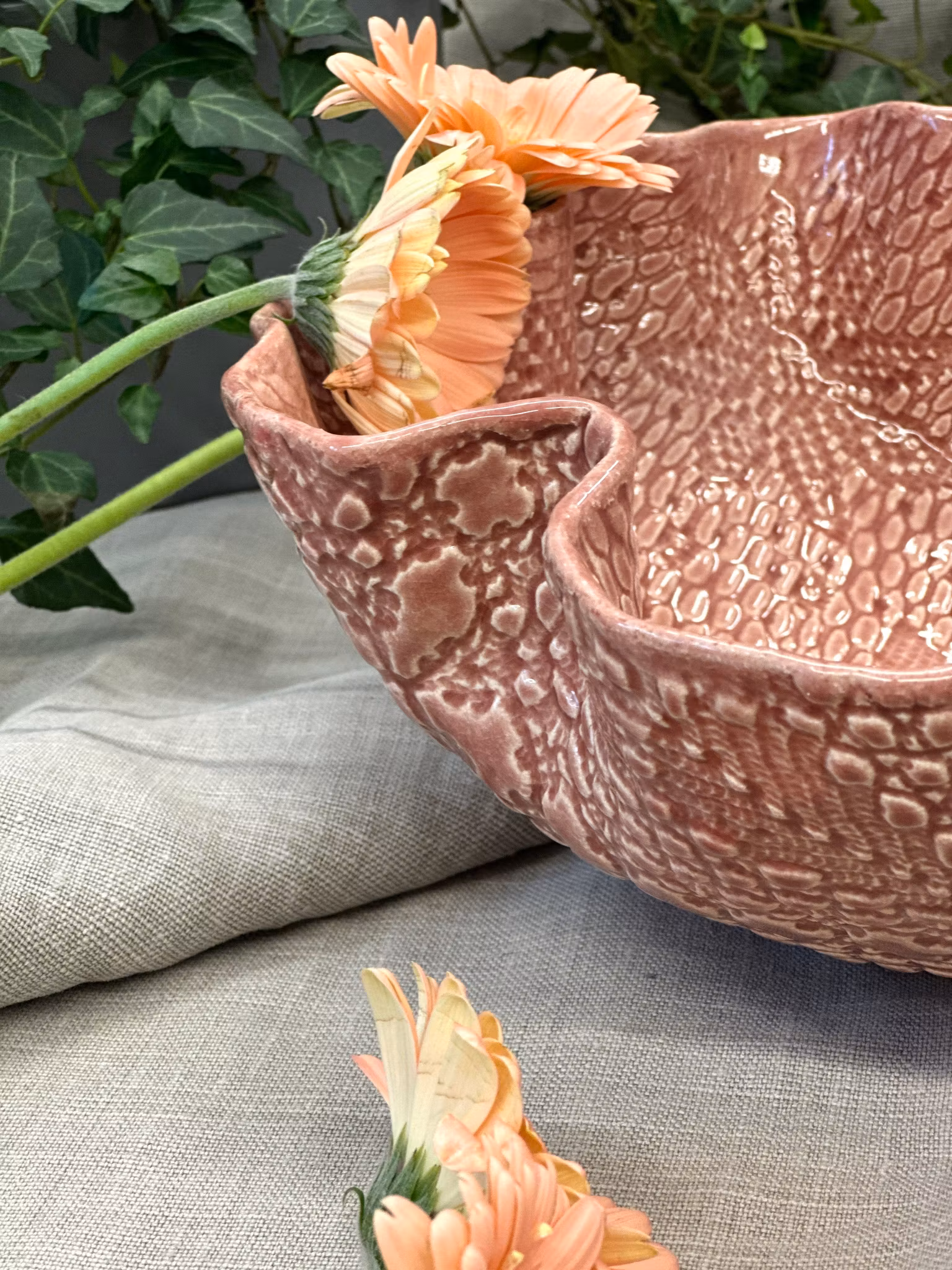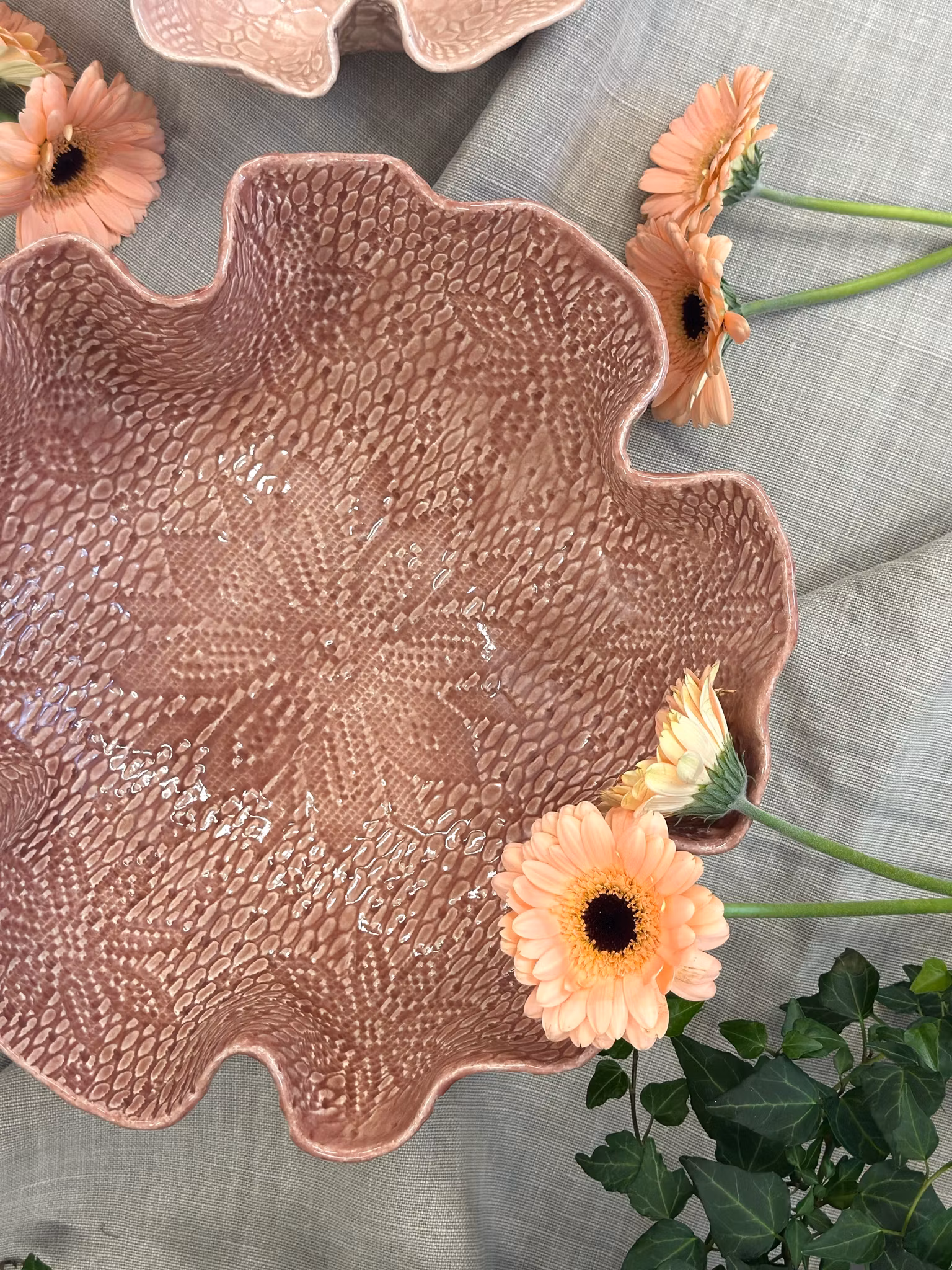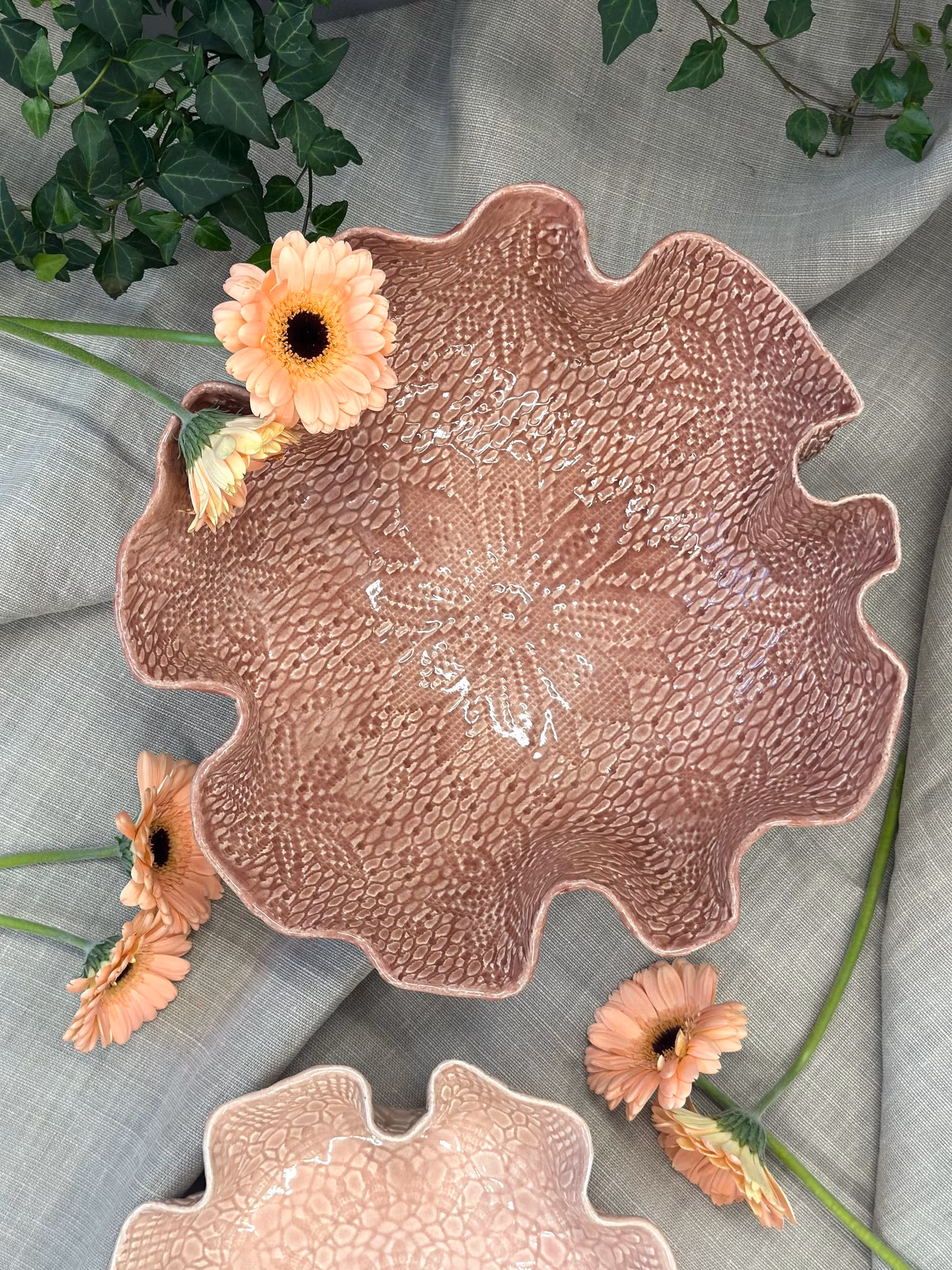 Lekker STOR bolle i Dusty pink med høy kant! Vakkert avtrykk fra en gammel hekleduk med en sentrert blomst i bunnen. Utenpå er det mønster fra et gammel sengeteppe.