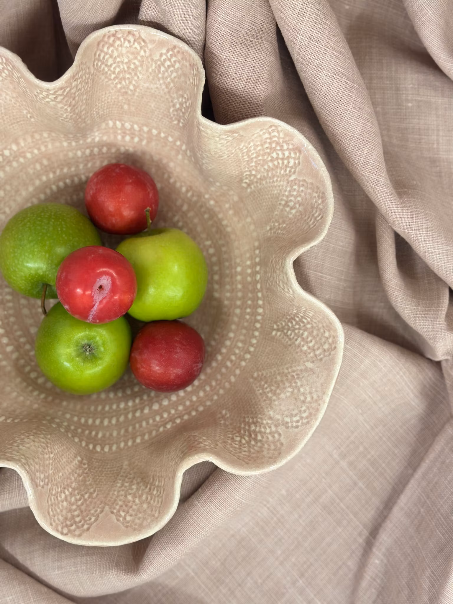 En vakker bolle med avtrykk av en av mine favoritt-helle duker. Sentrert mønster inni. Utenpå er det avtrykk som er mye grovere fra et heklet sengeteppe. Fantastisk kombinasjon. Denne bollen er skulpturell og kommer til å bli fantastisk på et bord med den utsiden.