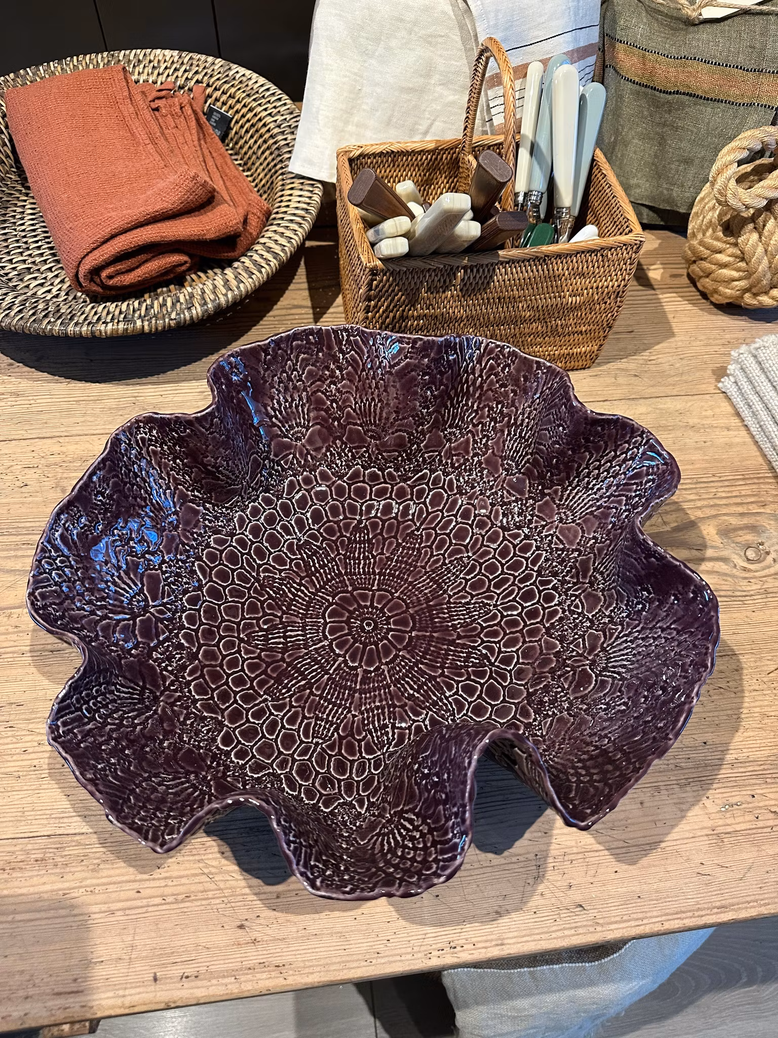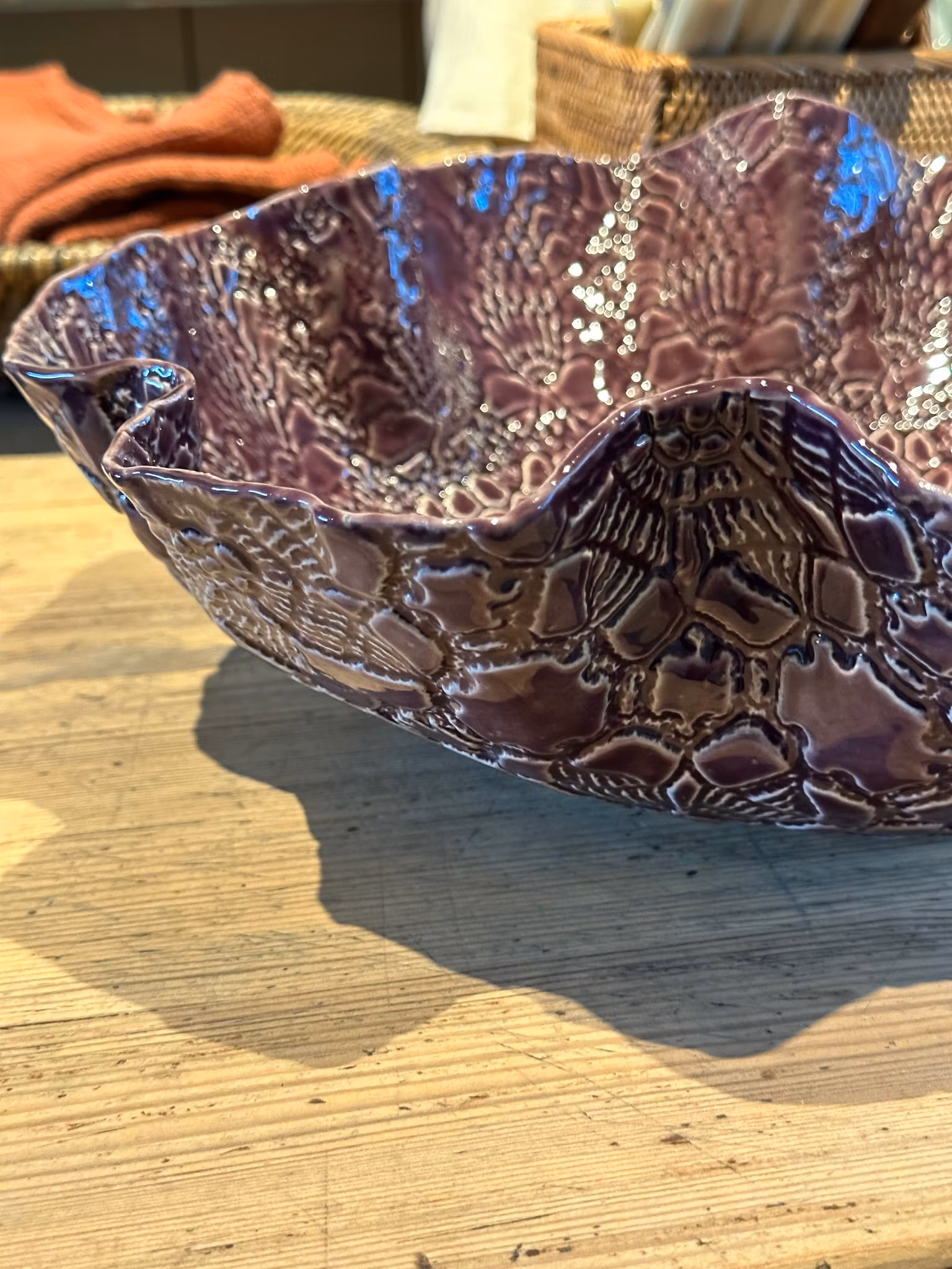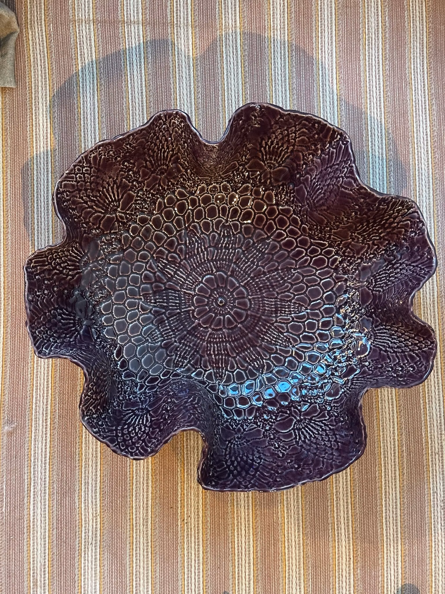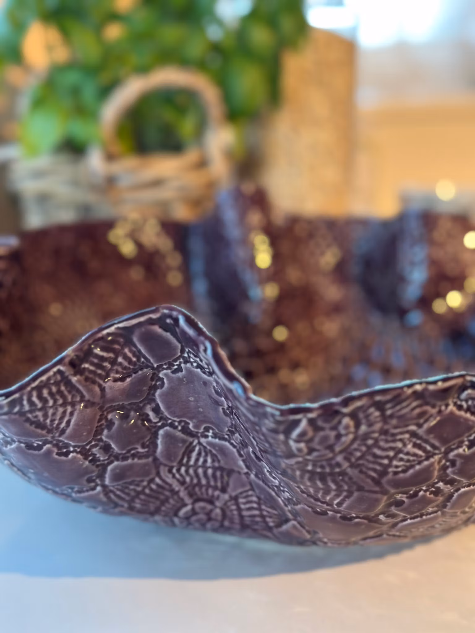 Stor skål eller bolle med avtrykk av en heklet duk inni. Utenpå er det avtrykk av et gammelt heklet sengeteppe.