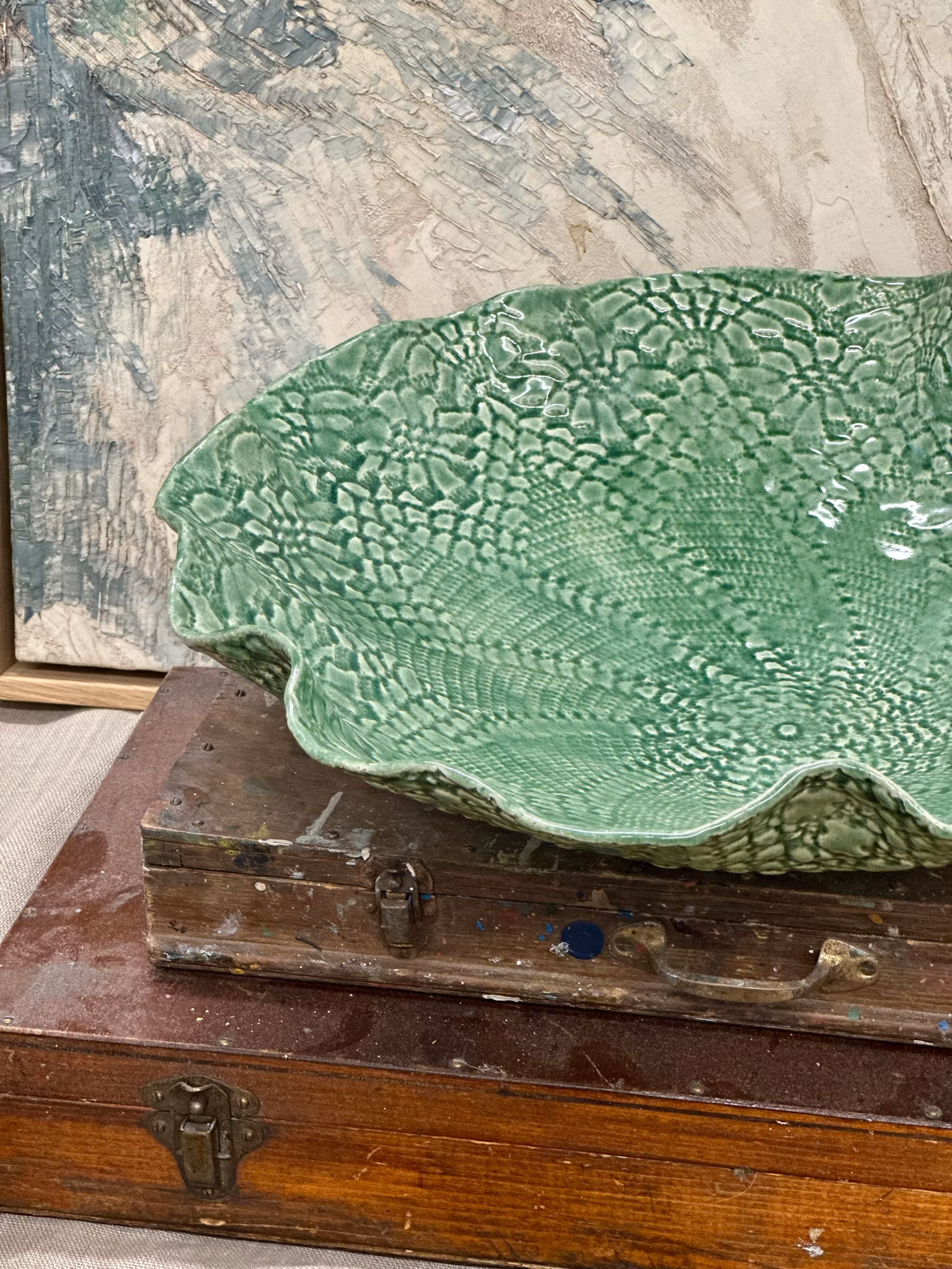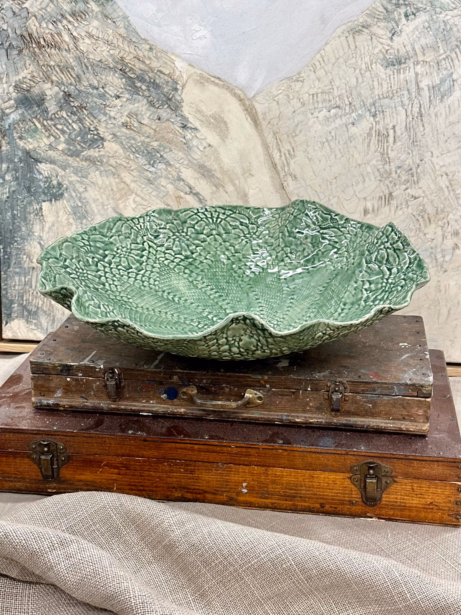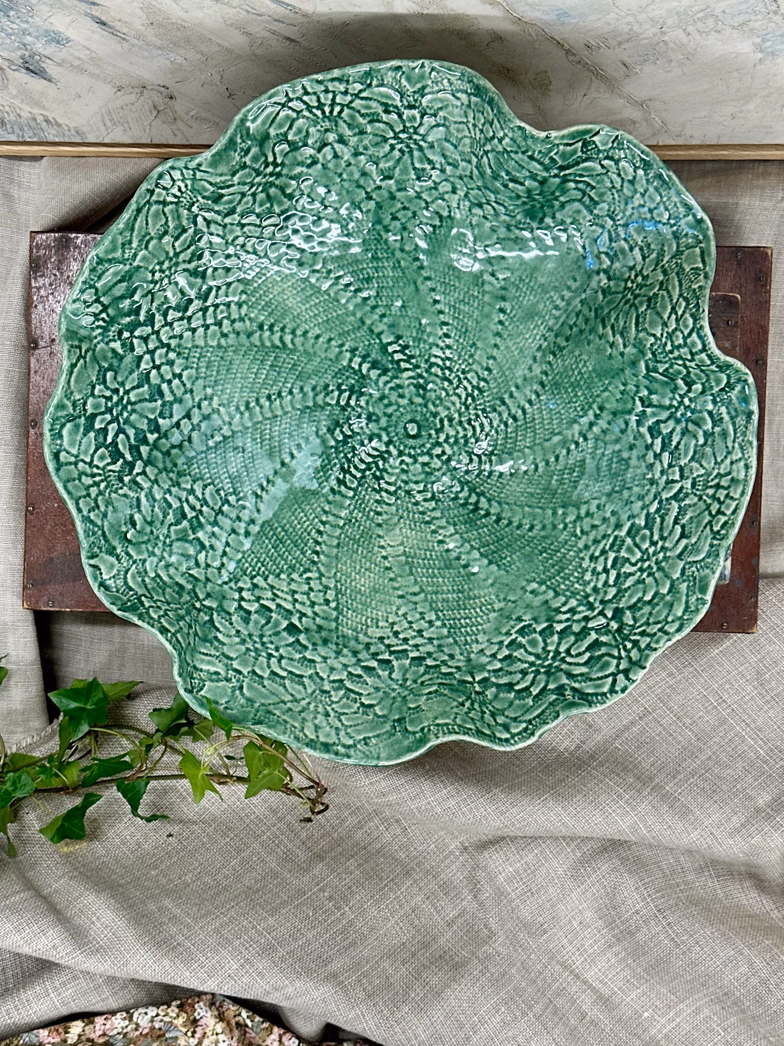 Stort fat med skrå kant - en slags skjellform. Nydelig mønster med viften i midten som jo er avtrykk av en hekleduk som er en av favorittene. Utenpå mye mønster fra et sengeteppe.