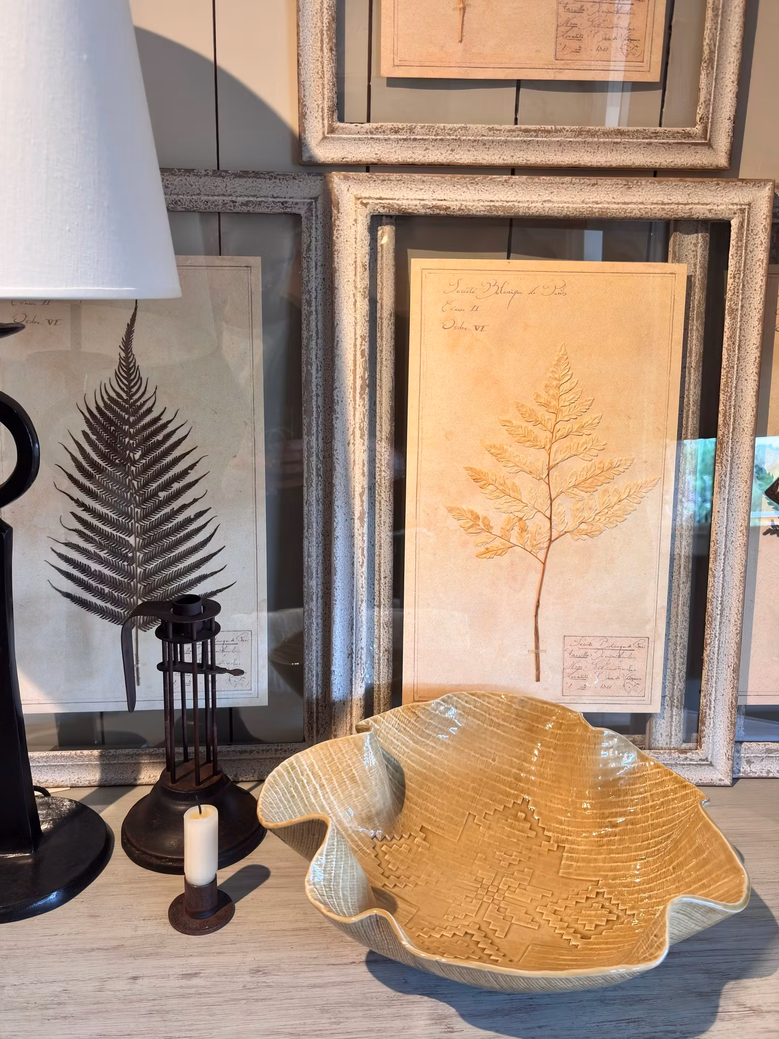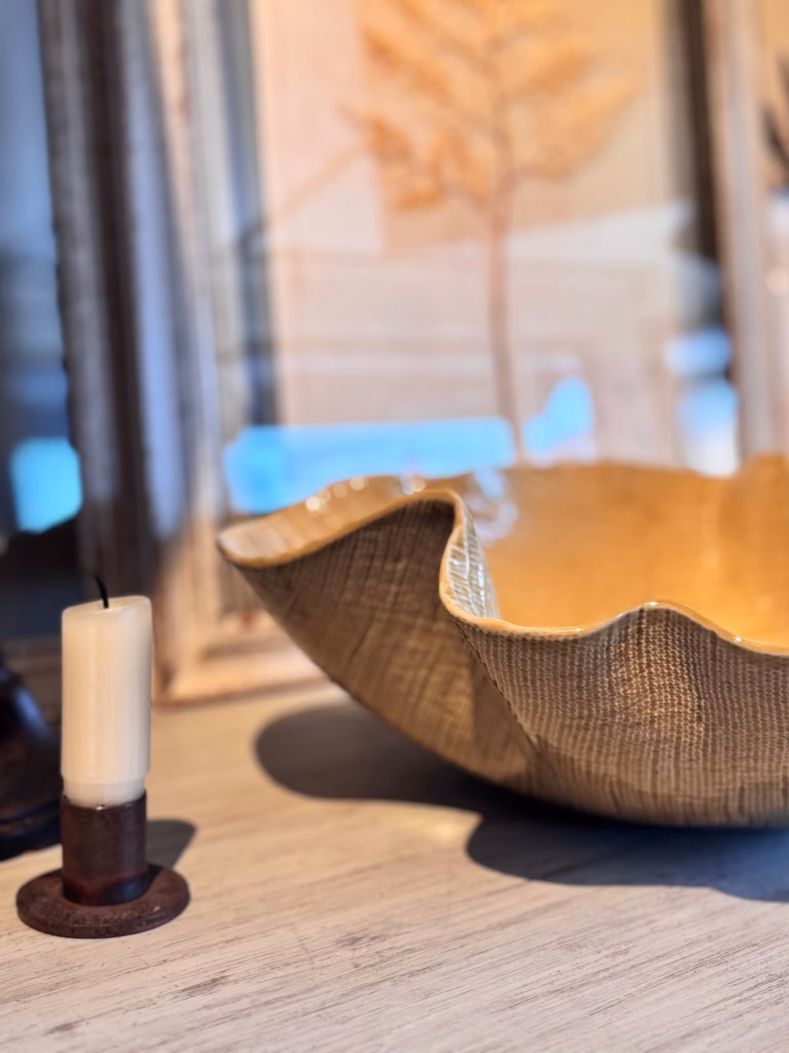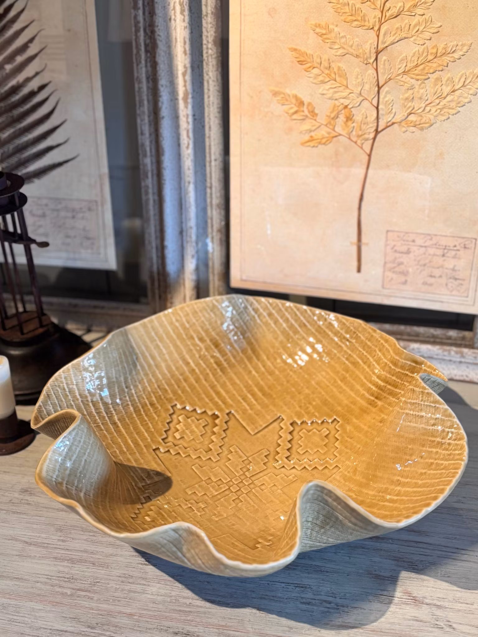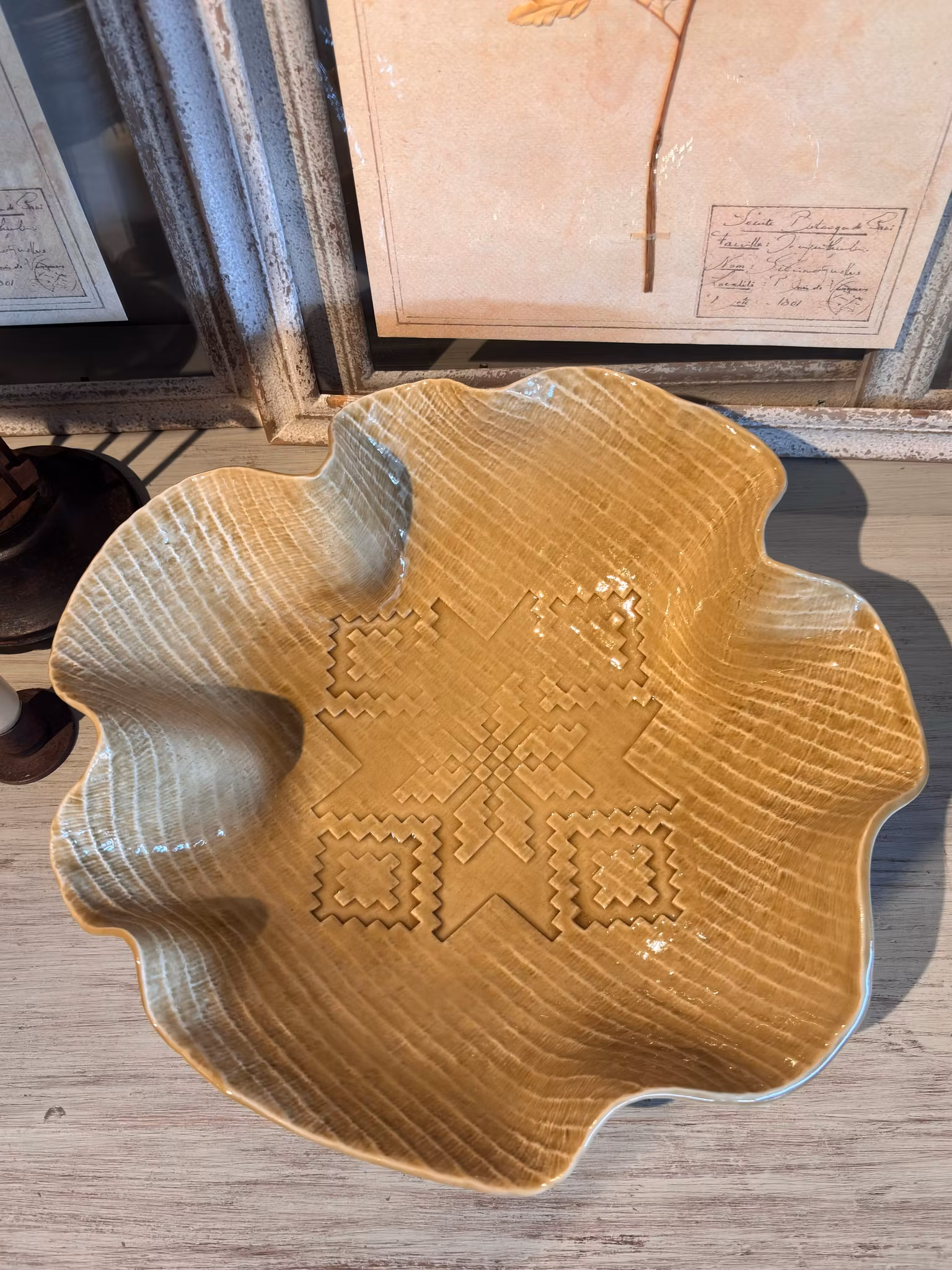 Vakker stor skål med avtrykk fra åkle med åttetallsrose. Fat fra samarbeid med Recouture.no.