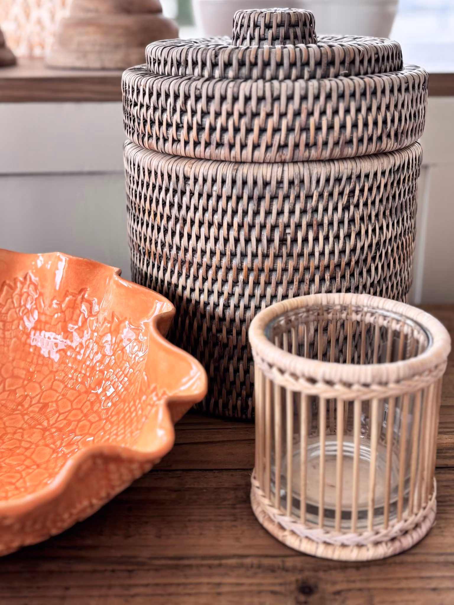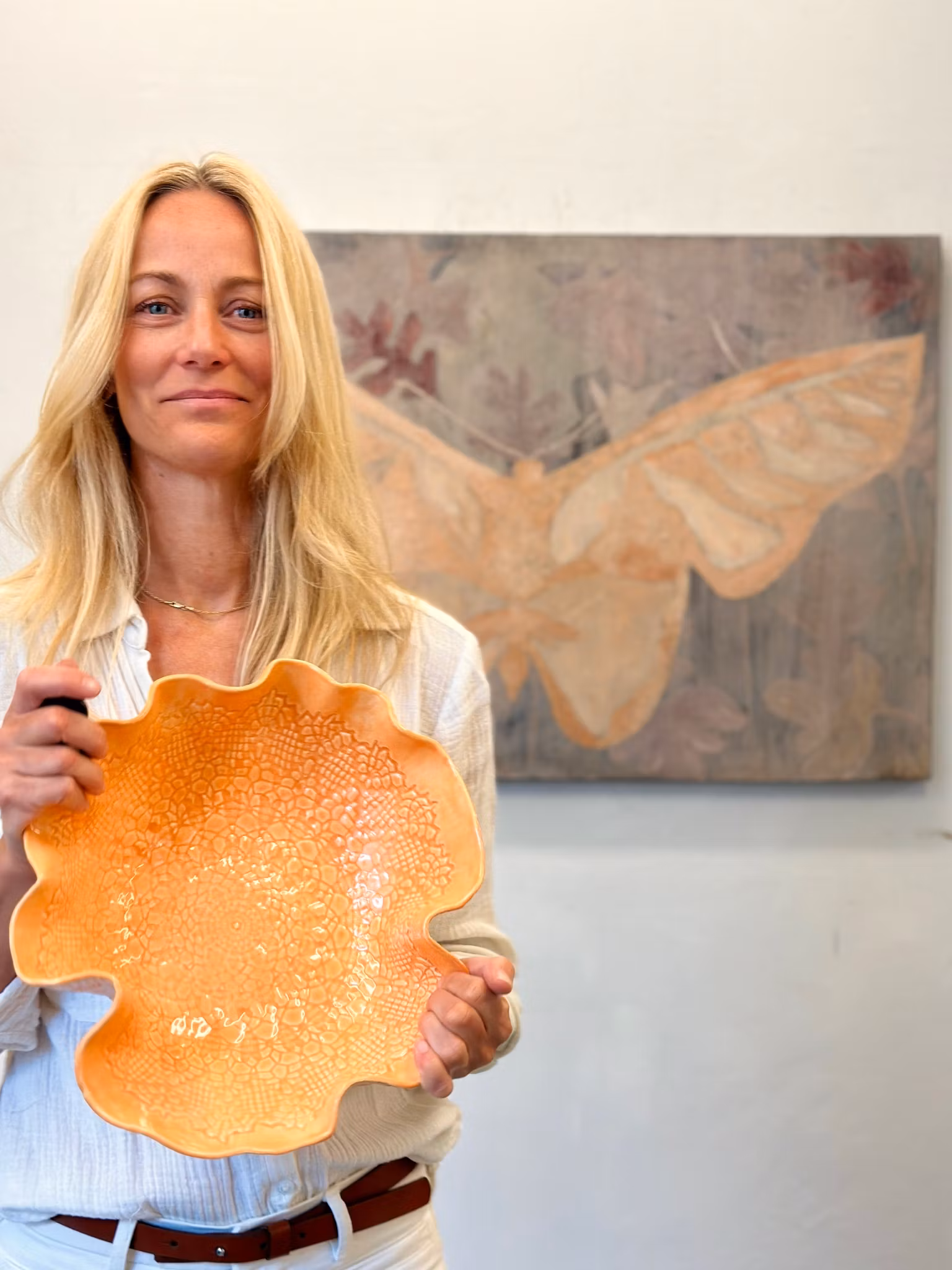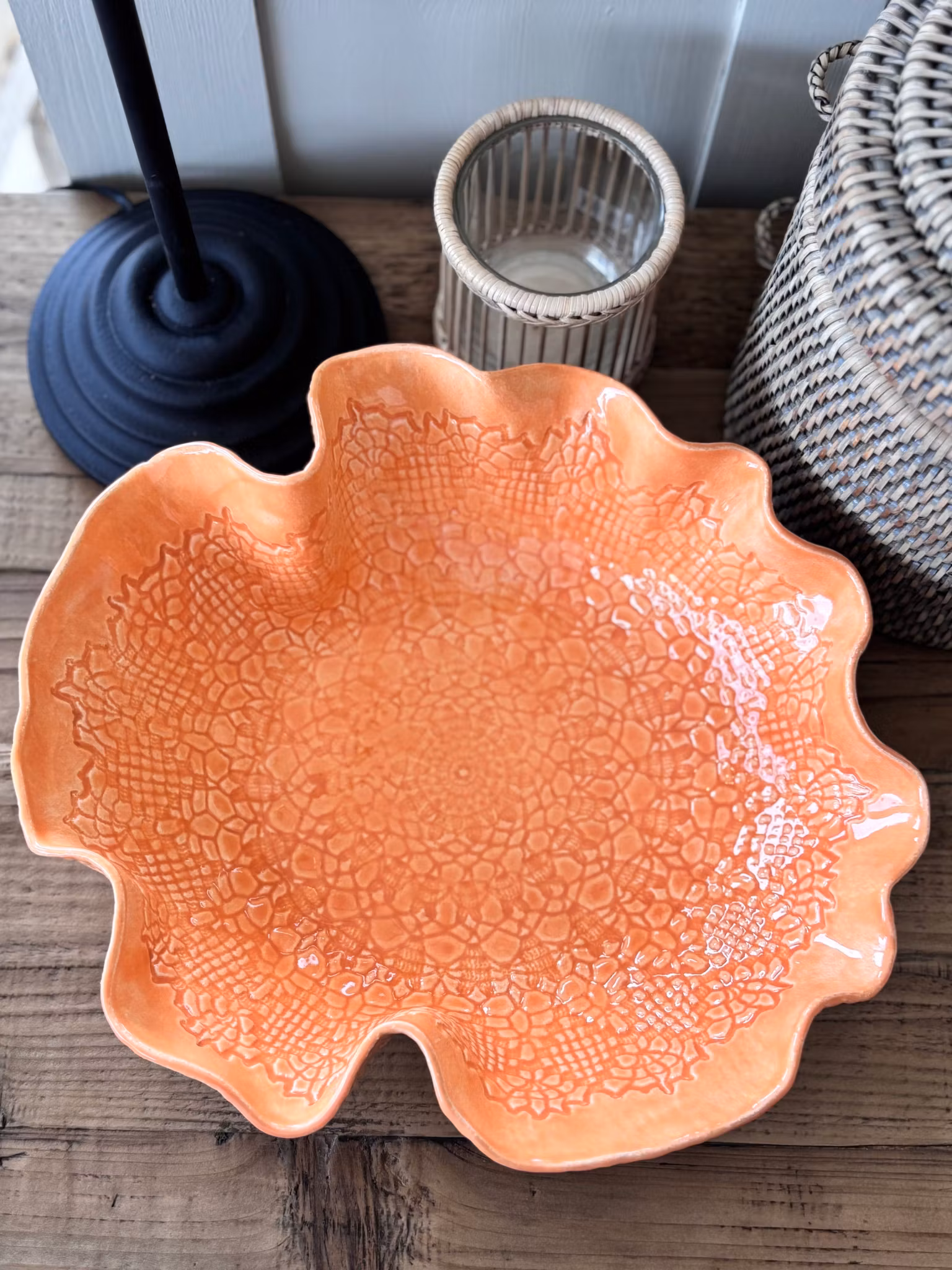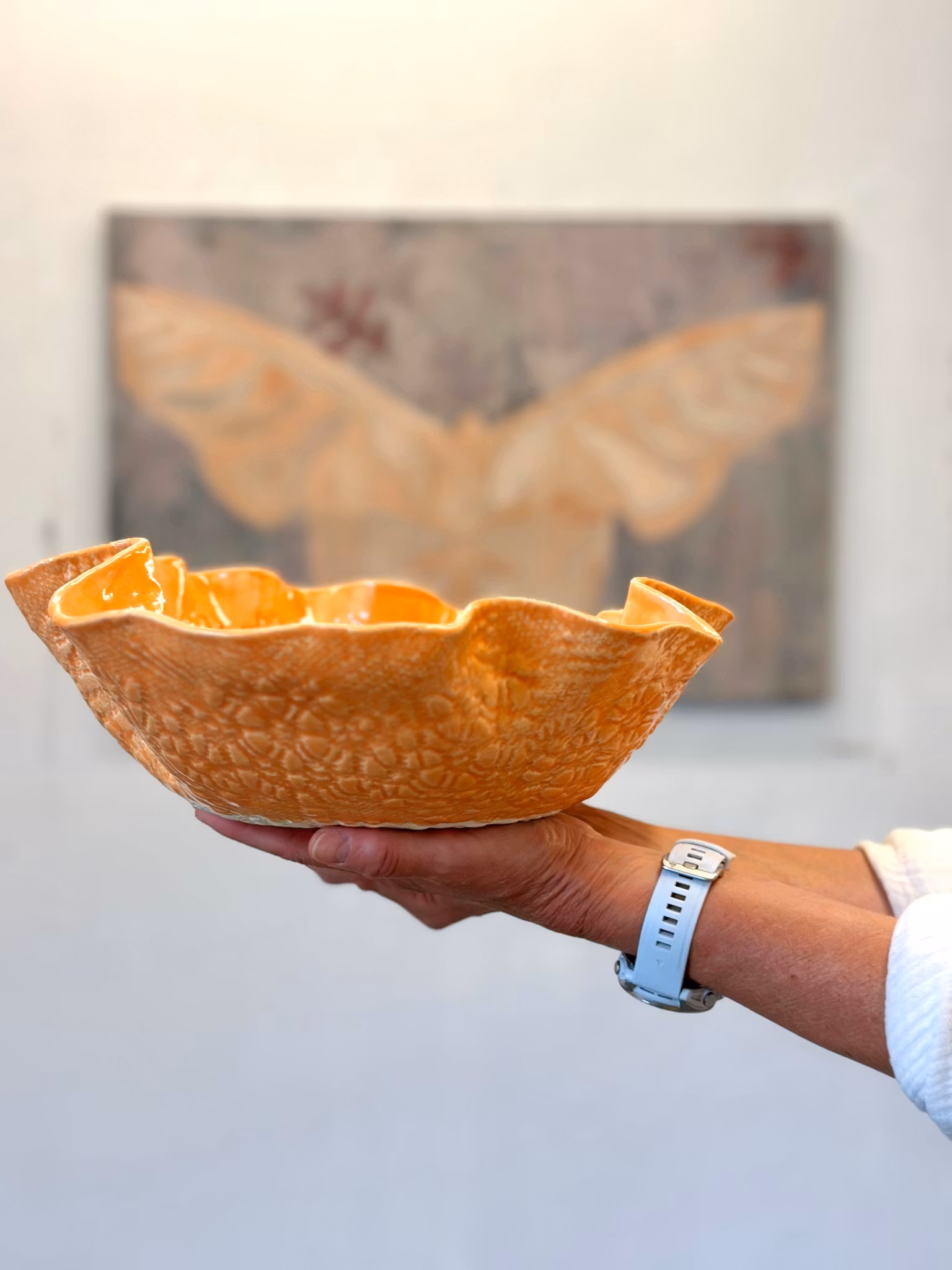 Nydelig stor organisk skål med tydelig avtrykk fra duk på innside og utside. I en vakker oransje farge som gir interiøret et preg av vår eller sommer. Vanskelig farge å ta bilde av, men den er lys oransje.