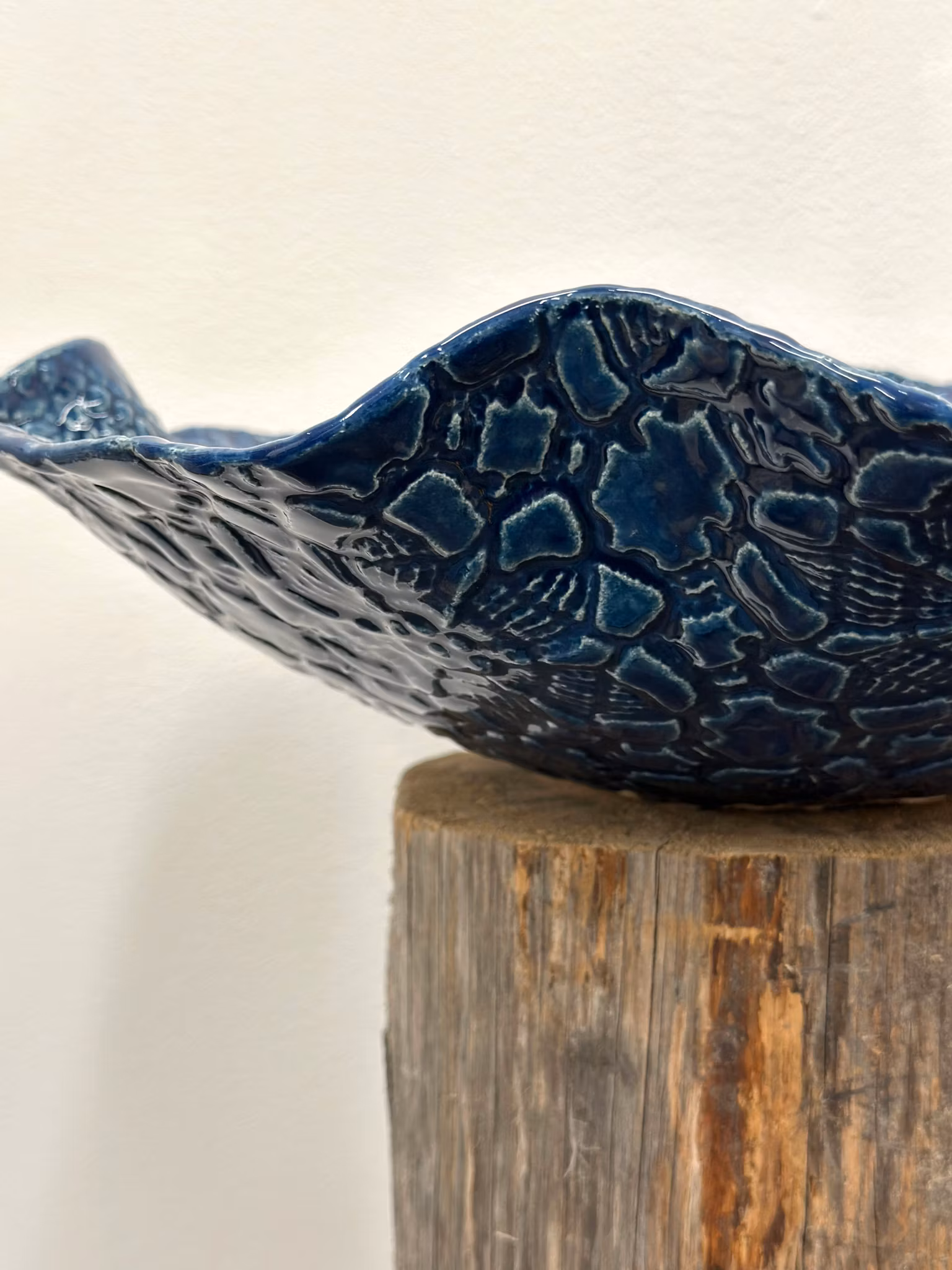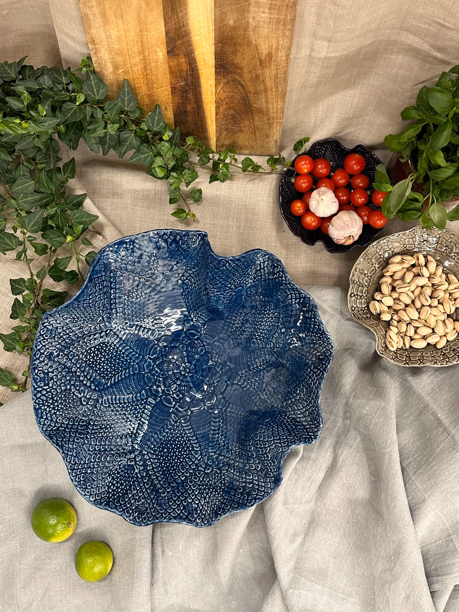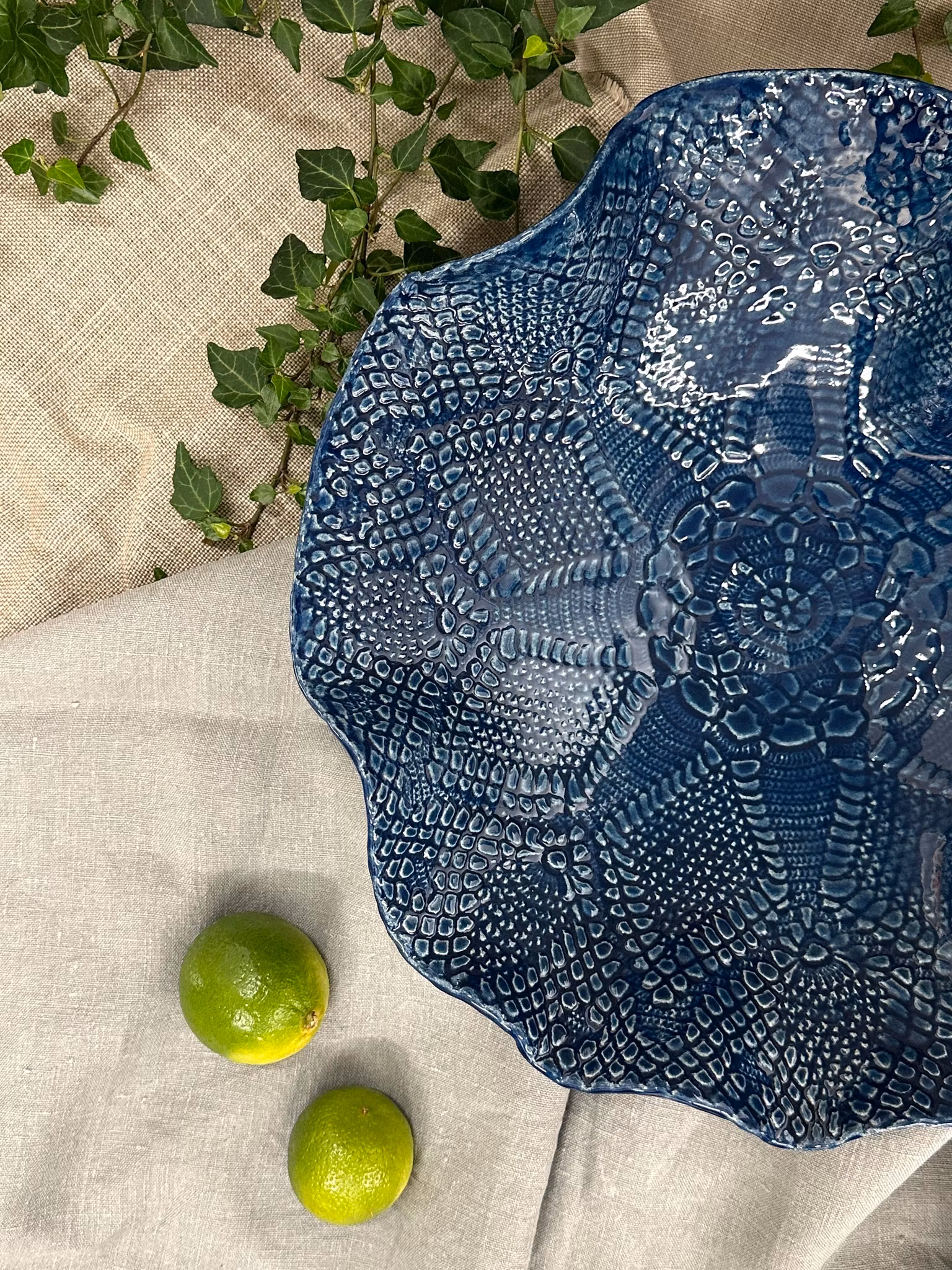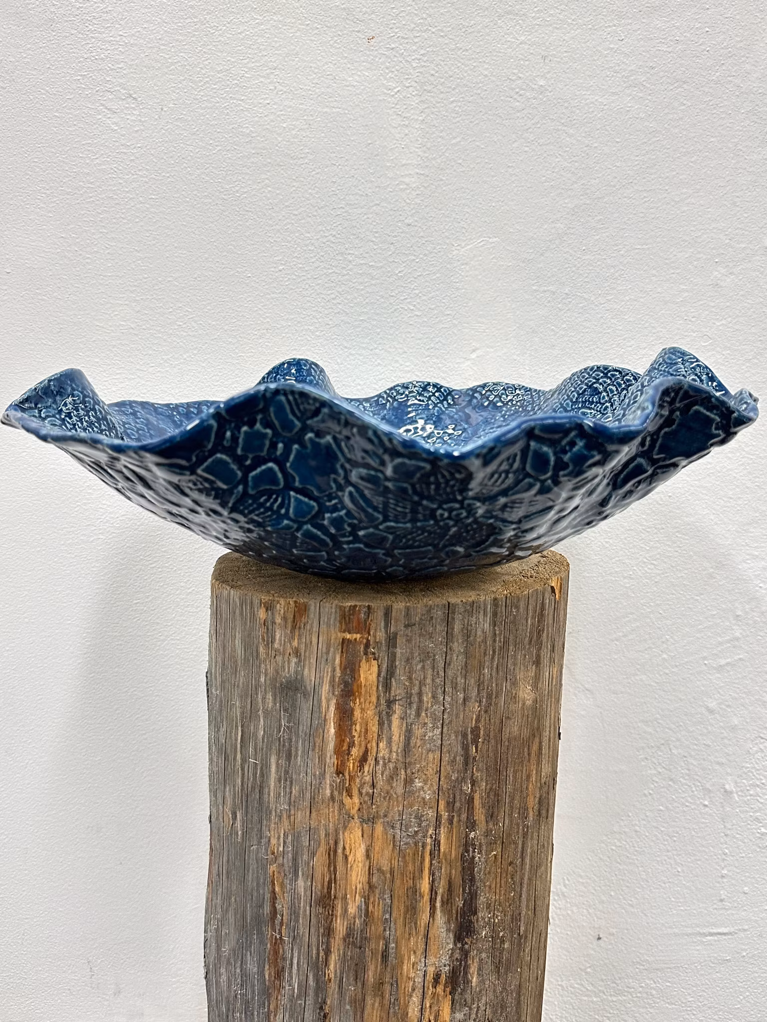 Ekstra stor og vid skål med høy kant i skjell-form. Vakkert sentrert avtrykk av en heklet duk som er ca samme størrelse som fatet utenpå er det avtrykk av et gammelt sengeteppe som er heklet. Så lekkert når det står og du ser utsiden godt.