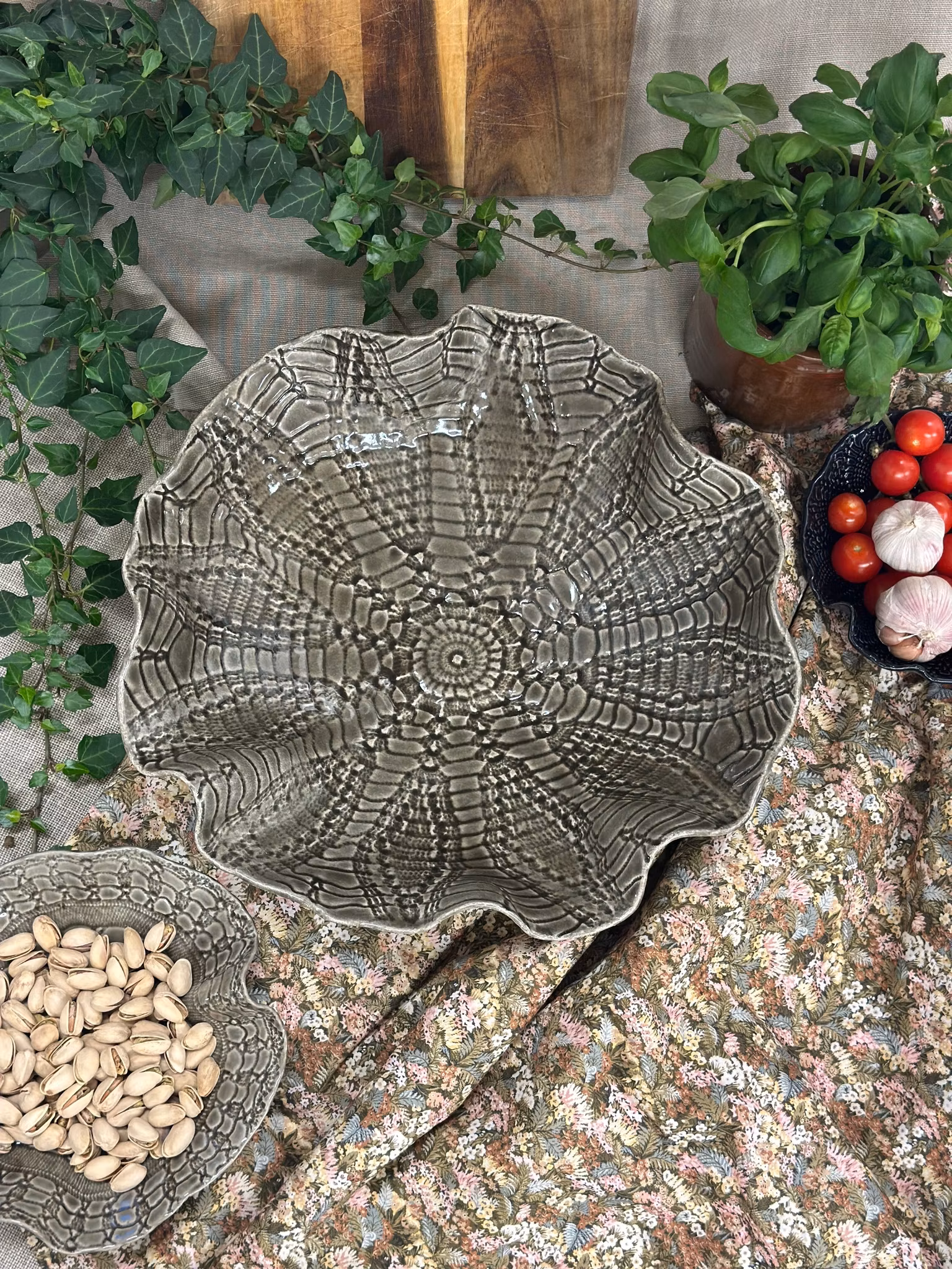 Stor og vid skål med høy kant i skjell-form. Vakkert sentrert avtrykk av en heklet duk og utenpå er det avtrykk av en gammel gardin.