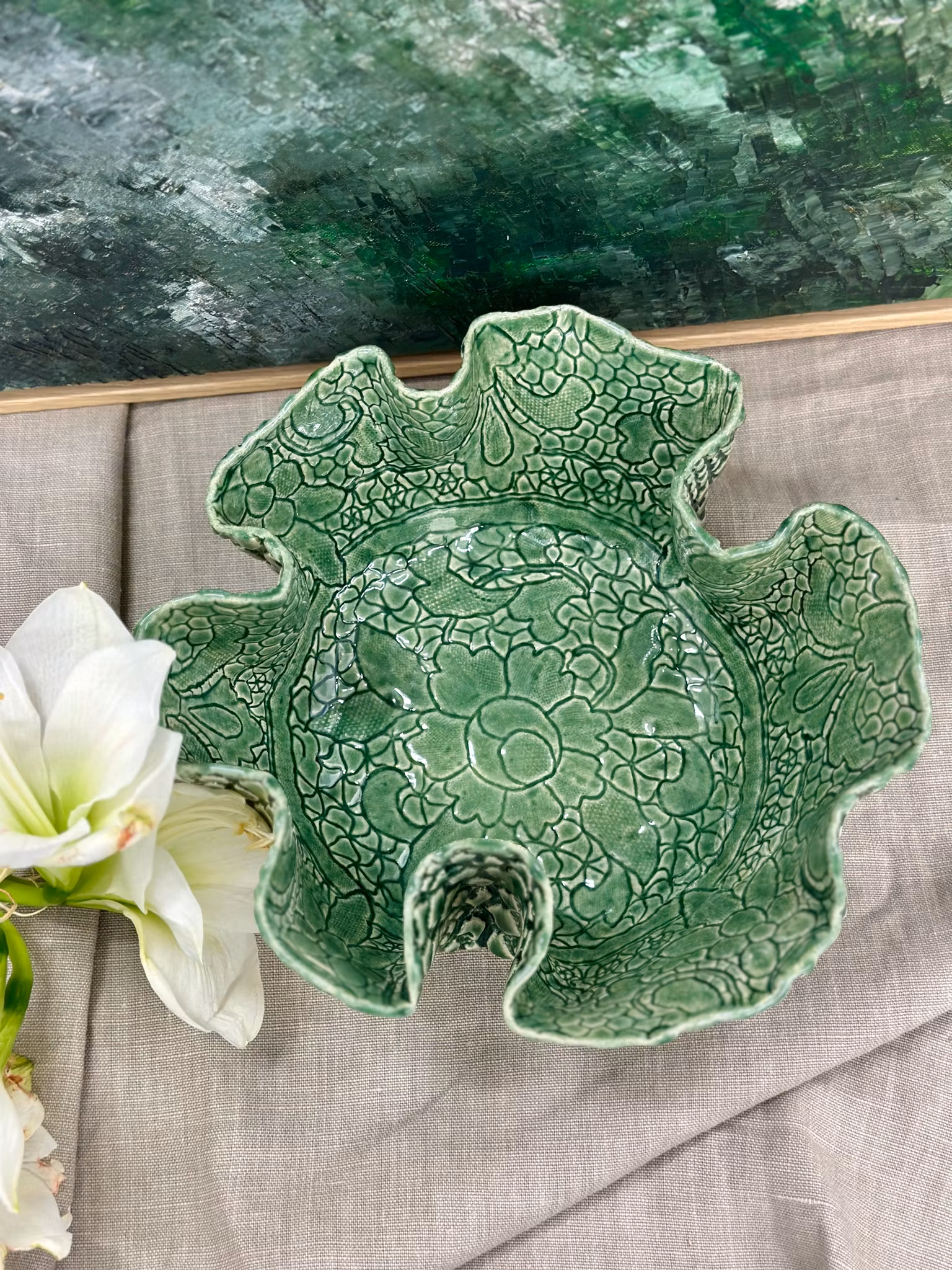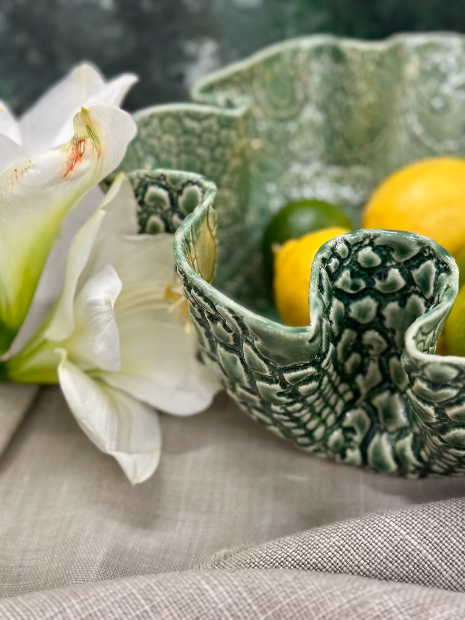 Stor skål med høye kanter med et flott avtrykk av en nuperelle-duk inni. Masse struktur og skulpturell på utsiden. Lekker i en bokhylle eller på et bord hvor utsiden blir godt synlig.