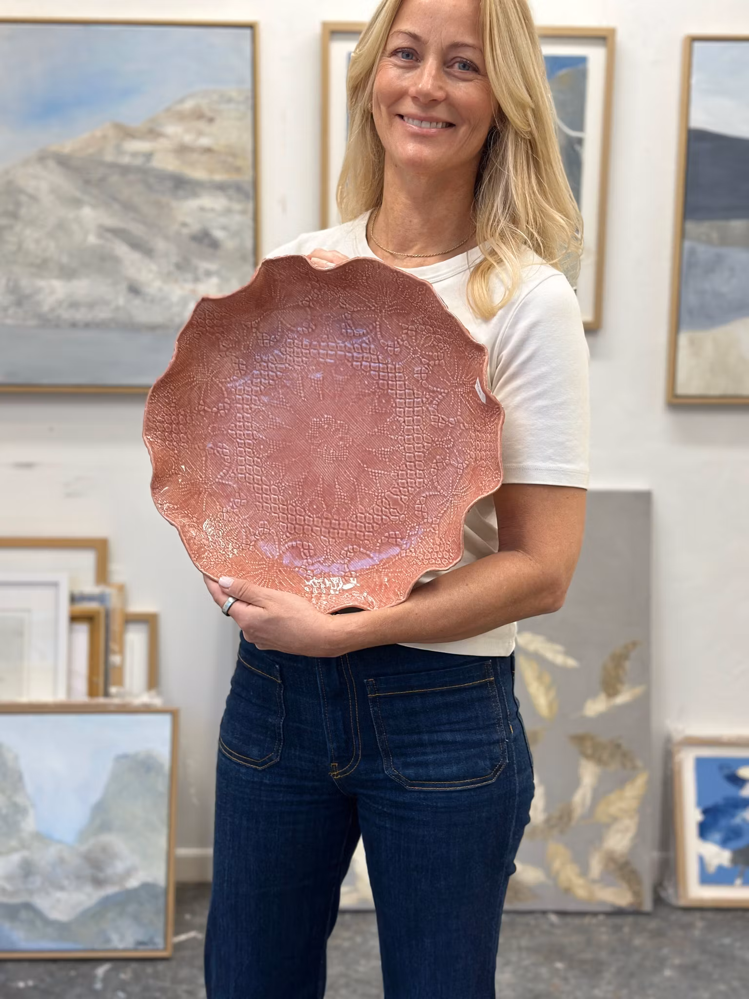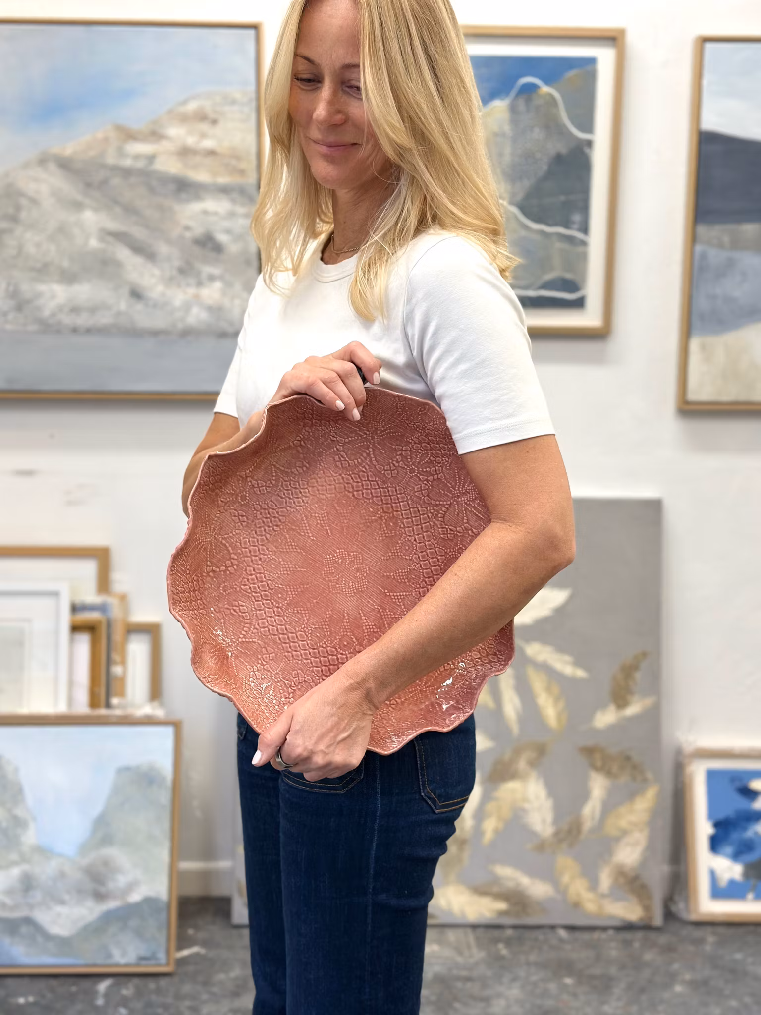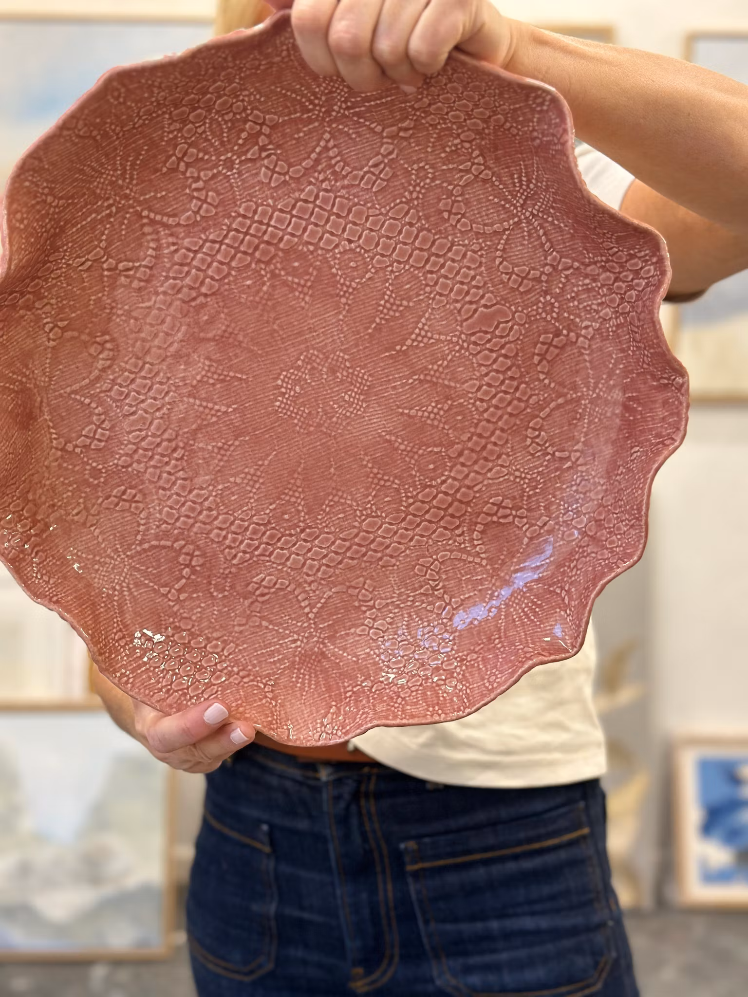 Stort fat med et vakkert avtrykk av en stor heklet duk med et flott mønster. Utenpå er det avtrykk av et stort sengeteppe