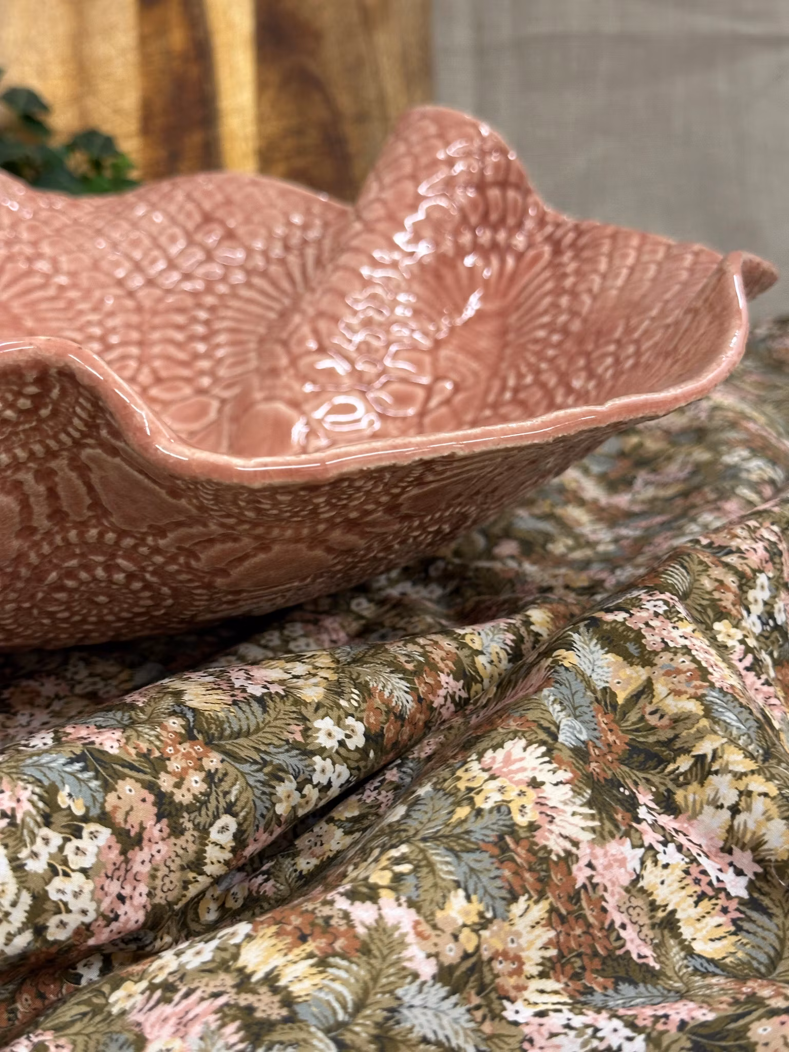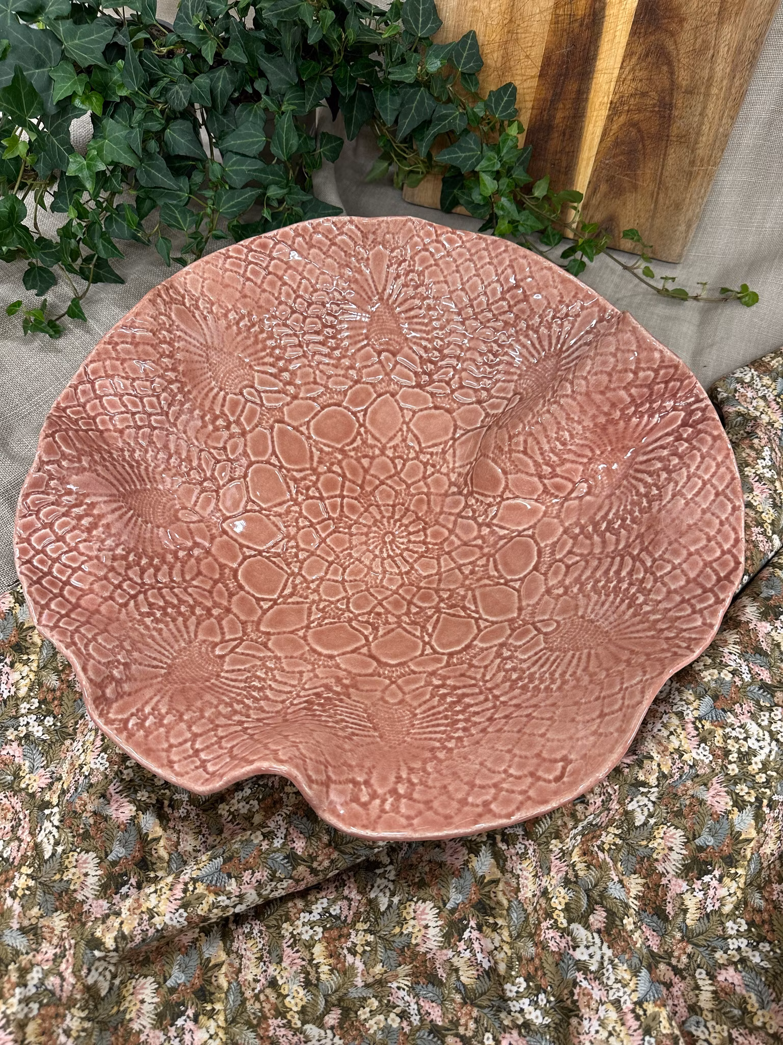 Stort flatt fat med avtrykk av en gamle heklet duk inni sentrert. Utenpå er det et heklet sengeteppe. Se så fine avtrykk sammen.