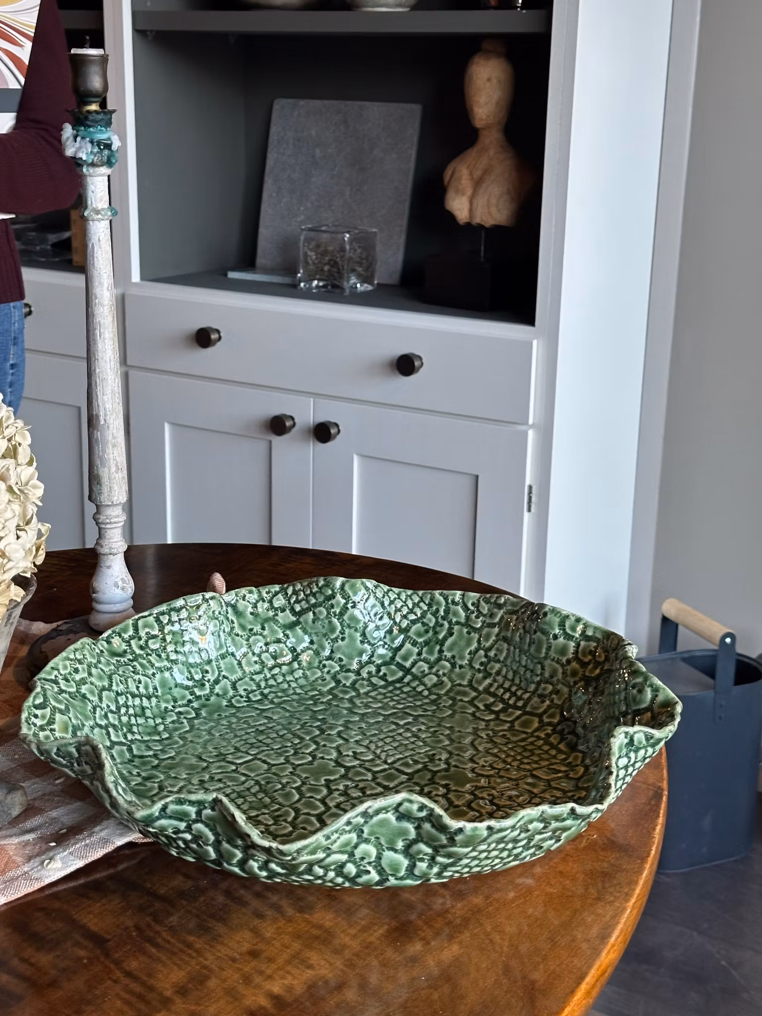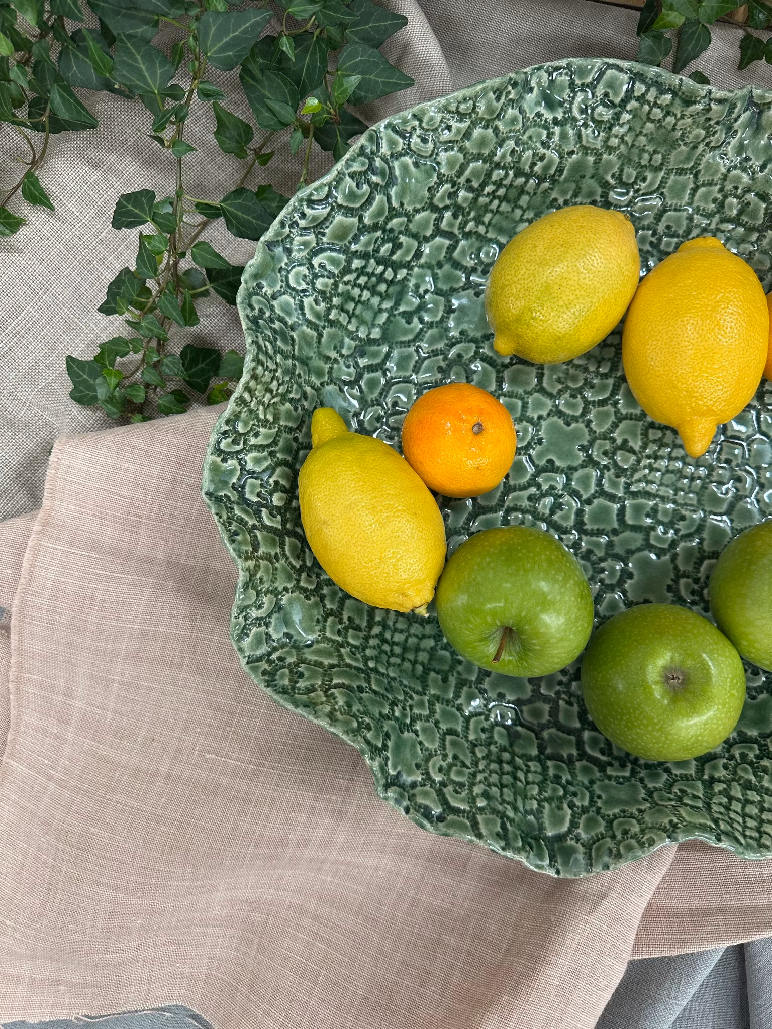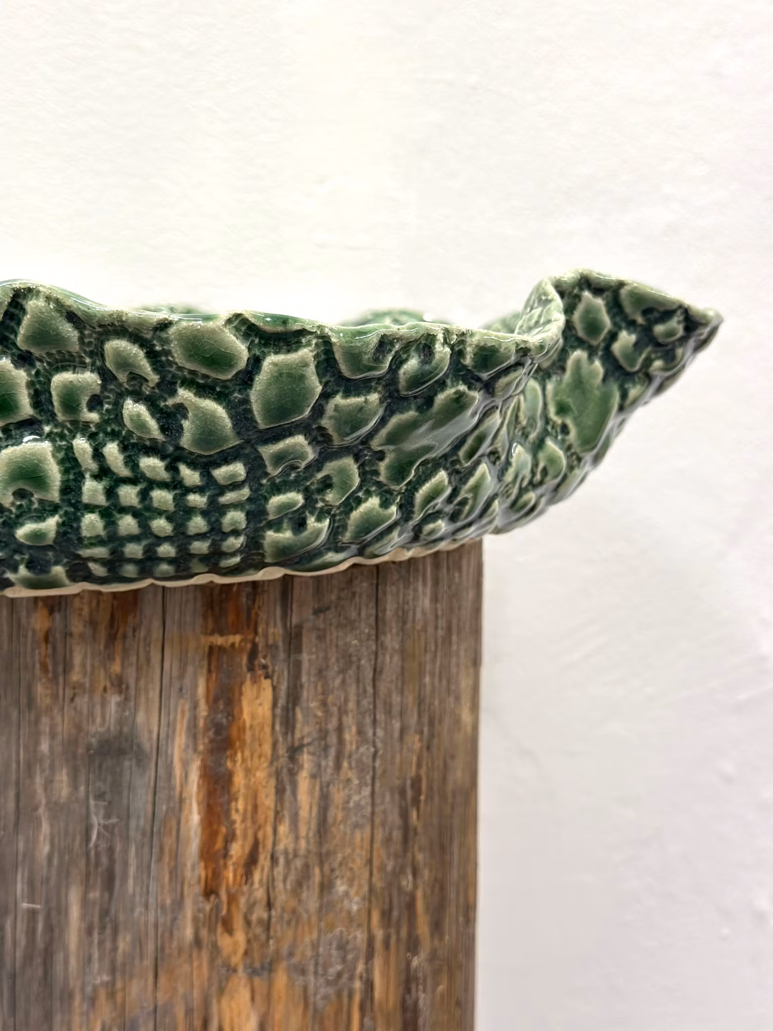Avtrykket på dette store fatet med flat bunn er fra et gammelt heklet sengeteppe som gir mye og dype avtrykk likt på begge sider så utrolig fint og den fineste fargen.