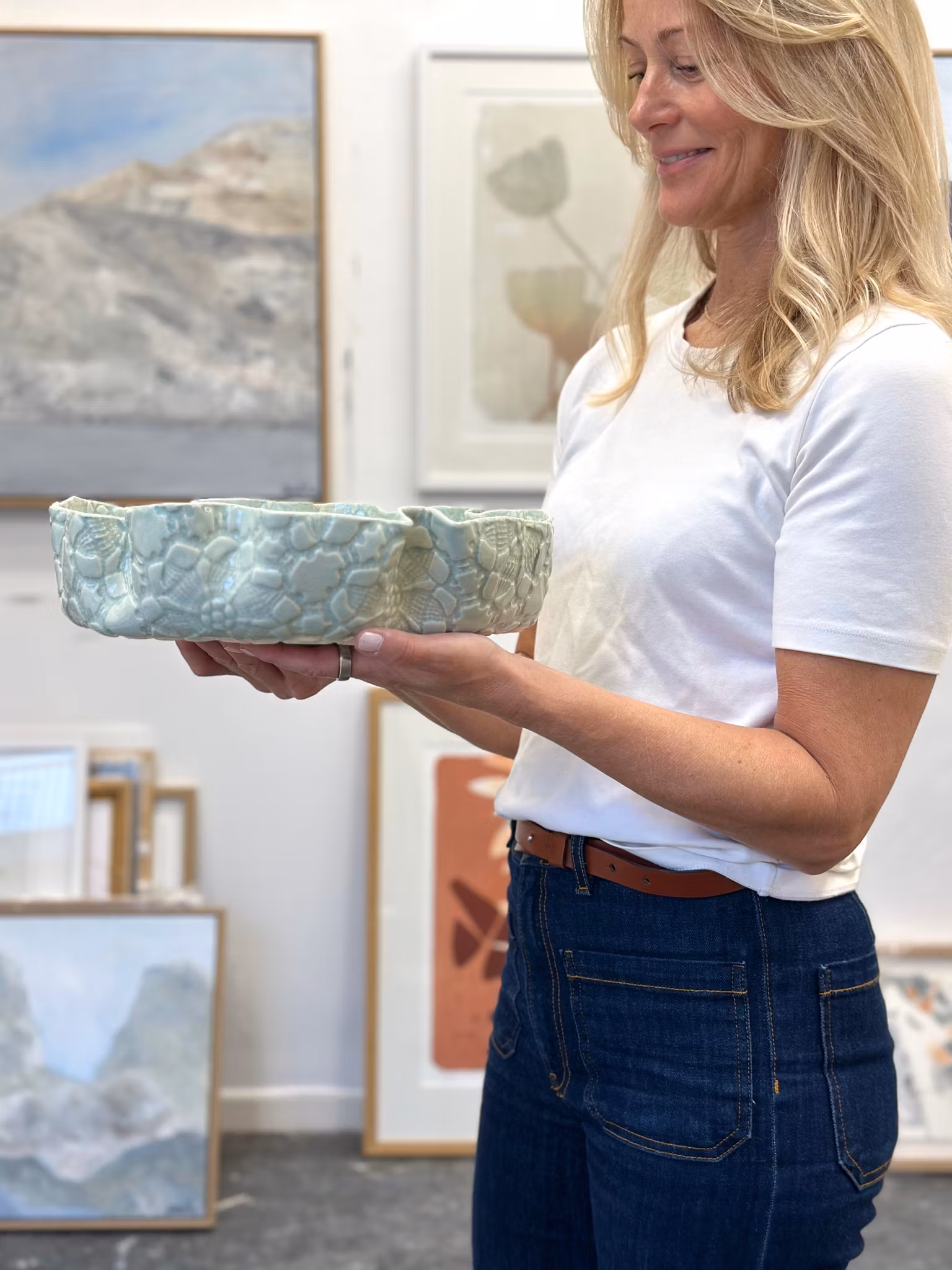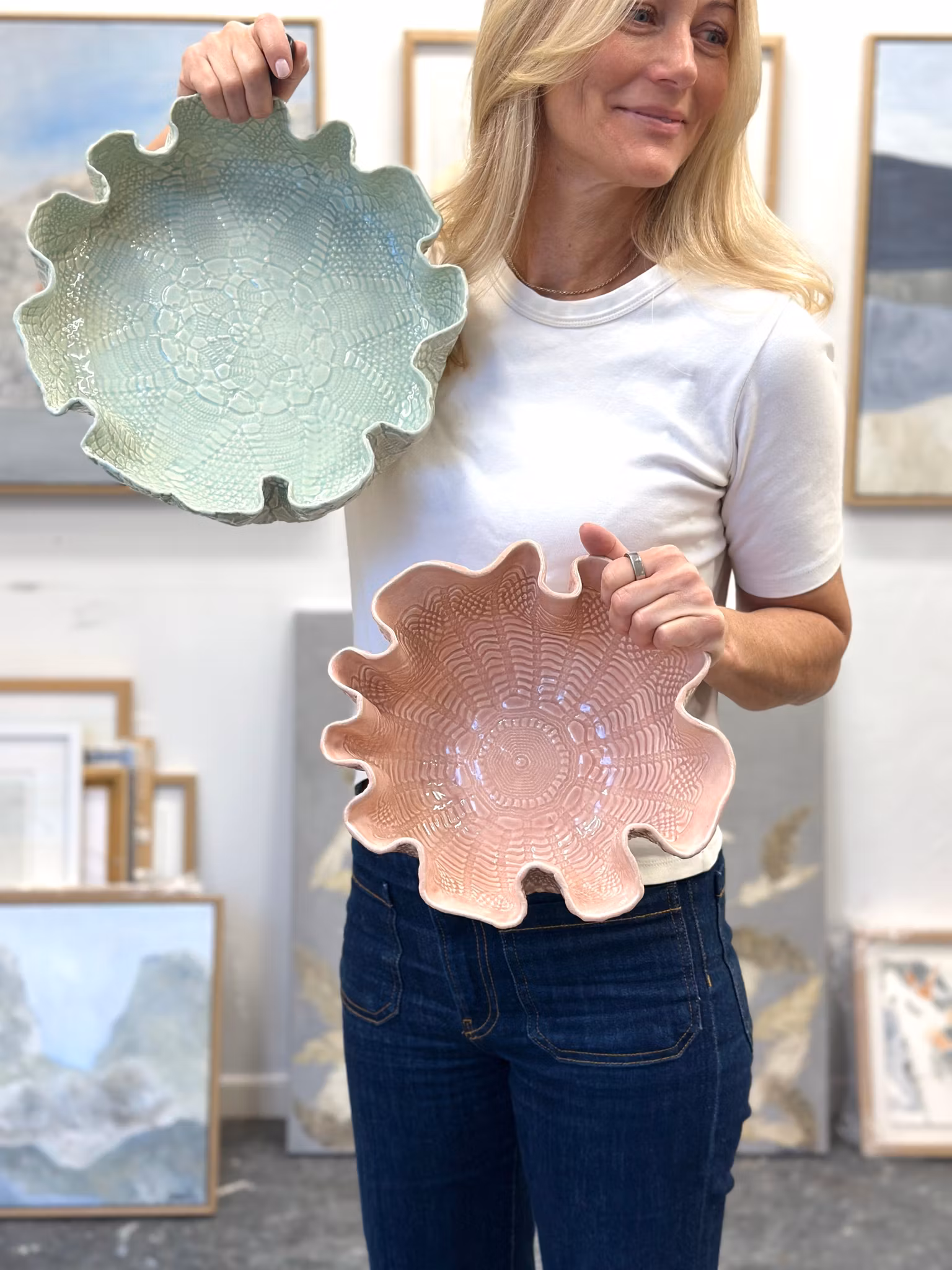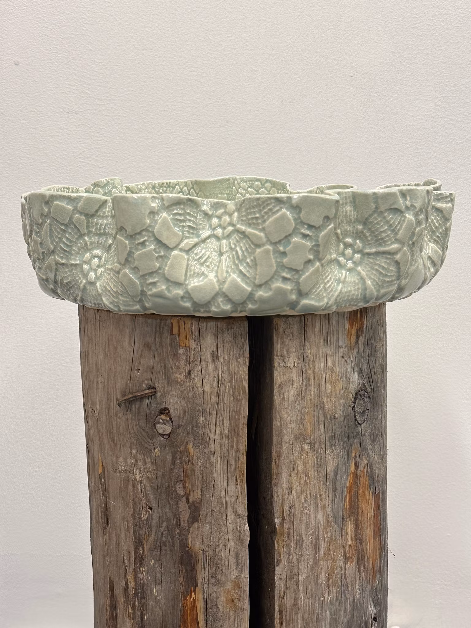 Stort fat med rett høy kant i organisk form. Avtrykket inni er fra heklet duk og utenpå et veldig fint sengeteppe som lager det vakreste mønster.