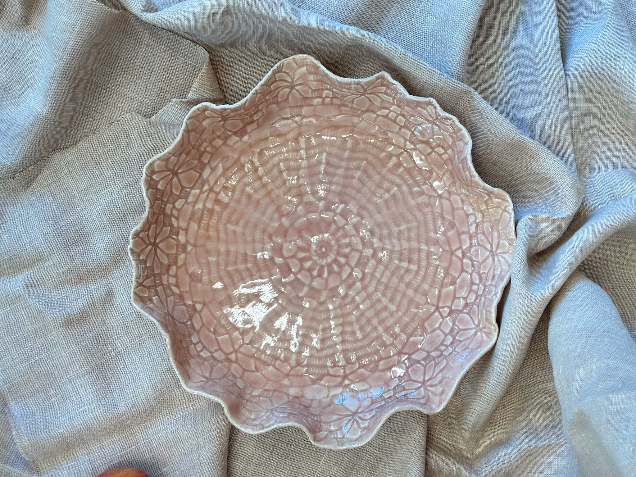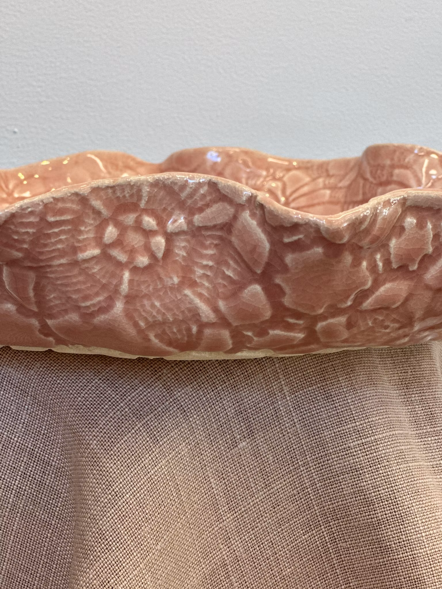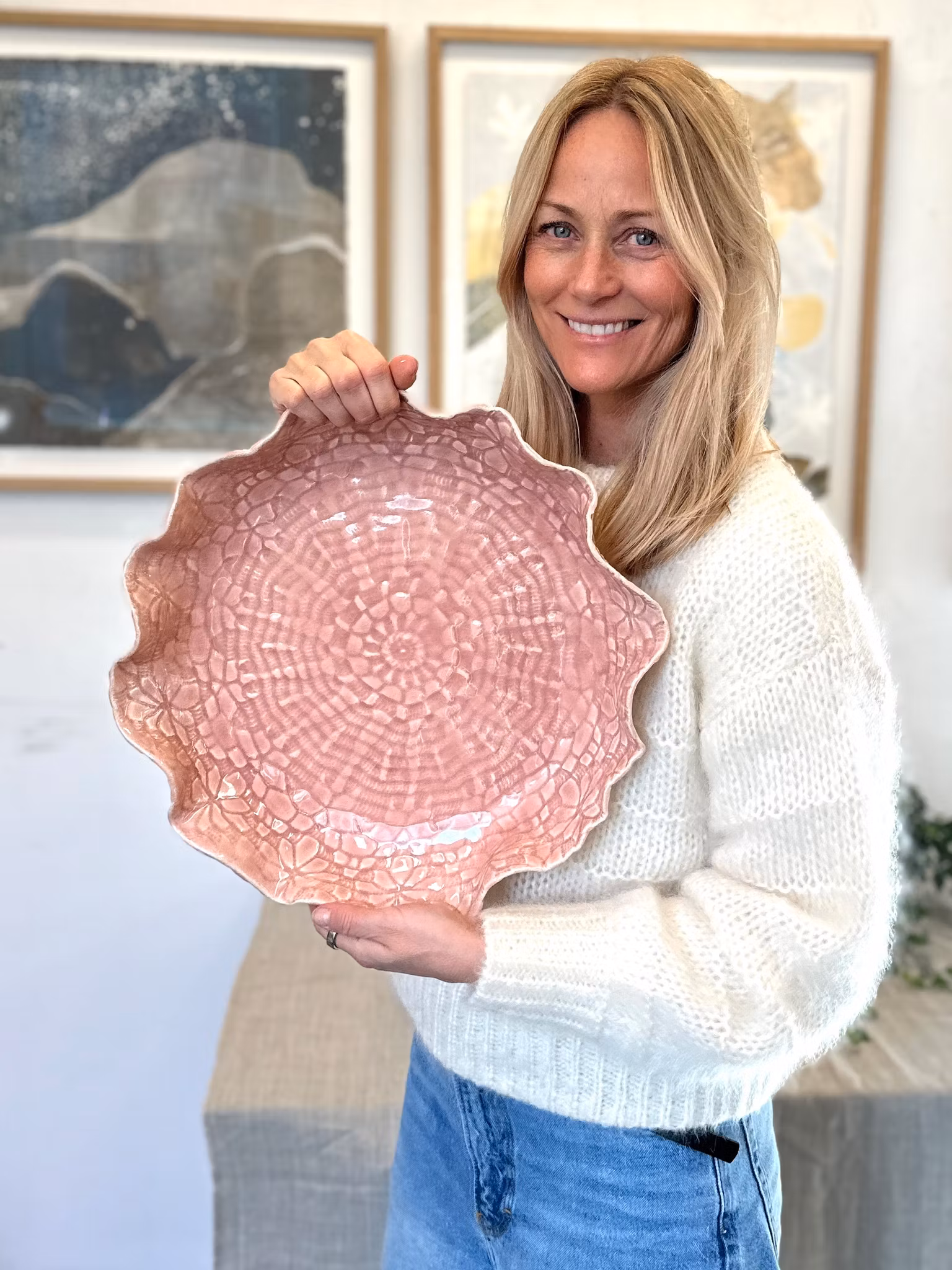 Stort fat i pudder. Fargen er bittelitt mørkere enn vanlig pudder da det er mye og dype avtrykk og derfor mer glasur. Veldig lekkert avtrykk og med også mye avtrykk utenpå som balanserer de to ulike avtrykkene