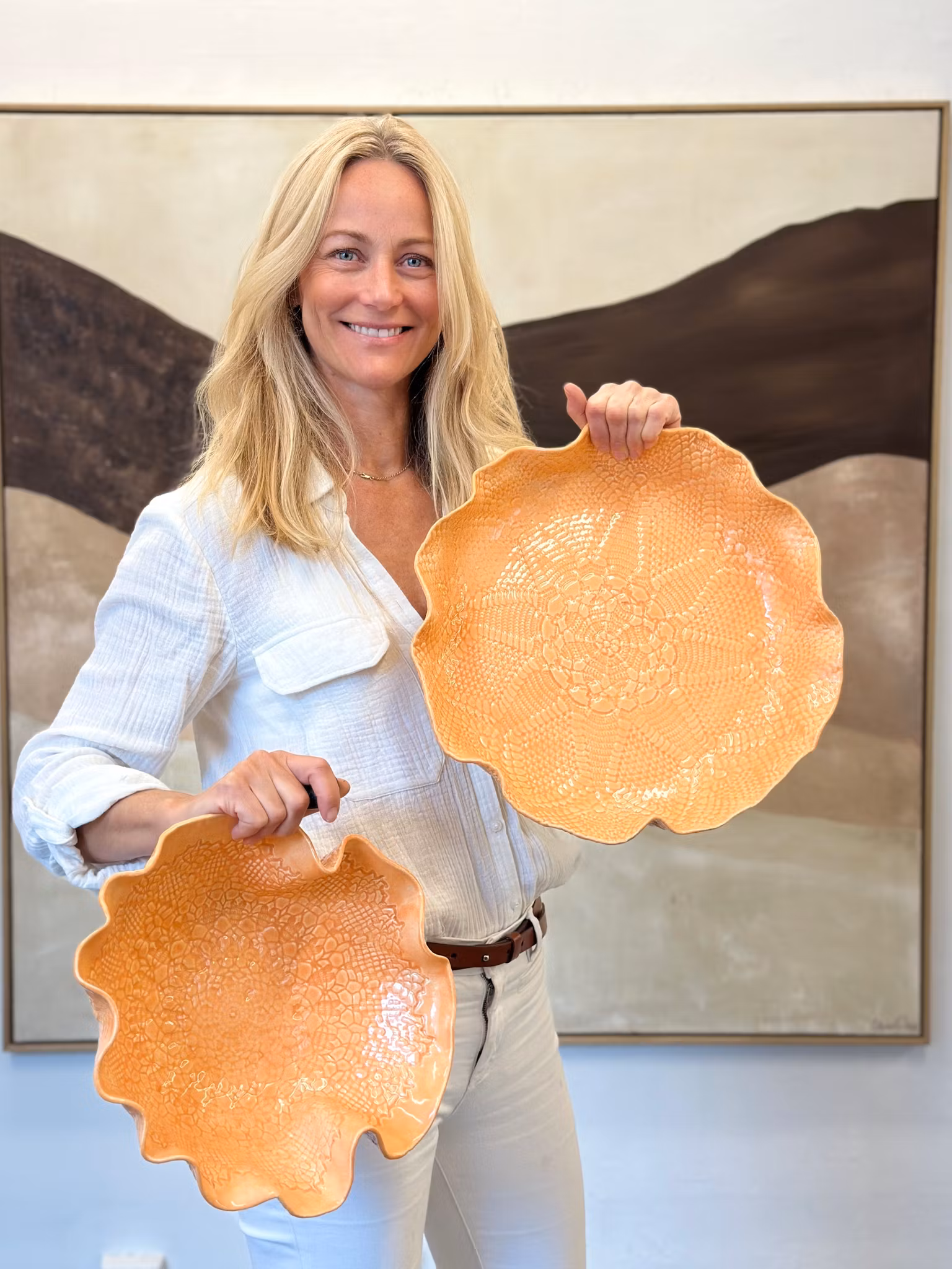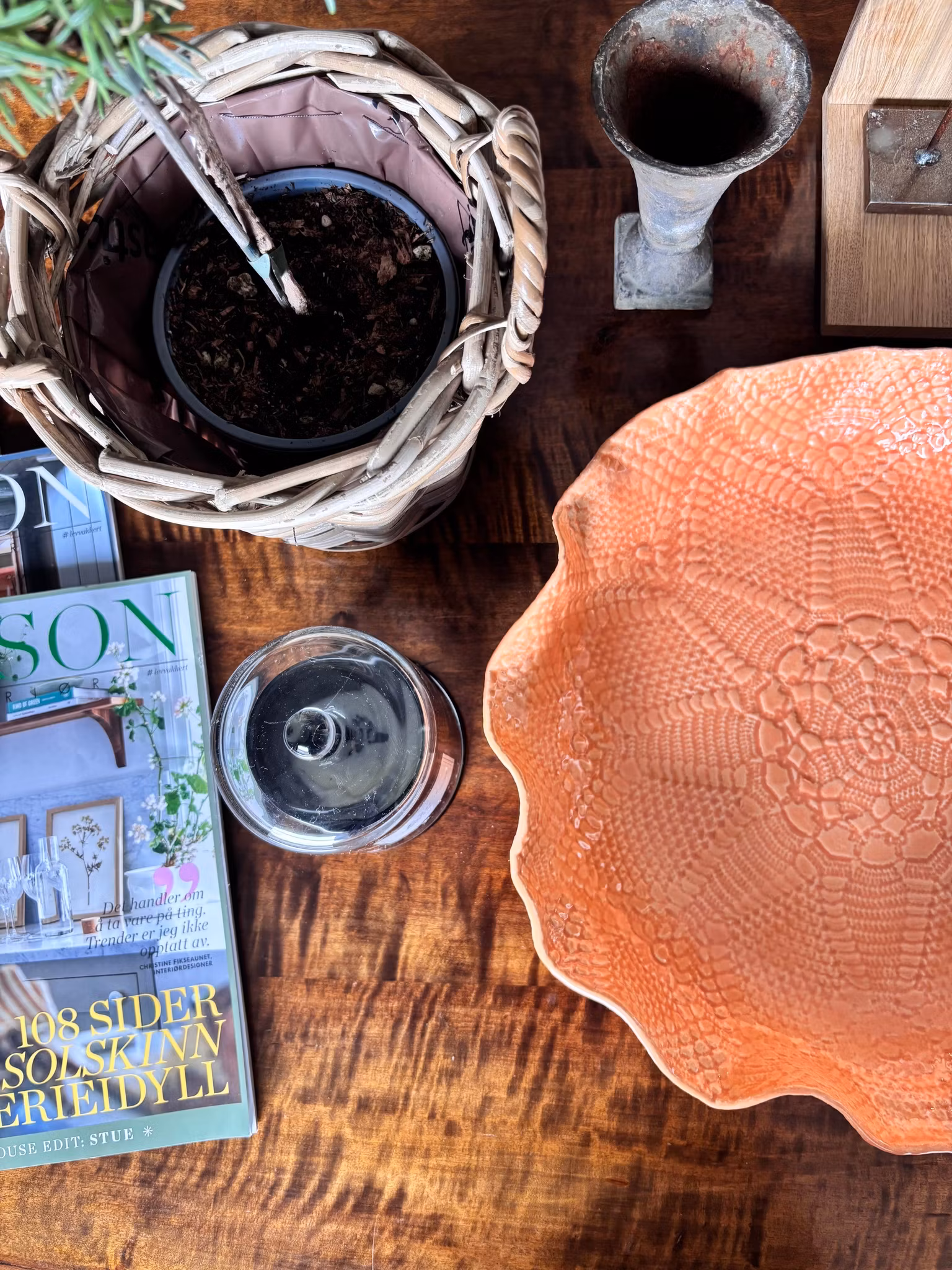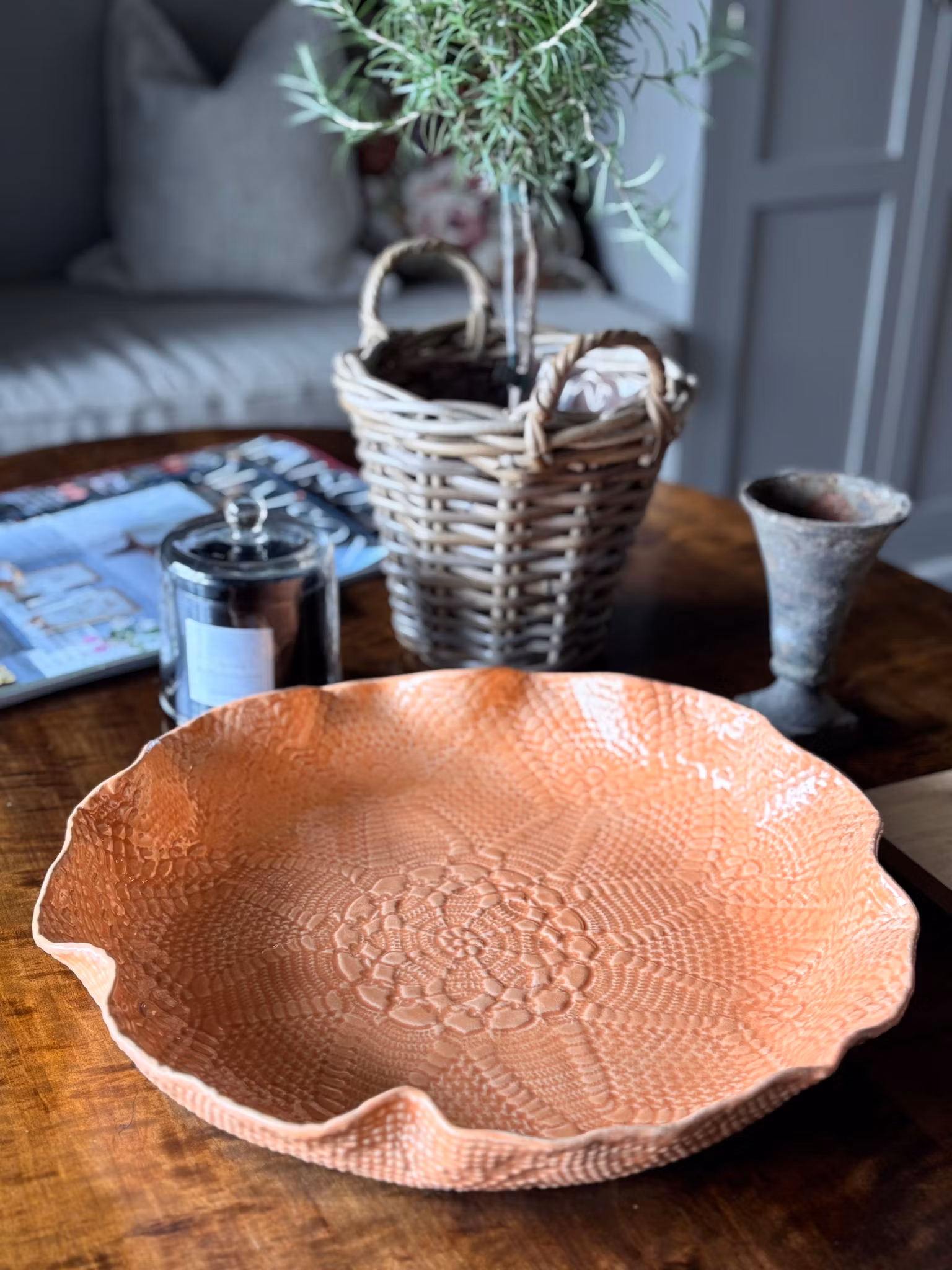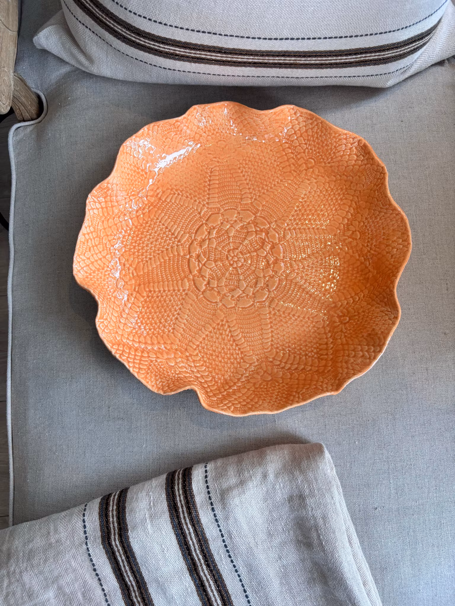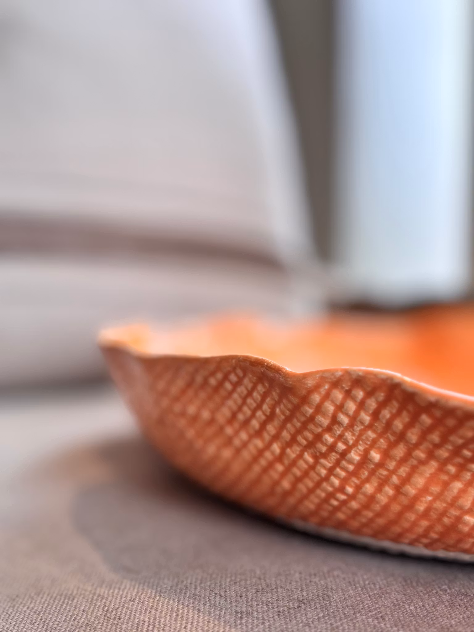Vakkert oransje fat med nydelig mønster. En lys oransje farge som passer godt til vår og sommer.