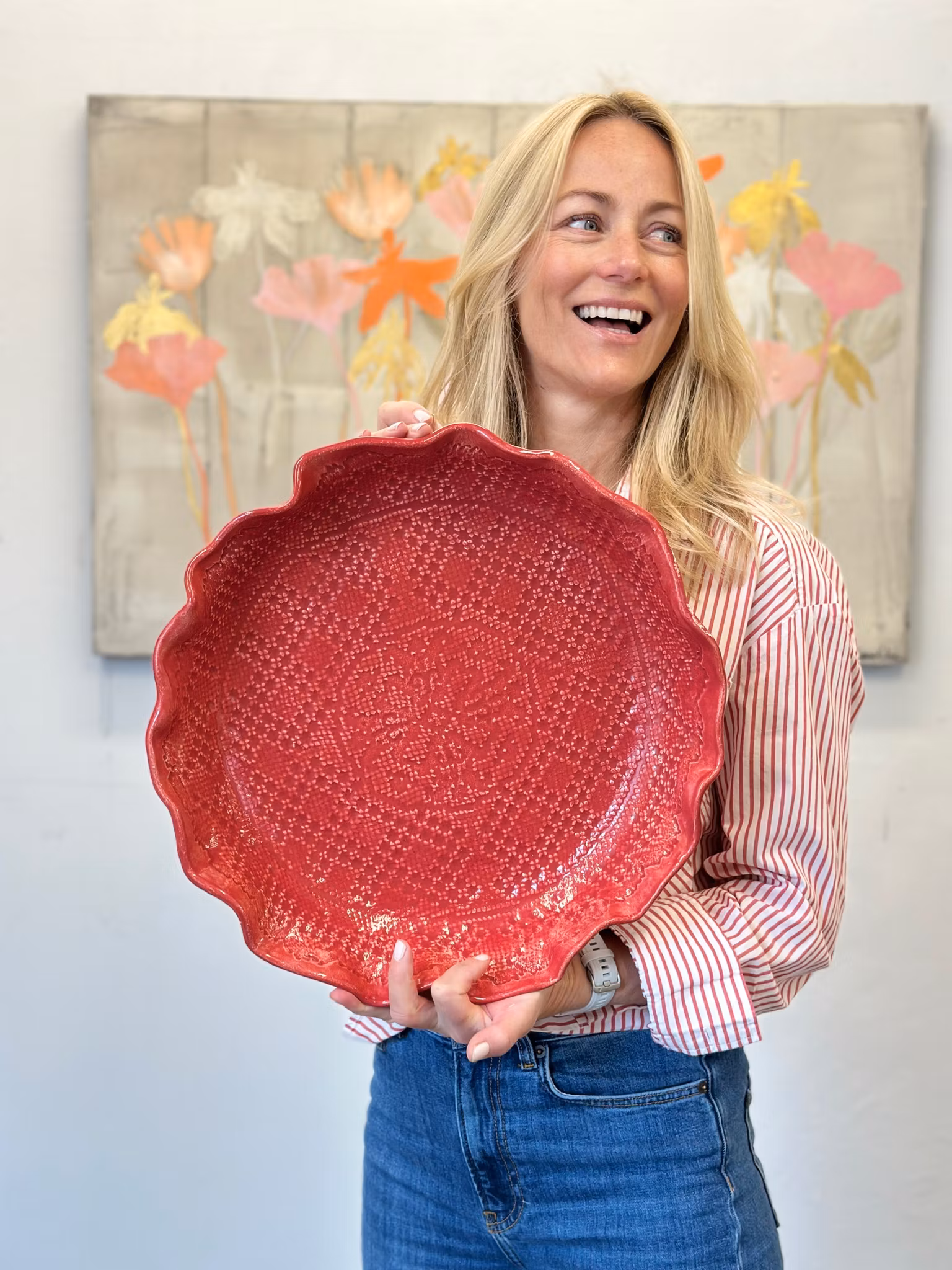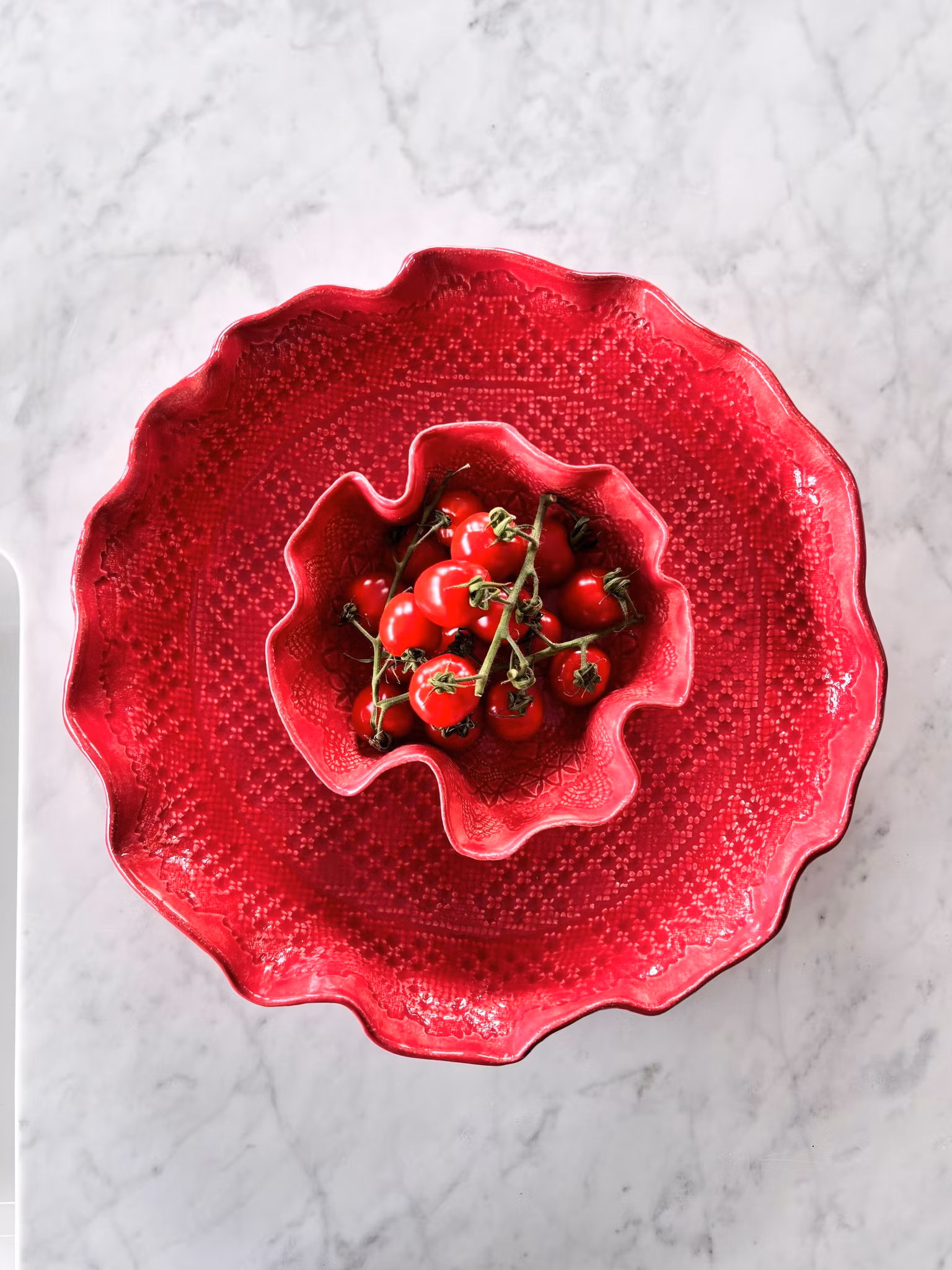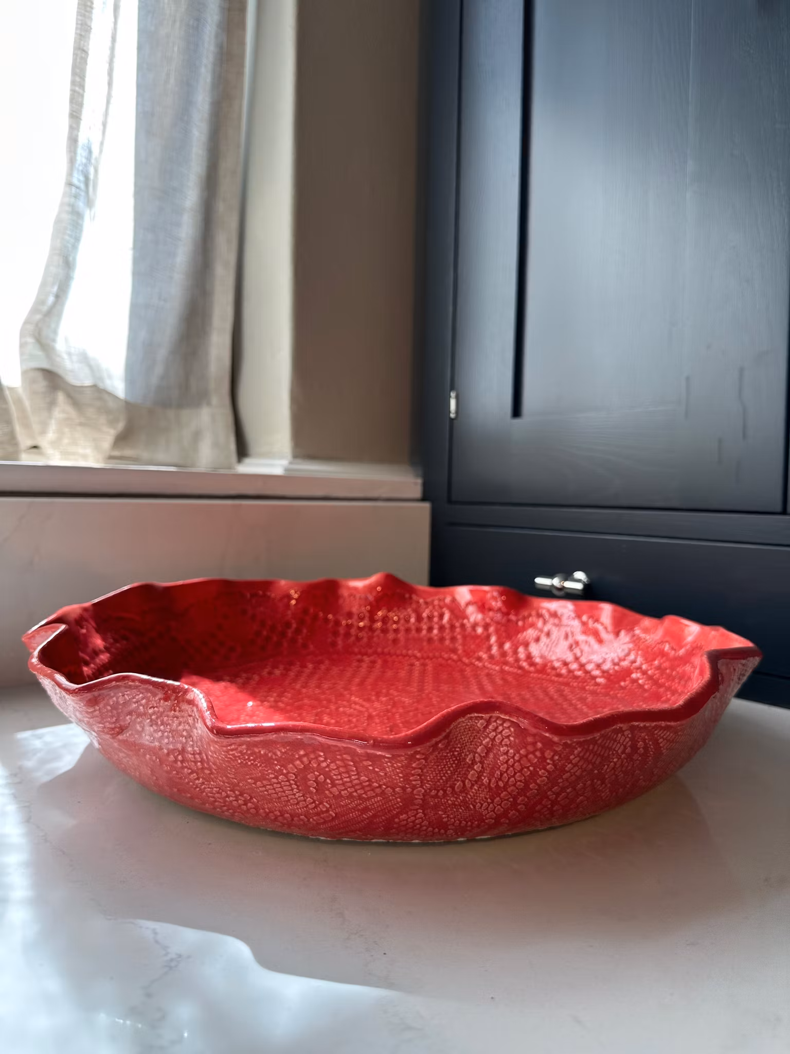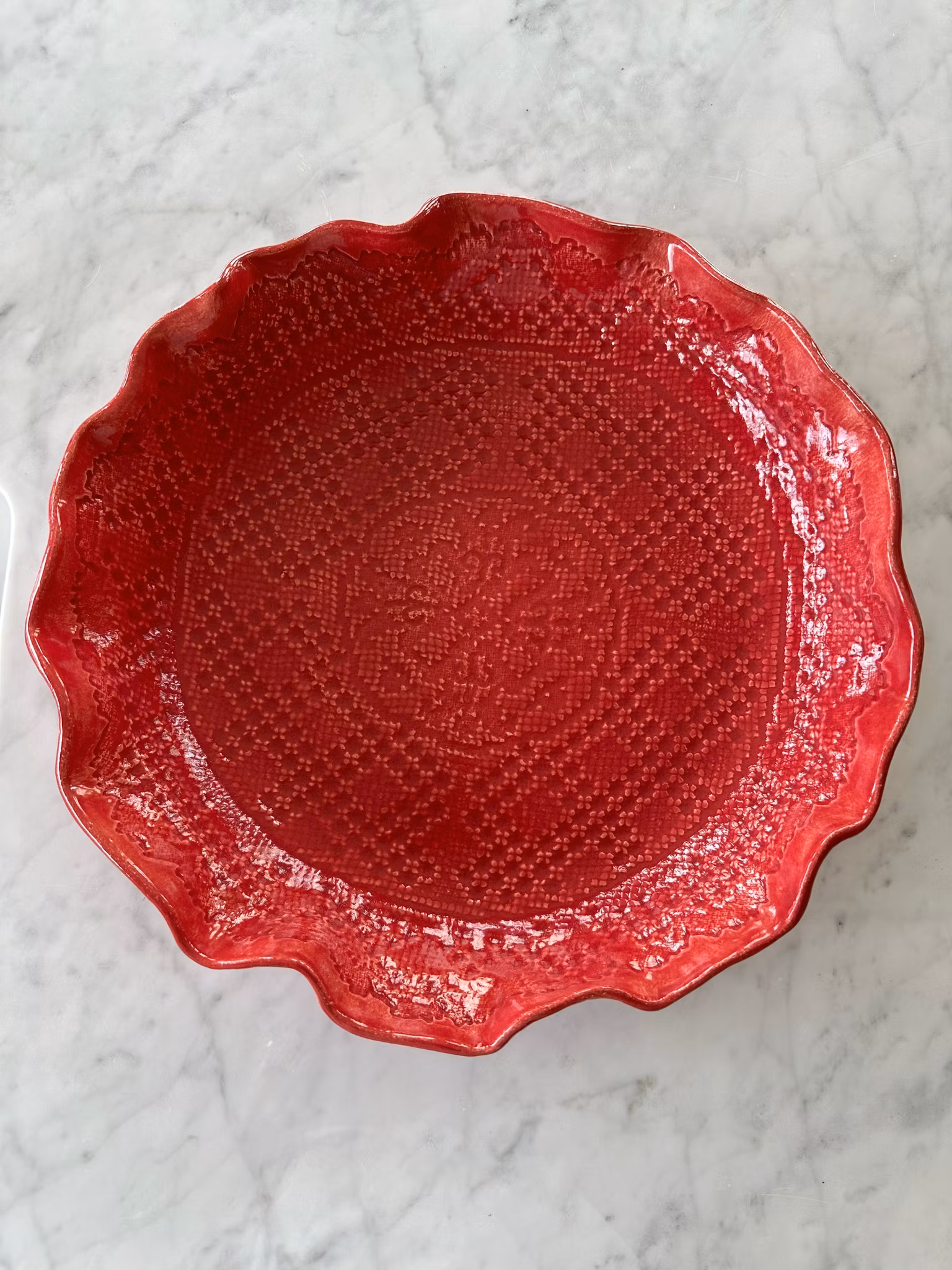 Vakkert stort rødt fat med mønster på både innside. Passer til servering av matretter, frukt og dekor.