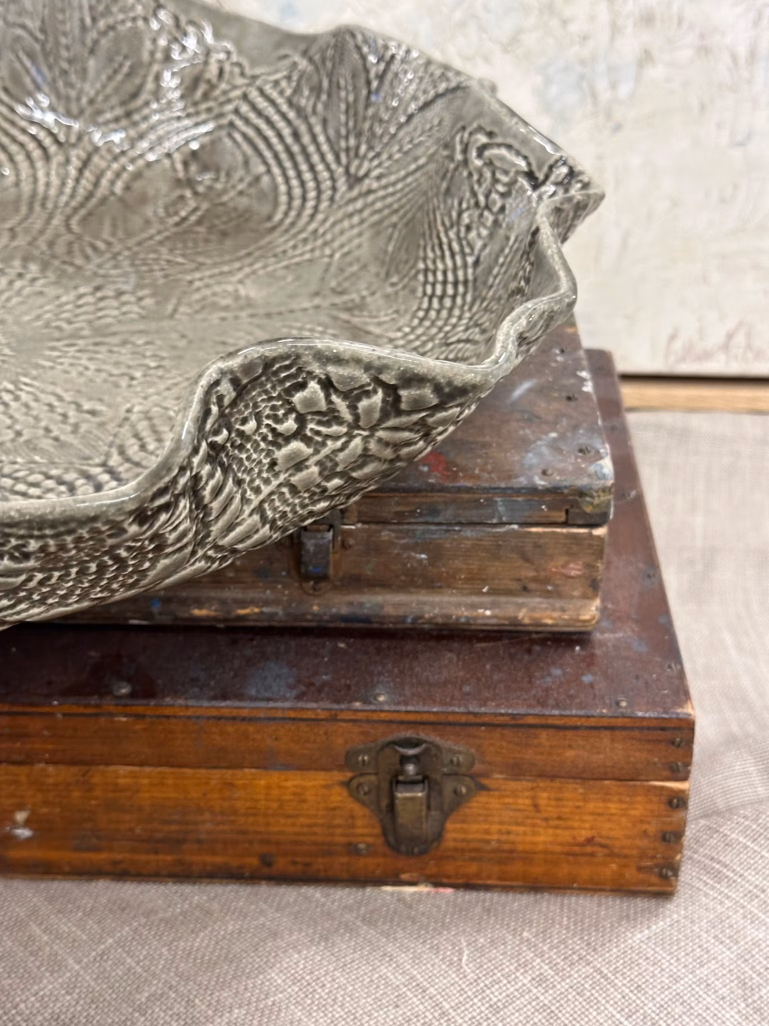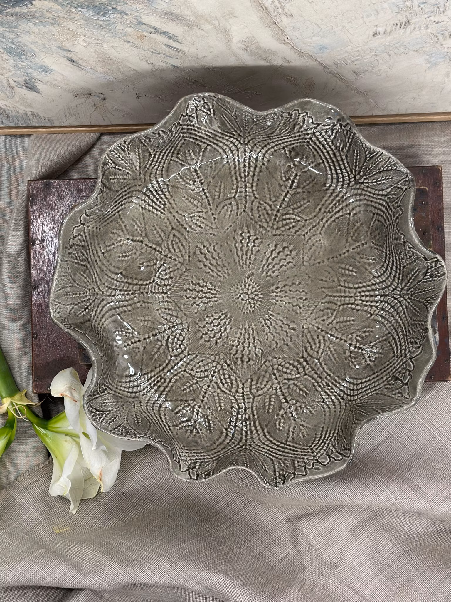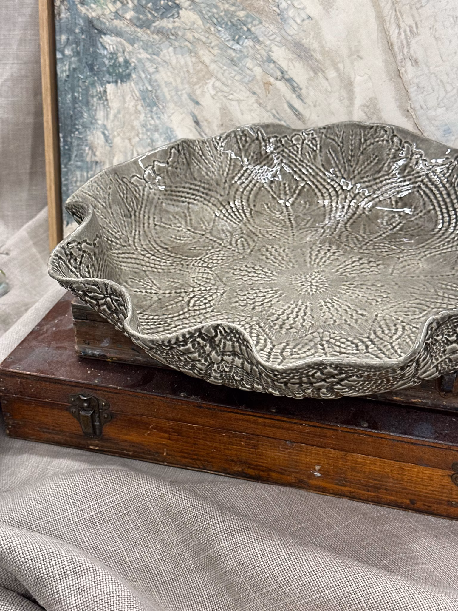 Stort flatt fat med nydelig organisk form med sentrert avtrykk av en lekkert sart duk inni. Utenpå er det mye struktur fra et sengeteppe.