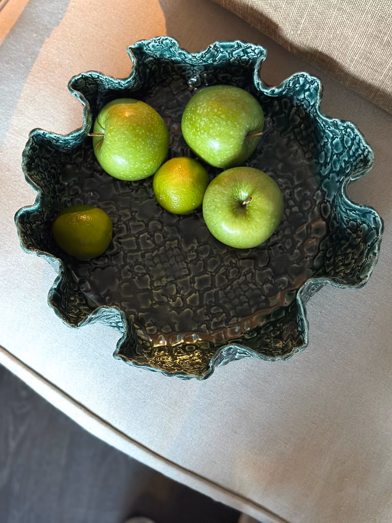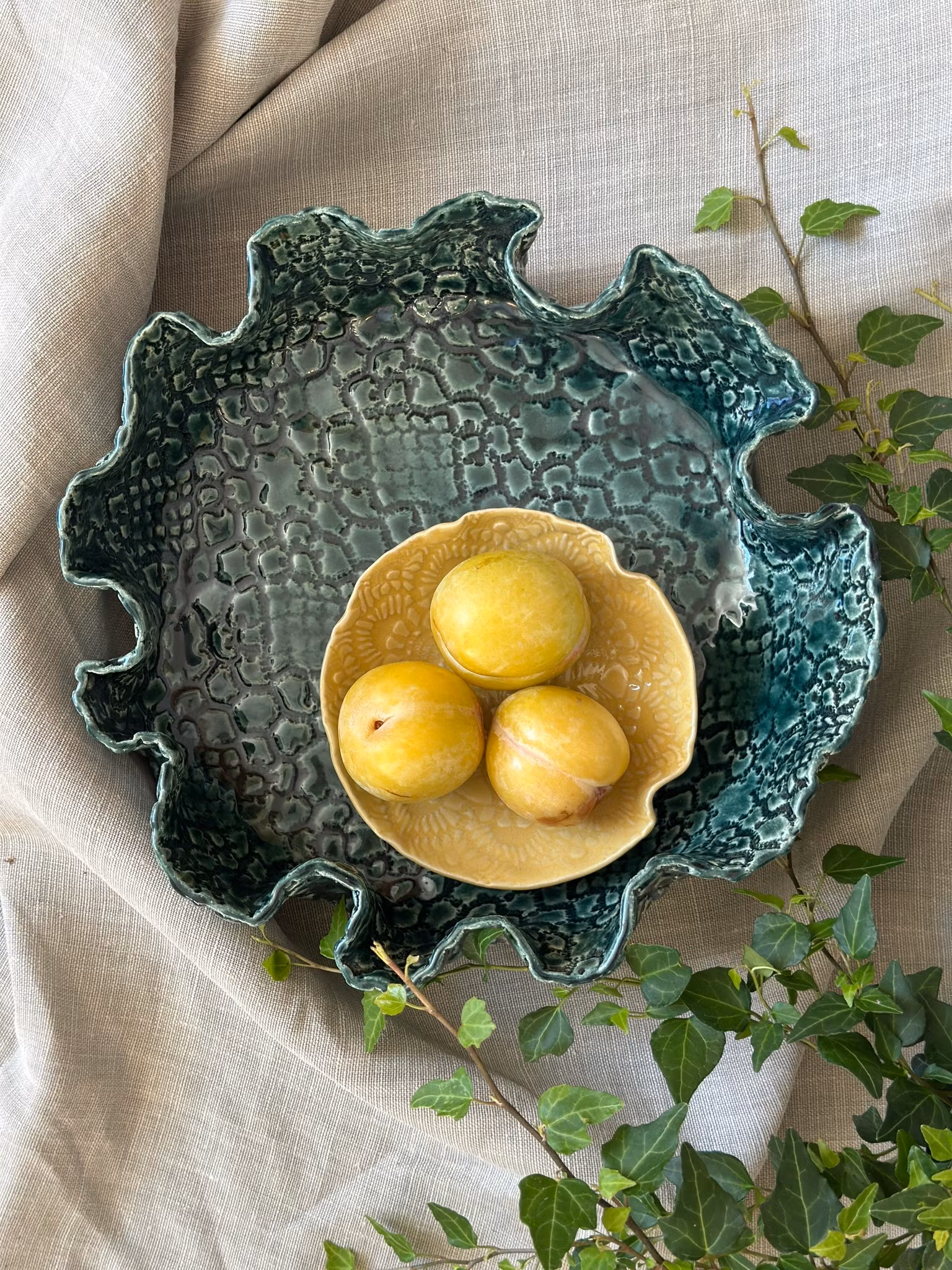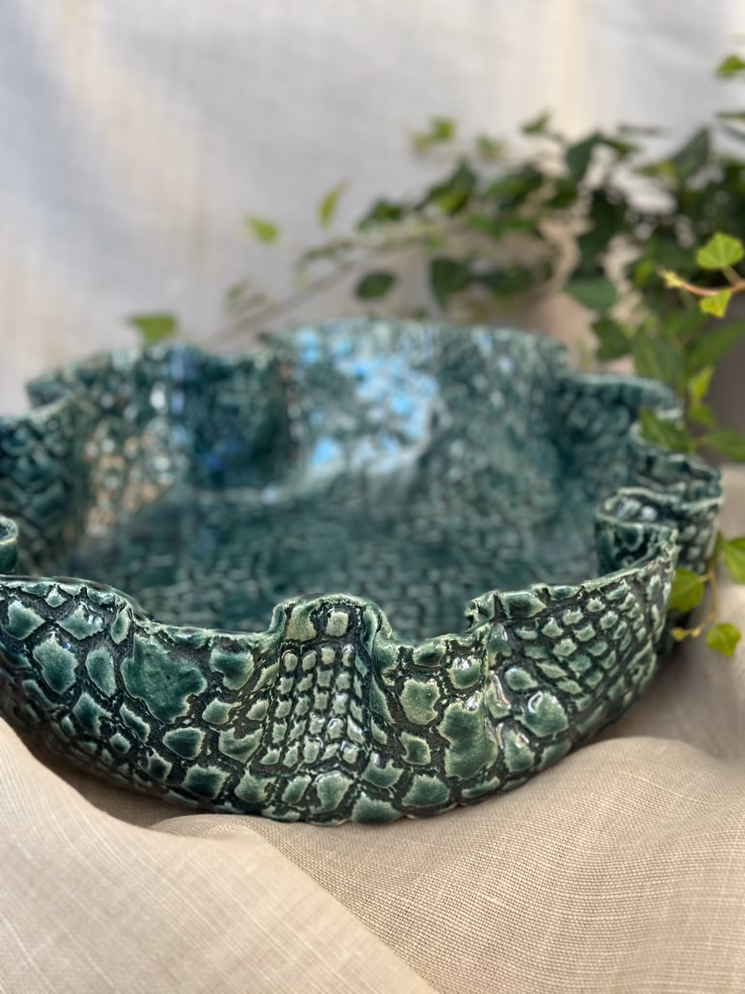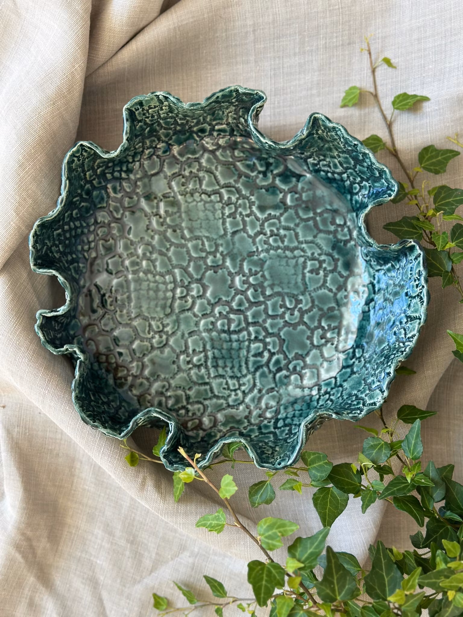 Et stort fat med høy rett kant med avtrykk av et gammelt heklet sengeteppe fra vårt småbruk på Hvaler - Sekkevika som ble bygget i 1840. Sengeteppe brukt på Stabburet og jeg har kjøpt det på markedet i Gamlebyen i Fredrikstad. Samme mønster på begge sider.