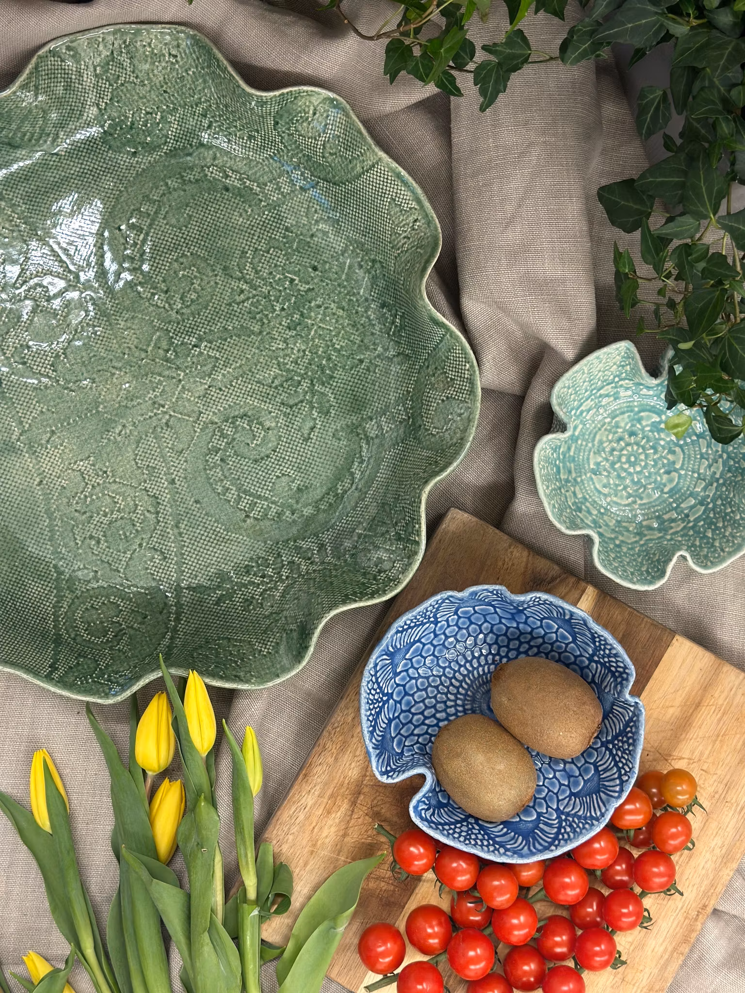 Stort lekkert fat i smoke hvor jeg har brukt en en hel ny hekleduk med et litt sartere mønster og lettere avtrykk som gir en litt lysere jade-farge. Nydelig. Utenpå er det avtrykk fra en gammel gardin.