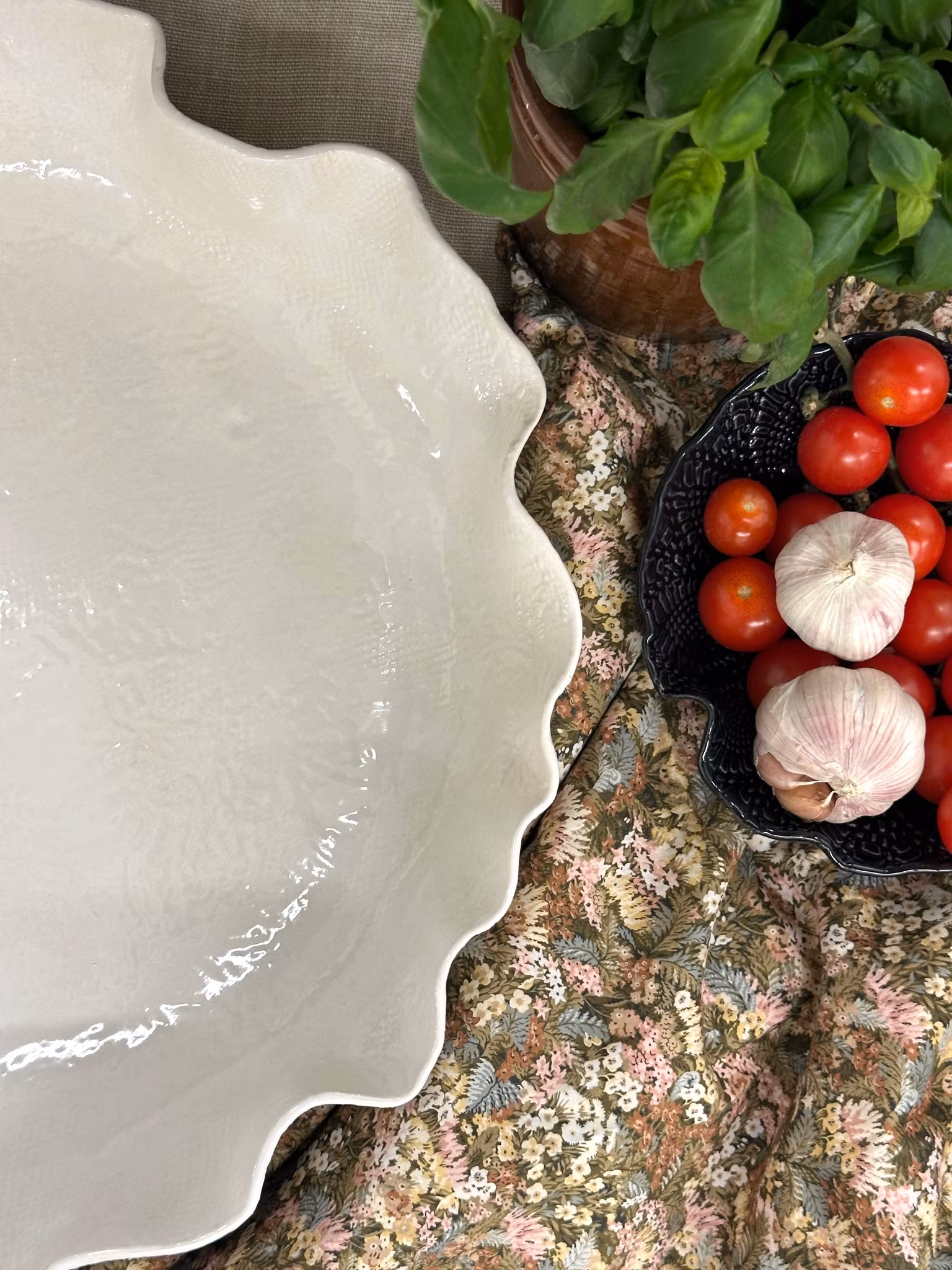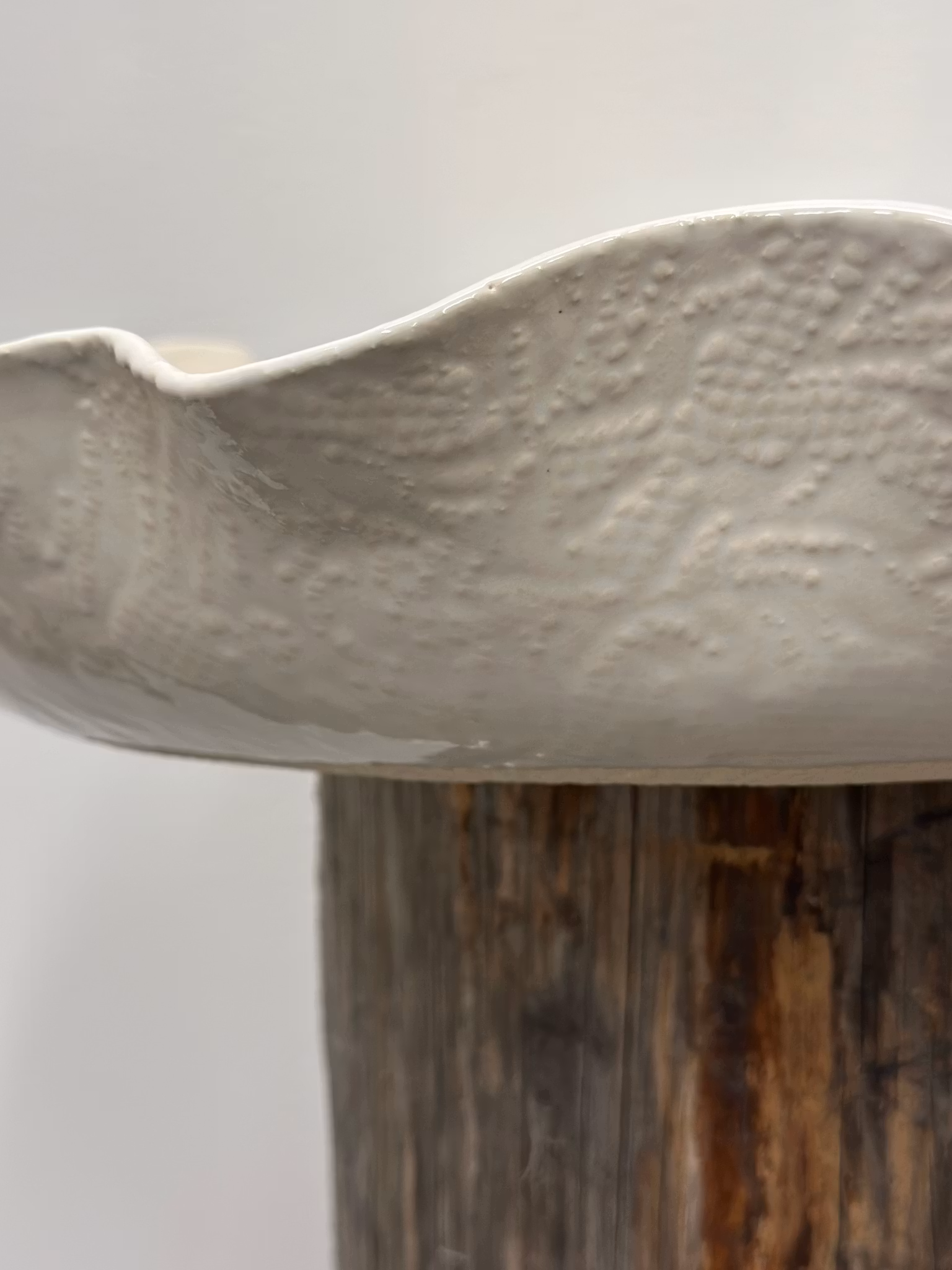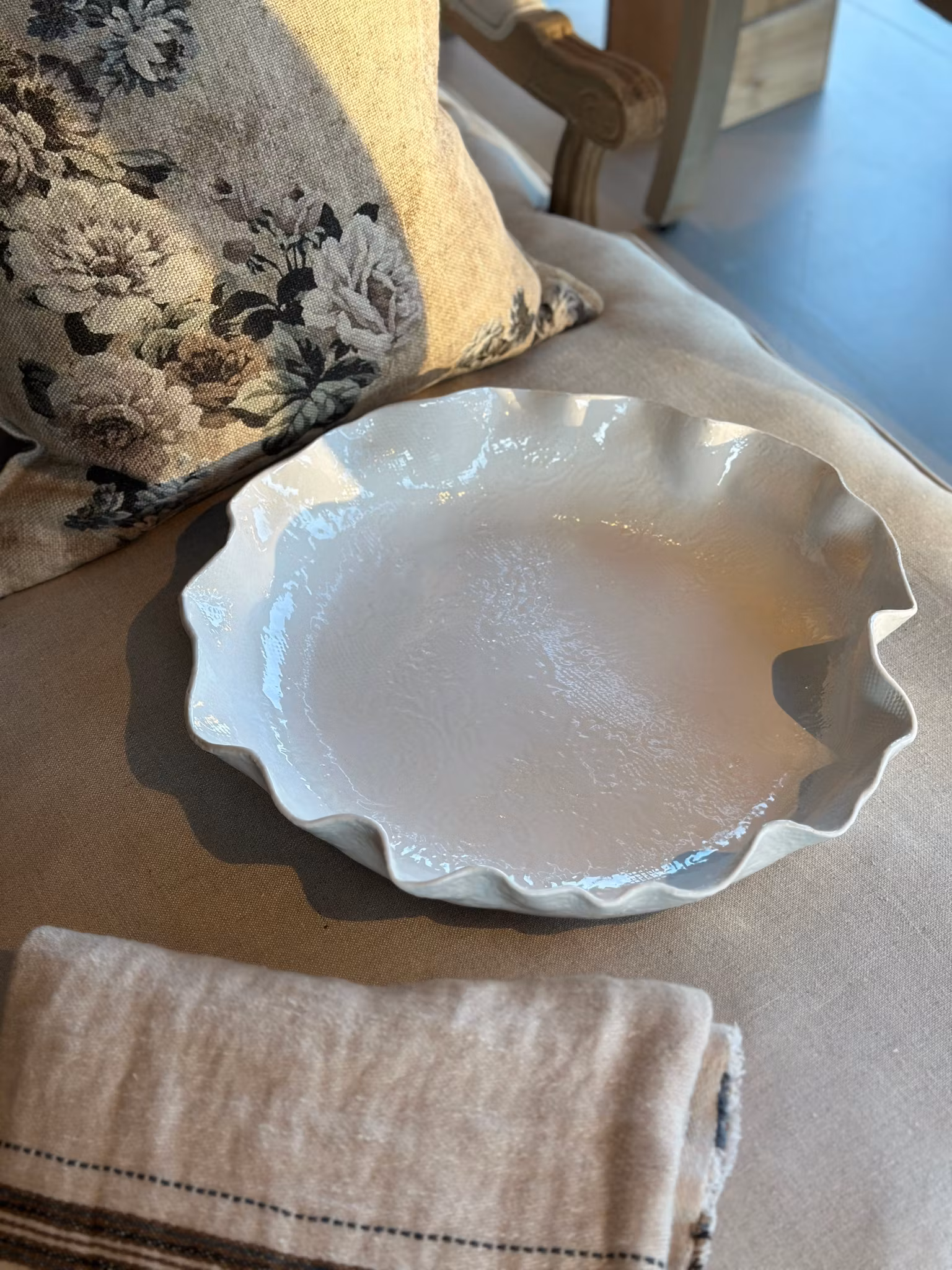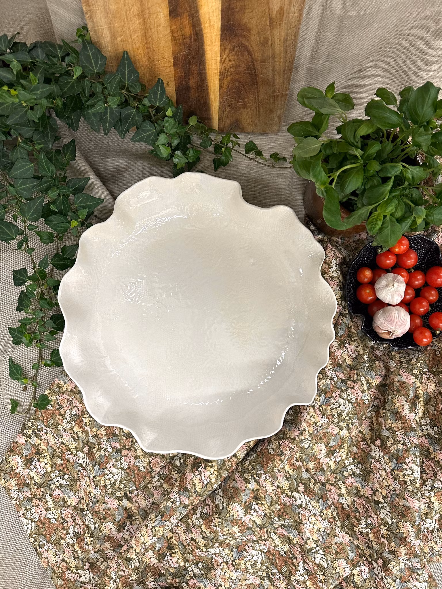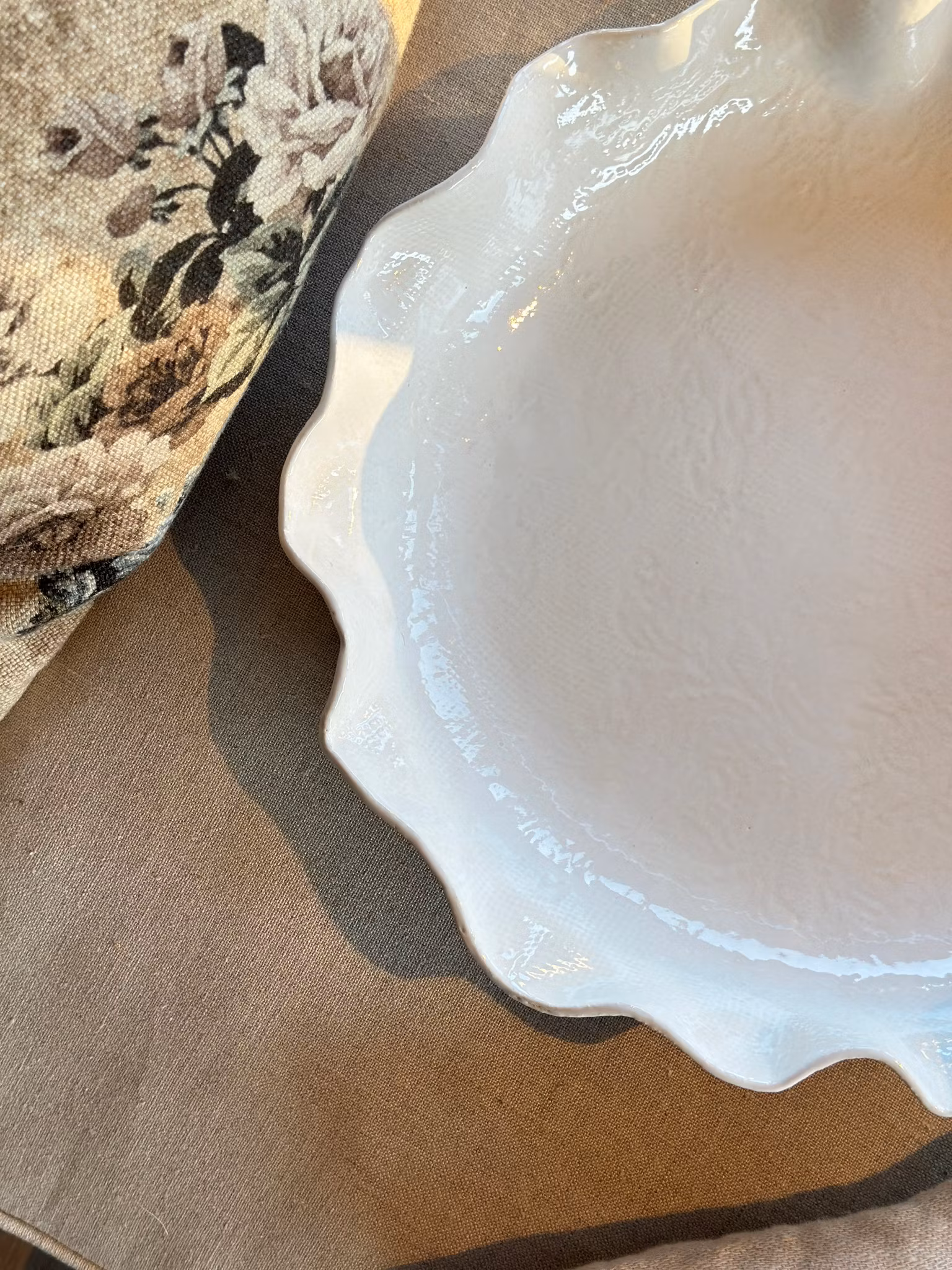 Stort flatt fat med avtrykk av en gammelt gardin på begge sider. Siden det er glasert med hvitt er det ikke veldig tydelig mønster, men det er så sart og fint med det duse mønsteret. Se på bilder og zoom gjerne.