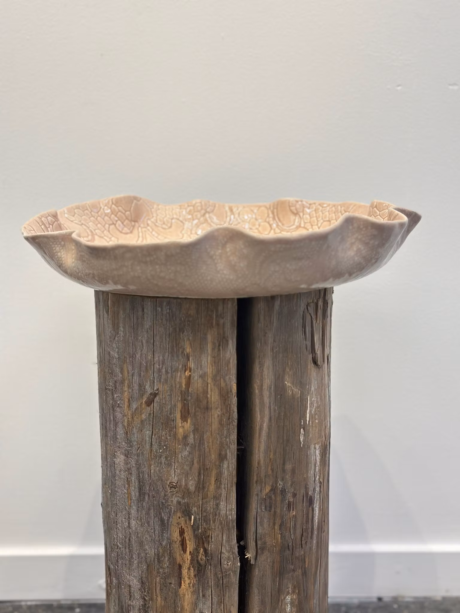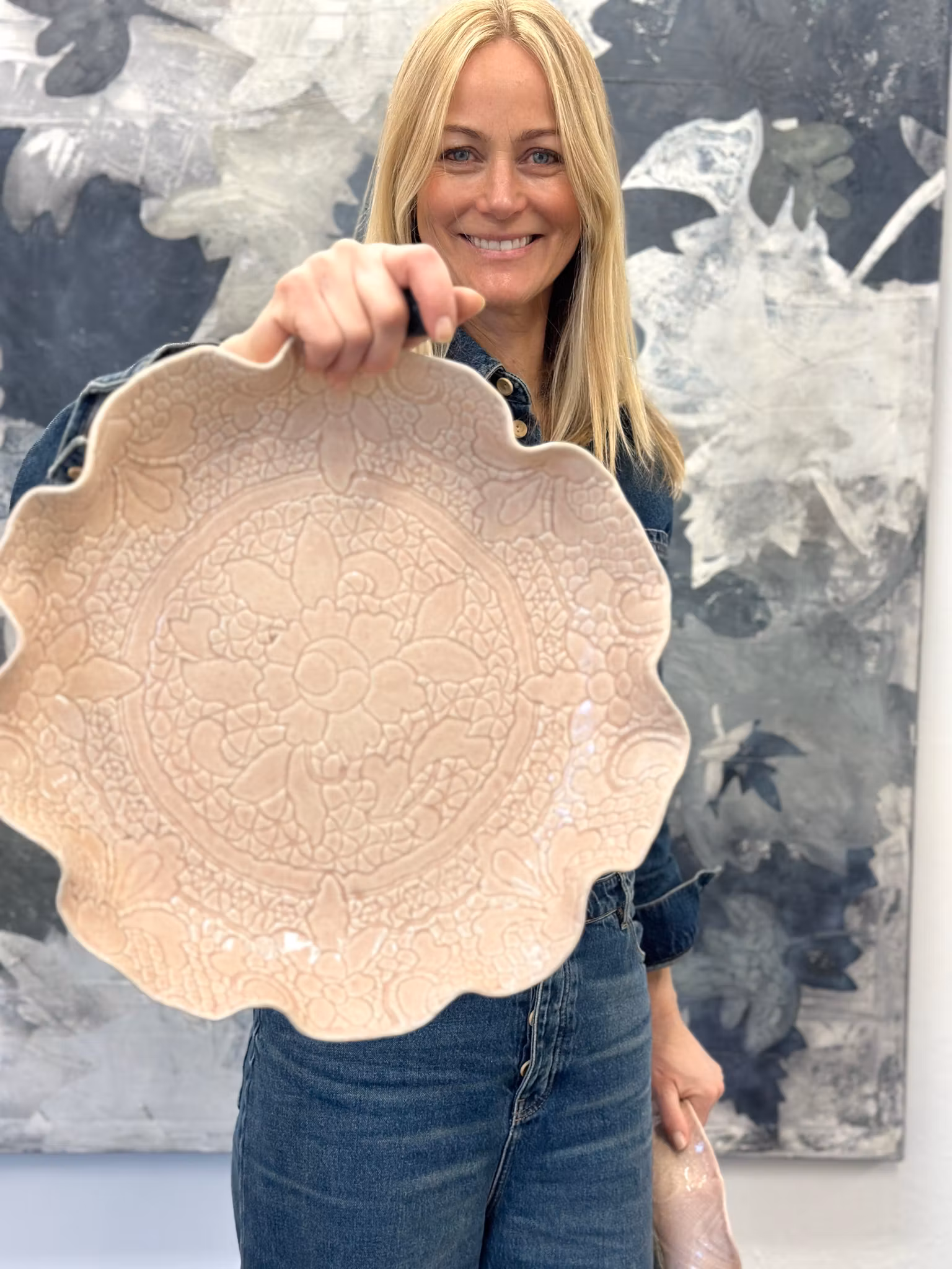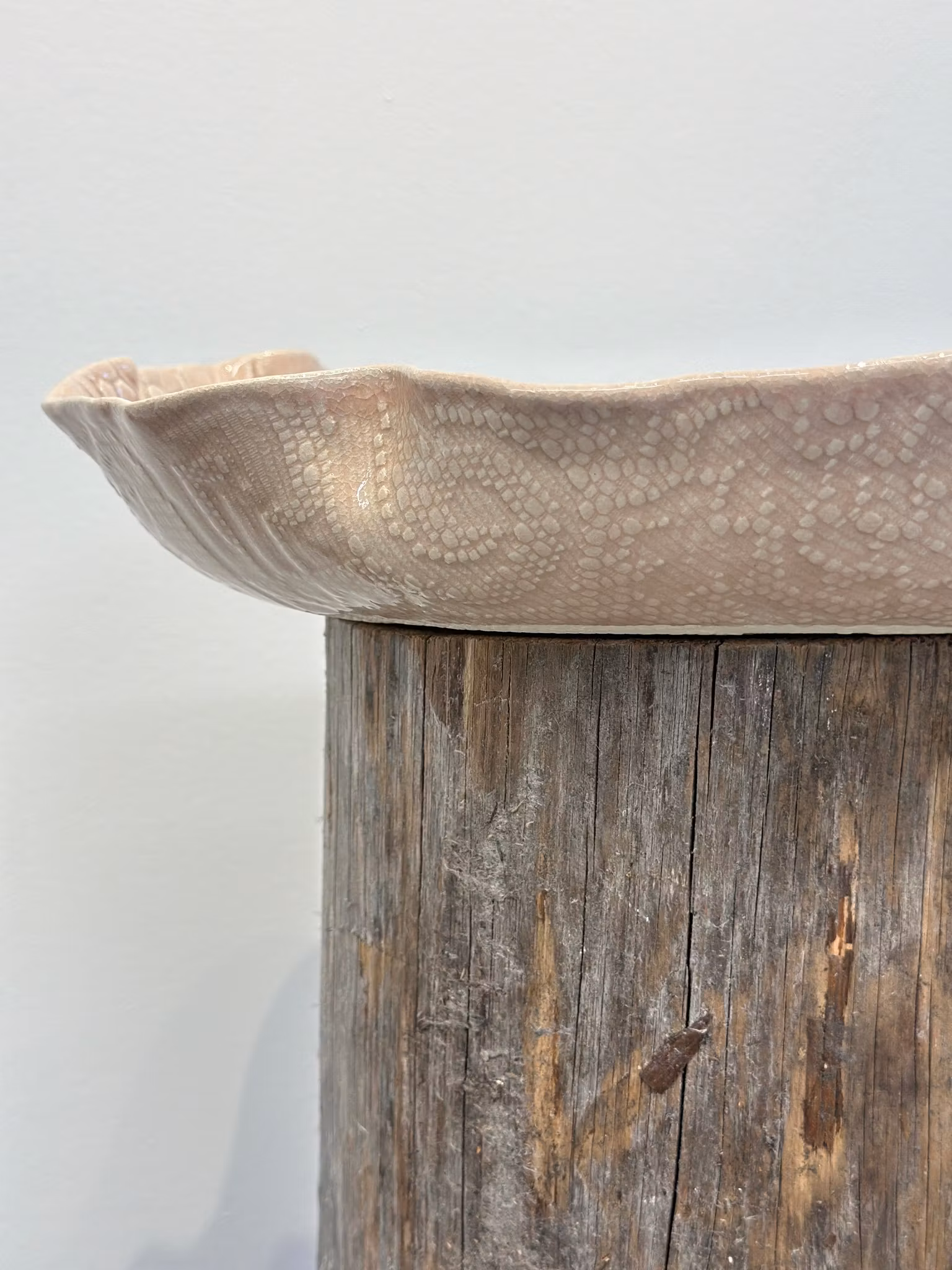 Et nydelig fat med et nydelig avtrykk. Fargen pudder er litt vanskelig å ta foto av, men er lys rosa. Riktig farge der jeg holder fatet. Utenpå er det avtrykk fra en gammel gardin.