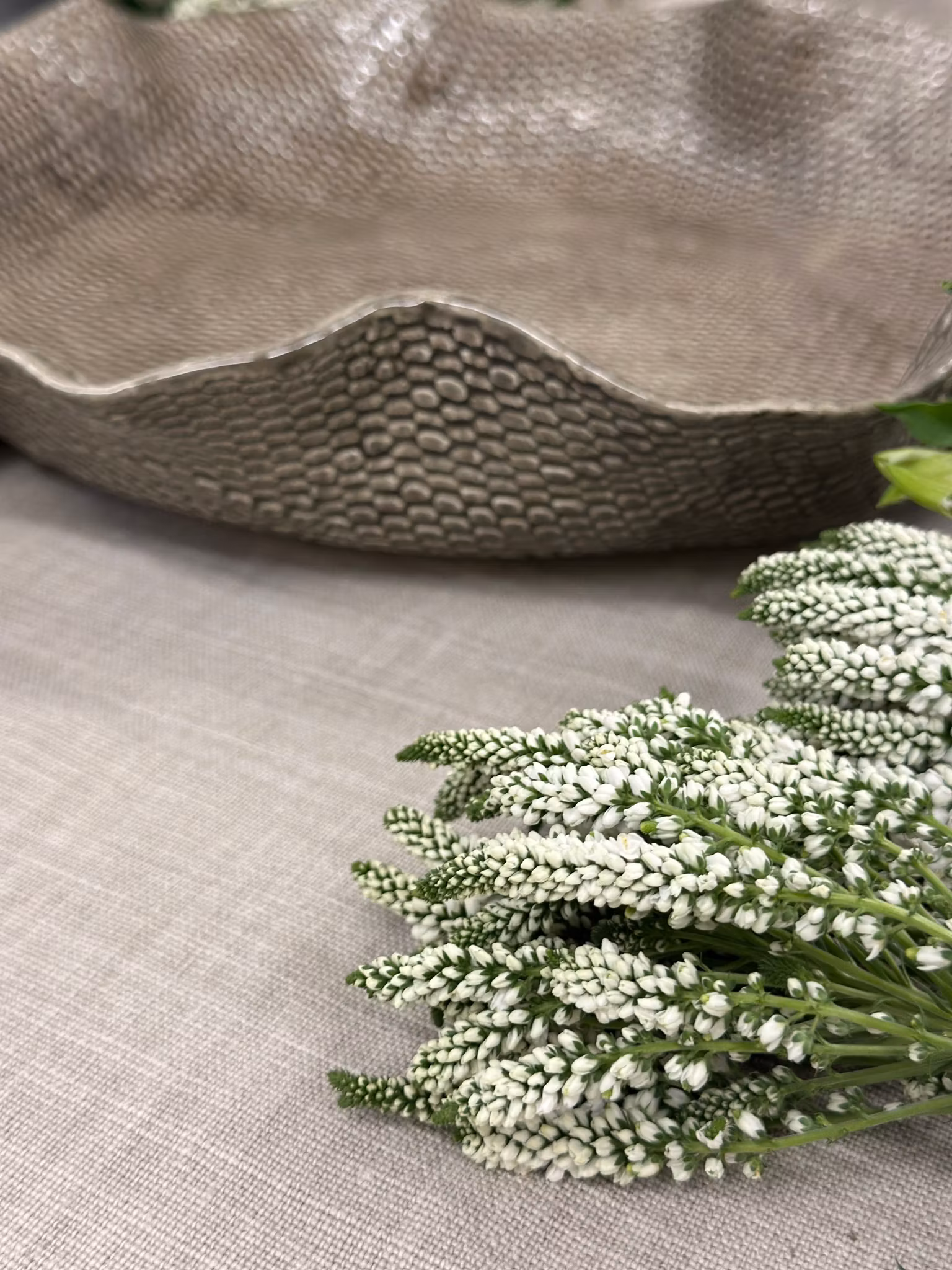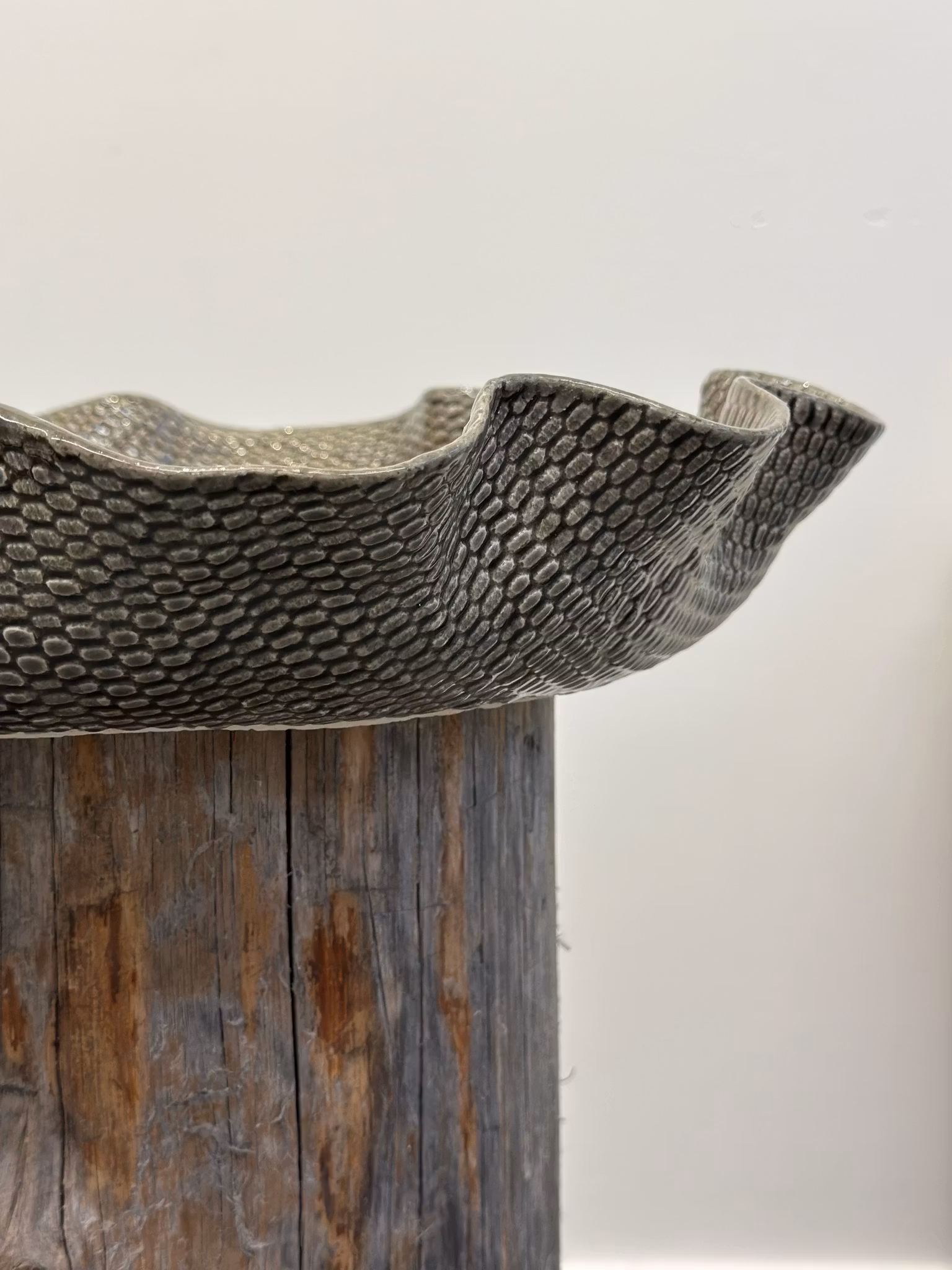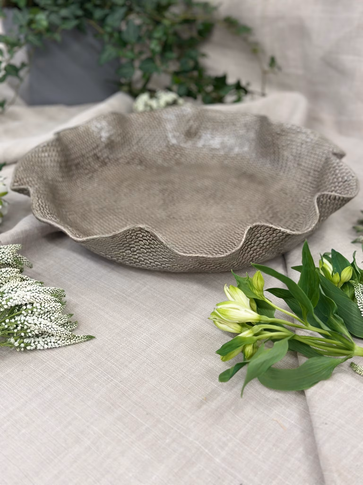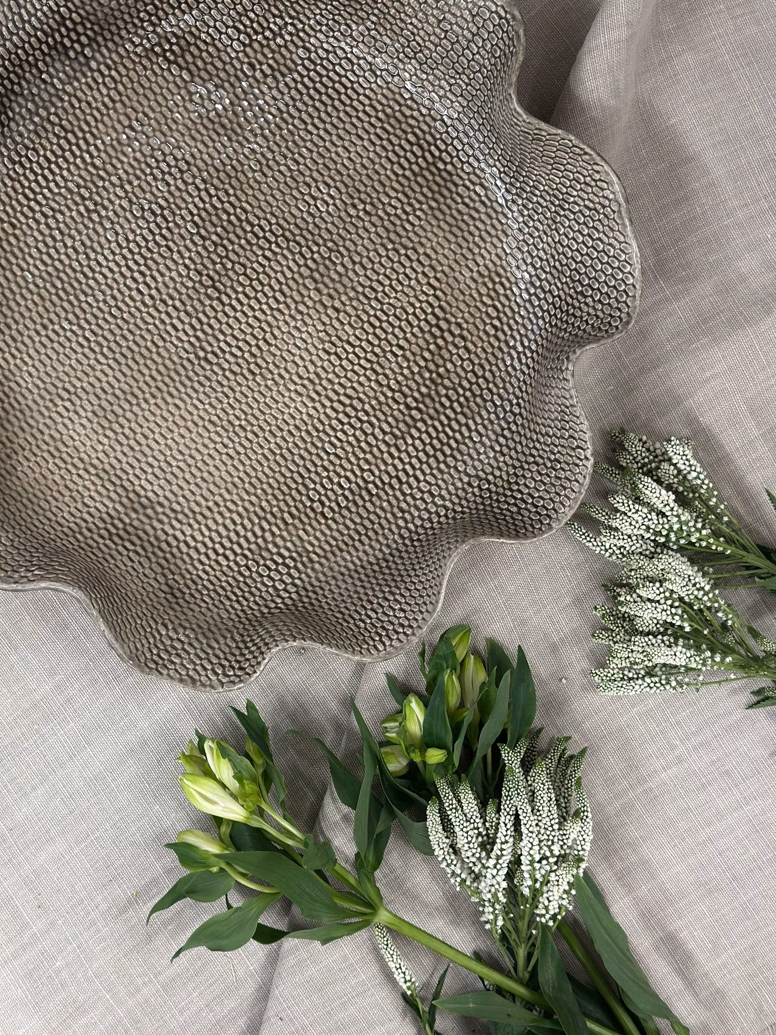 Stort lekkert fat i smoke hvor jeg har brukt en helt ny hekleduk. Her var jeg opptatt av strukturen som er så fin og enkel og litt annerledes enn vanlig hekleduker som alltid viser en form av noe. Dette fatet er på en måte litt mer abstrakt, men gammelt norsk håndtverk er benyttet og vist på en ny måte. Ganske lekkert spør du meg